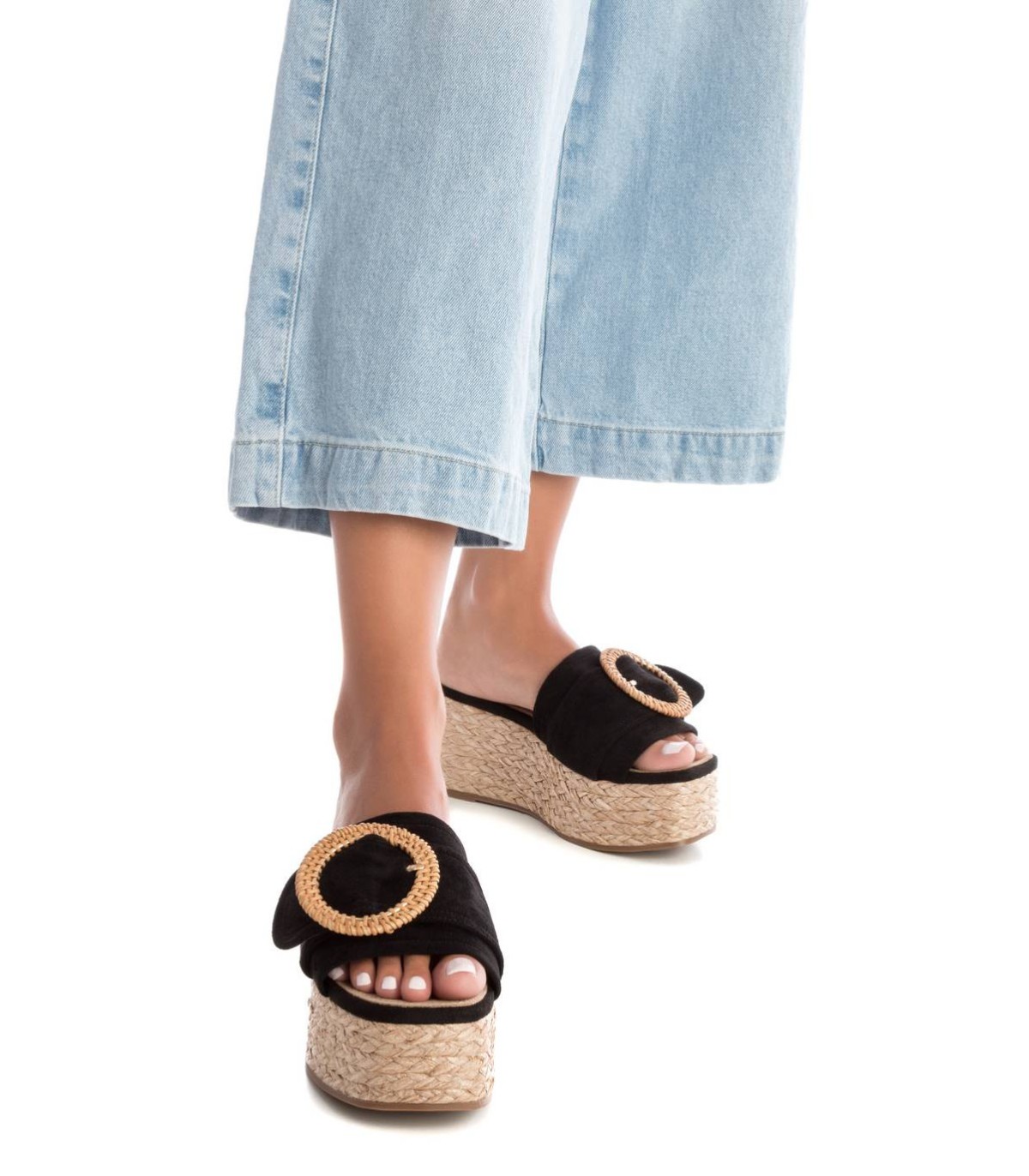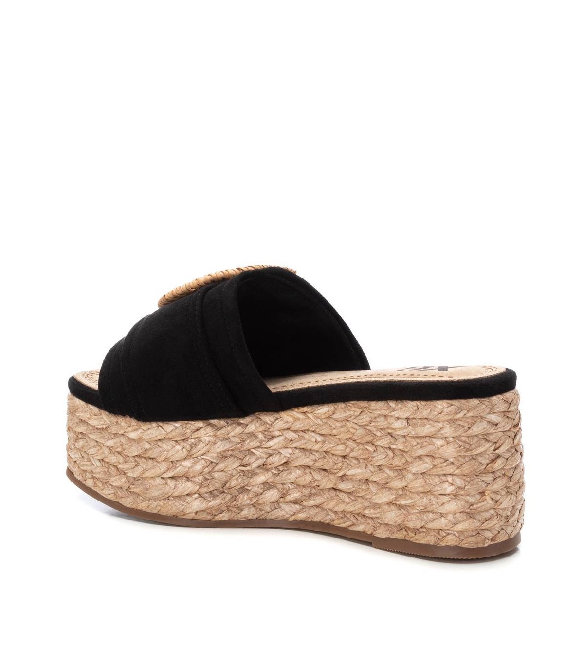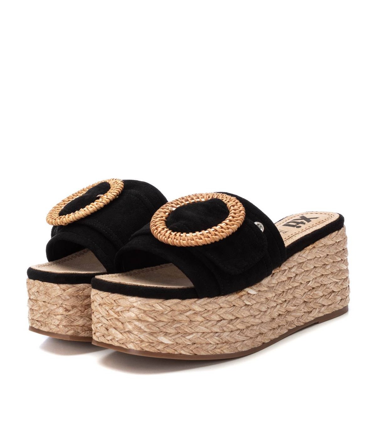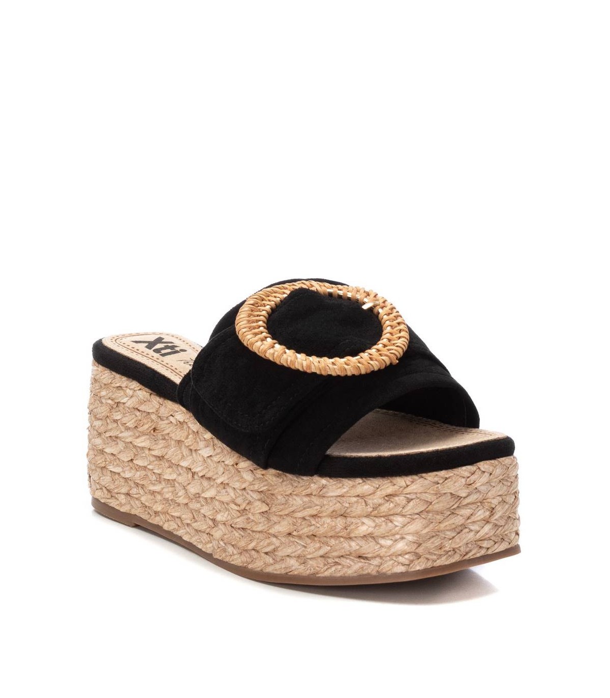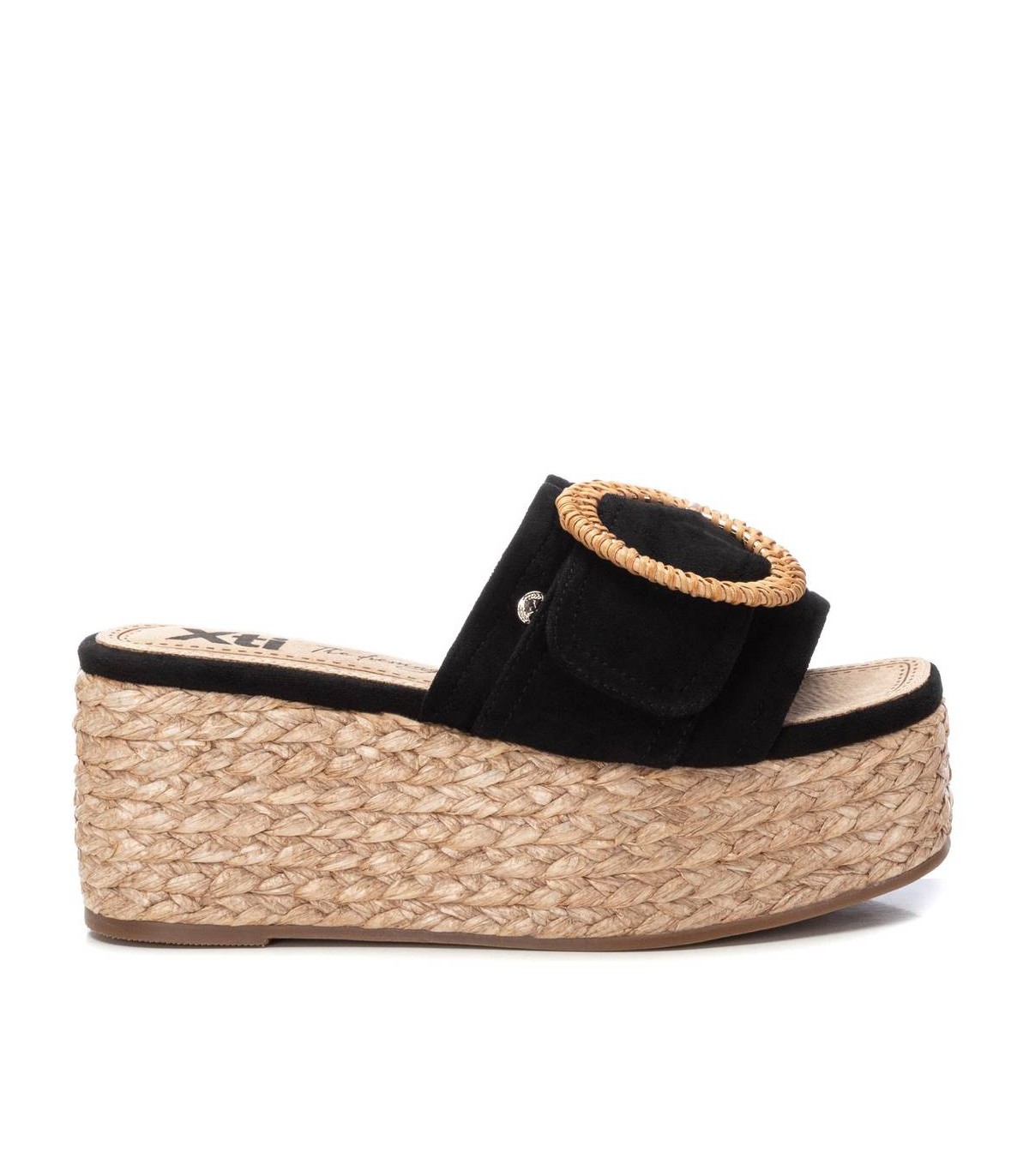 Sandalia de mujer de la marca Xti. Fabricada en material de antelina. Diseño de pala con hebilla decorativa, color natural. Cuña de 6 cm de yute con plataforma delantera. Suela de goma antideslizante. Este modelo ha obtenido el certificado vegano por la organización mundial PETA (Organización de los derechos de los animales).