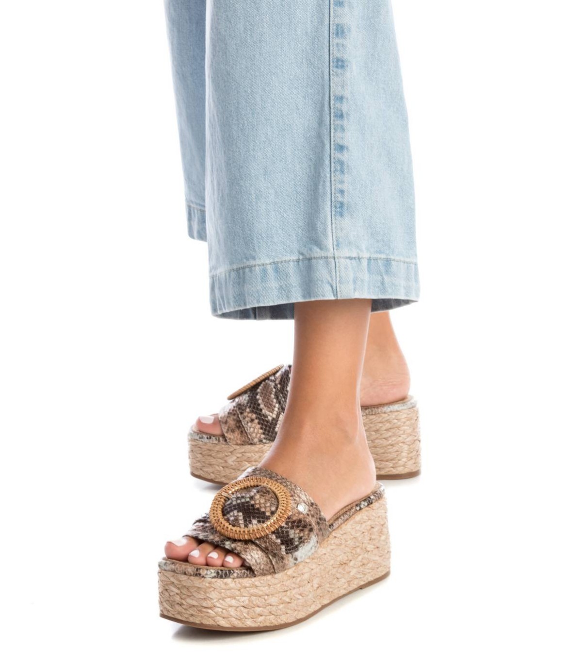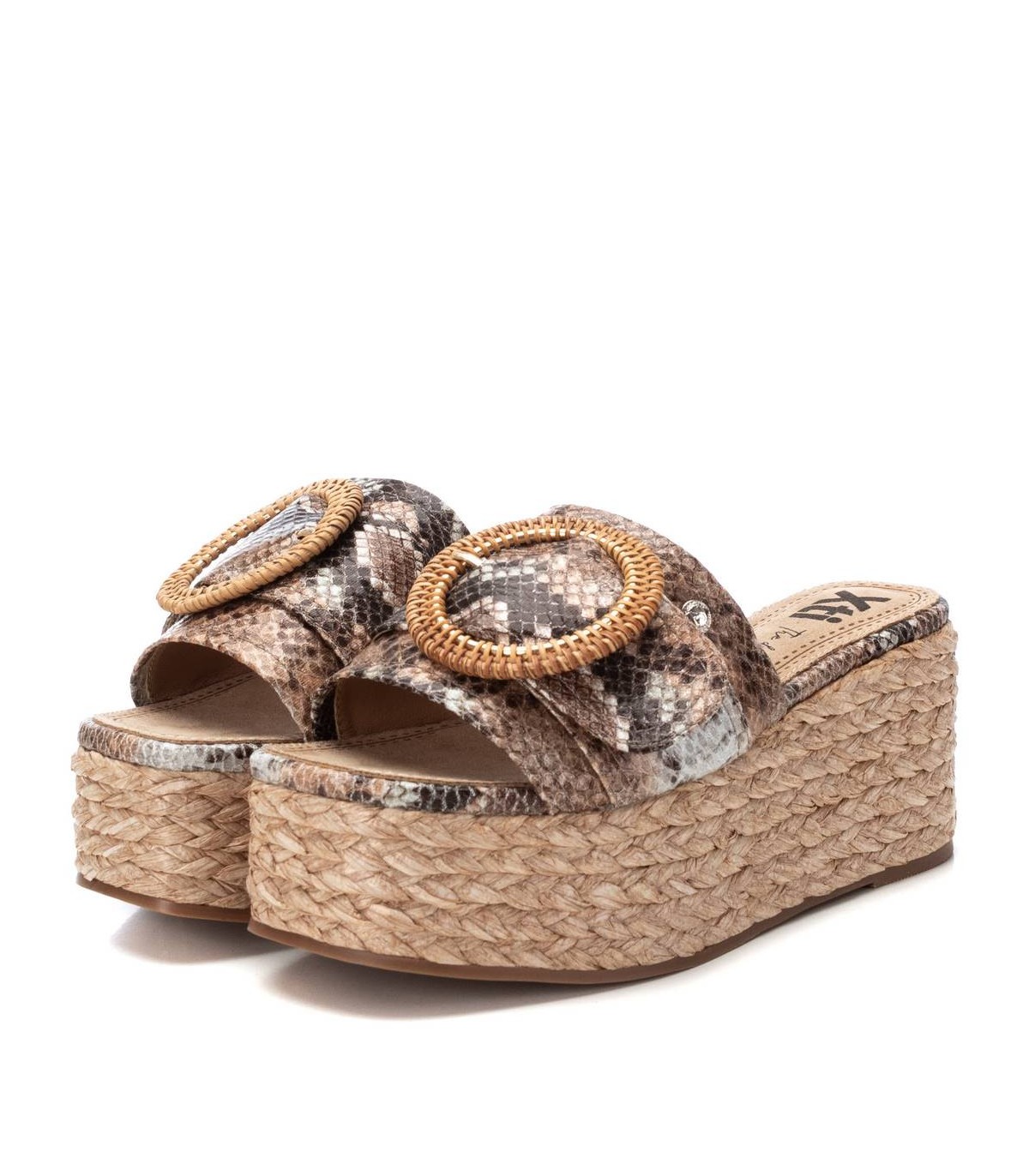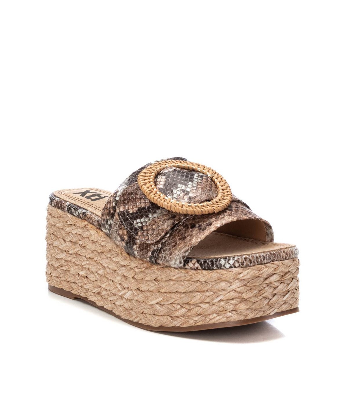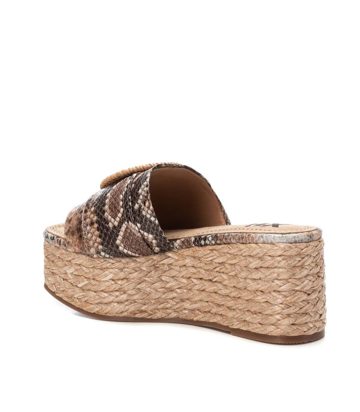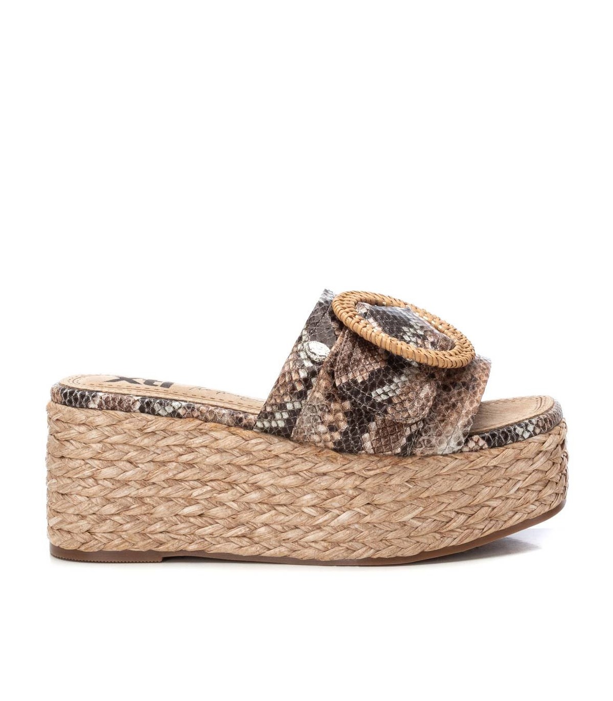 Sandalia con plataforma, de la marca Xti. Fabricada en imitación piel serpiente. Diseño de pala ancha con hebilla. Plataforma de yute y suela de goma antideslizante. Combinala con tus looks de esta temporada. Este modelo ha obtenido el certificado vegano por la organización mundial PETA (Organización de los derechos de los animales).