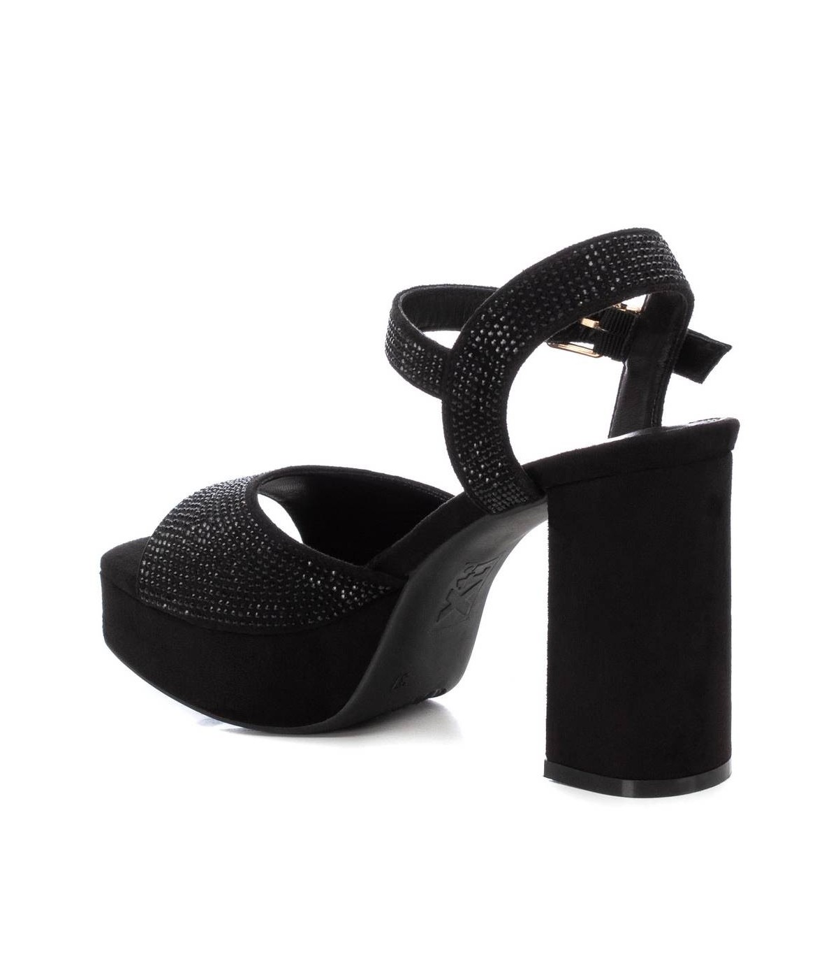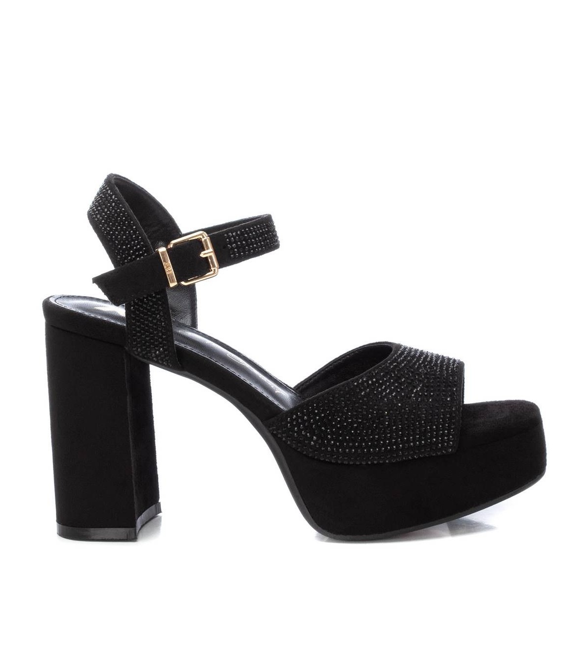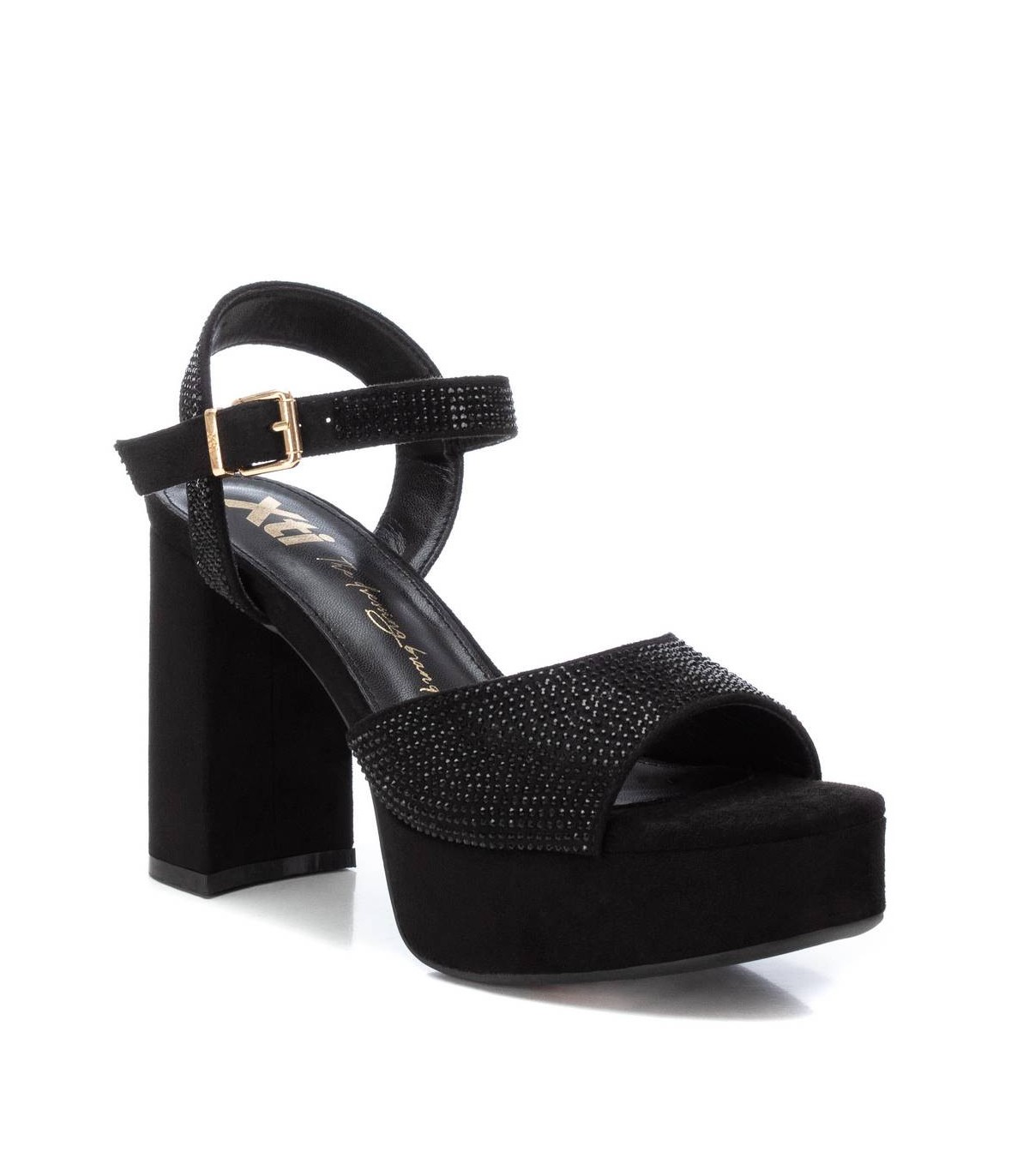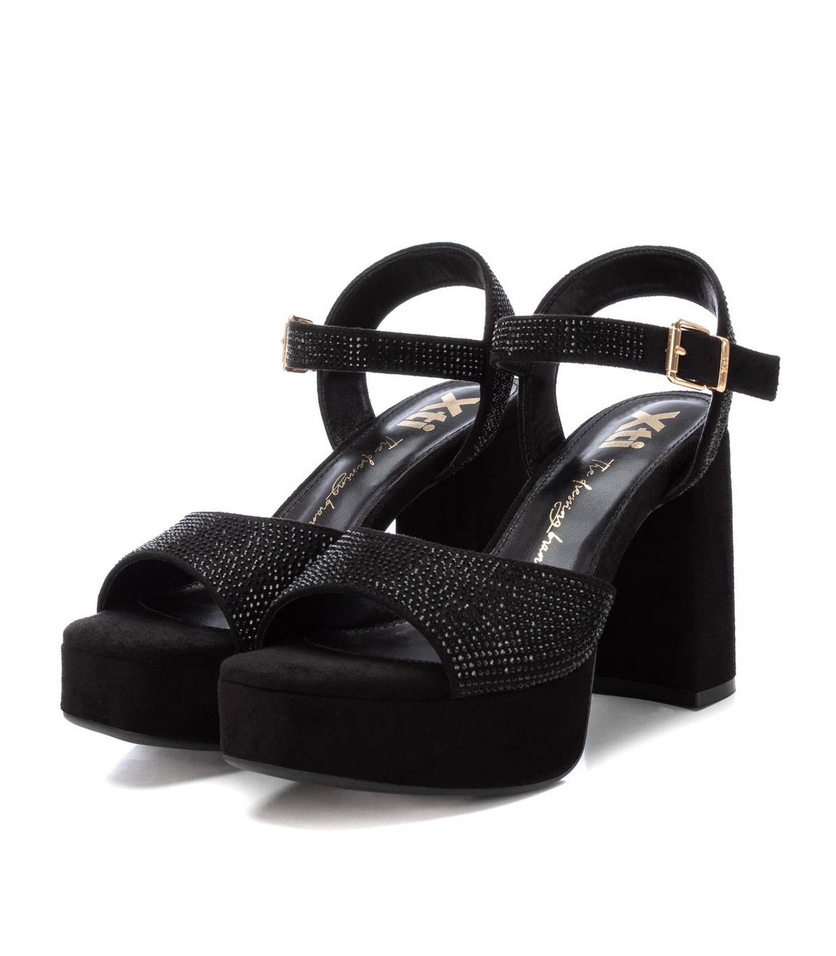 Sandalia de mujer, de la marca Xti. Fabricada en material de antelina con detalles de piedras. Pulsera al tobillo con hebilla regulable. Tacón ancho de 9 cm con plataforma delantera y suela antideslizante. Este modelo ha obtenido el certificado vegano por la organización mundial PETA (Organización de los derechos de los animales).