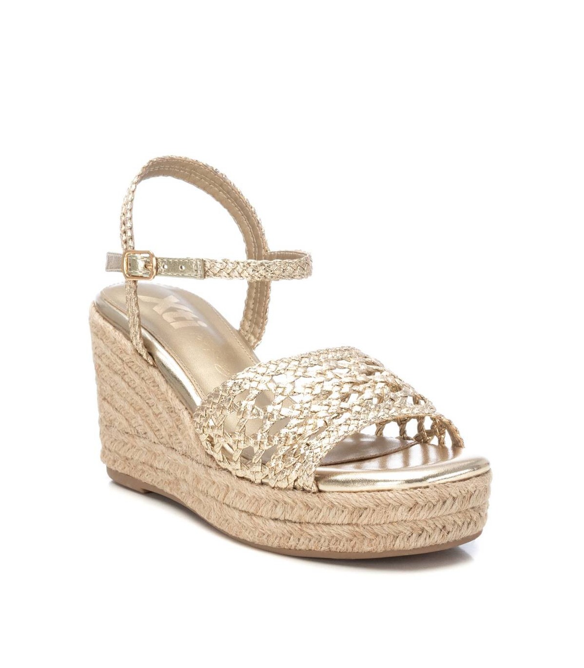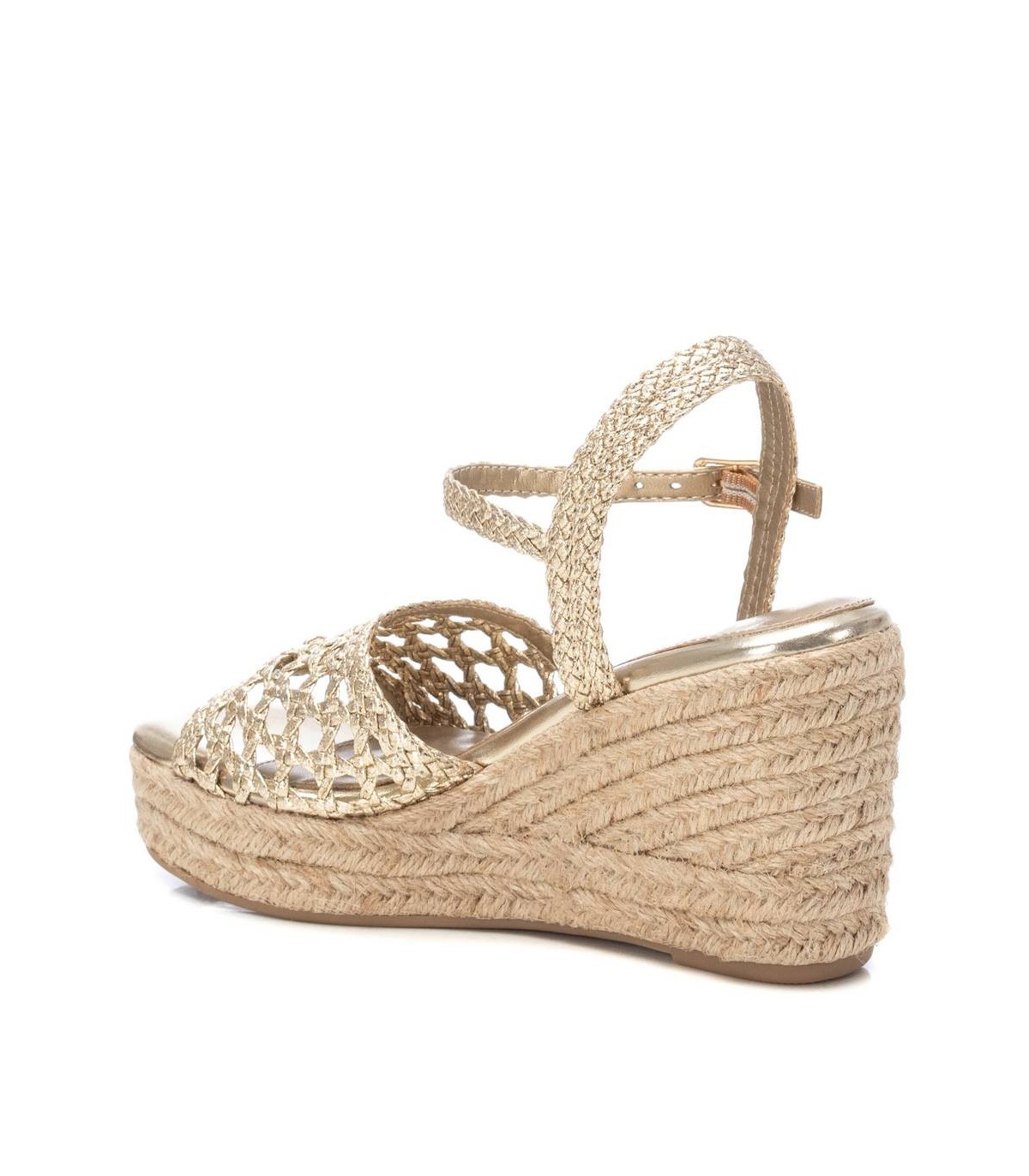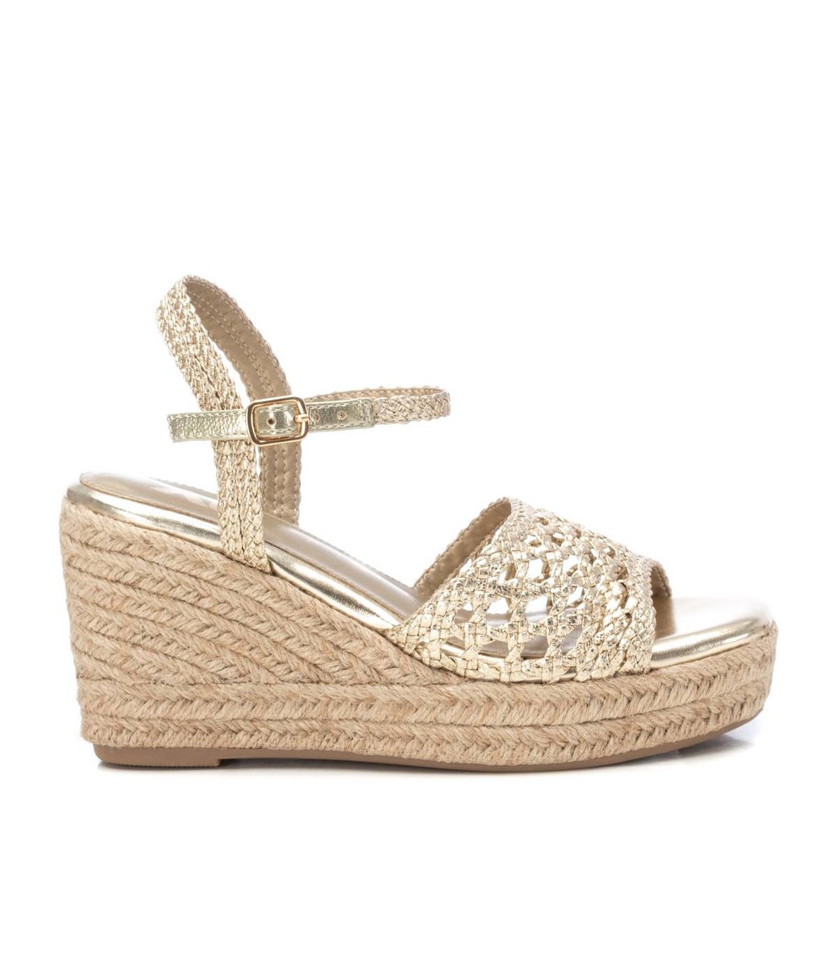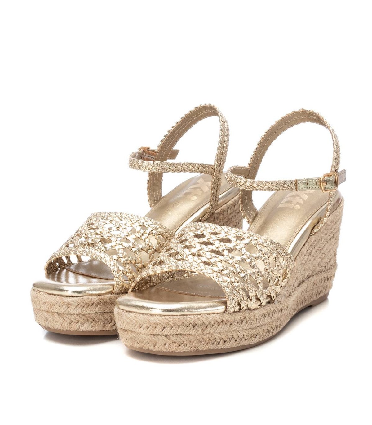 Sandalia de mujer, de la marca Xti. Fabricada en material que imita la piel con acabado metalizado. Cierre mediante hebilla. Cuña de 8 cm con plataforma delantera de yute y suela de goma antideslizante. Un modelo que será el centro de tus mejores looks. Este modelo ha obtenido el certificado vegano por la organización mundial PETA (Organización de los derechos de los animales).