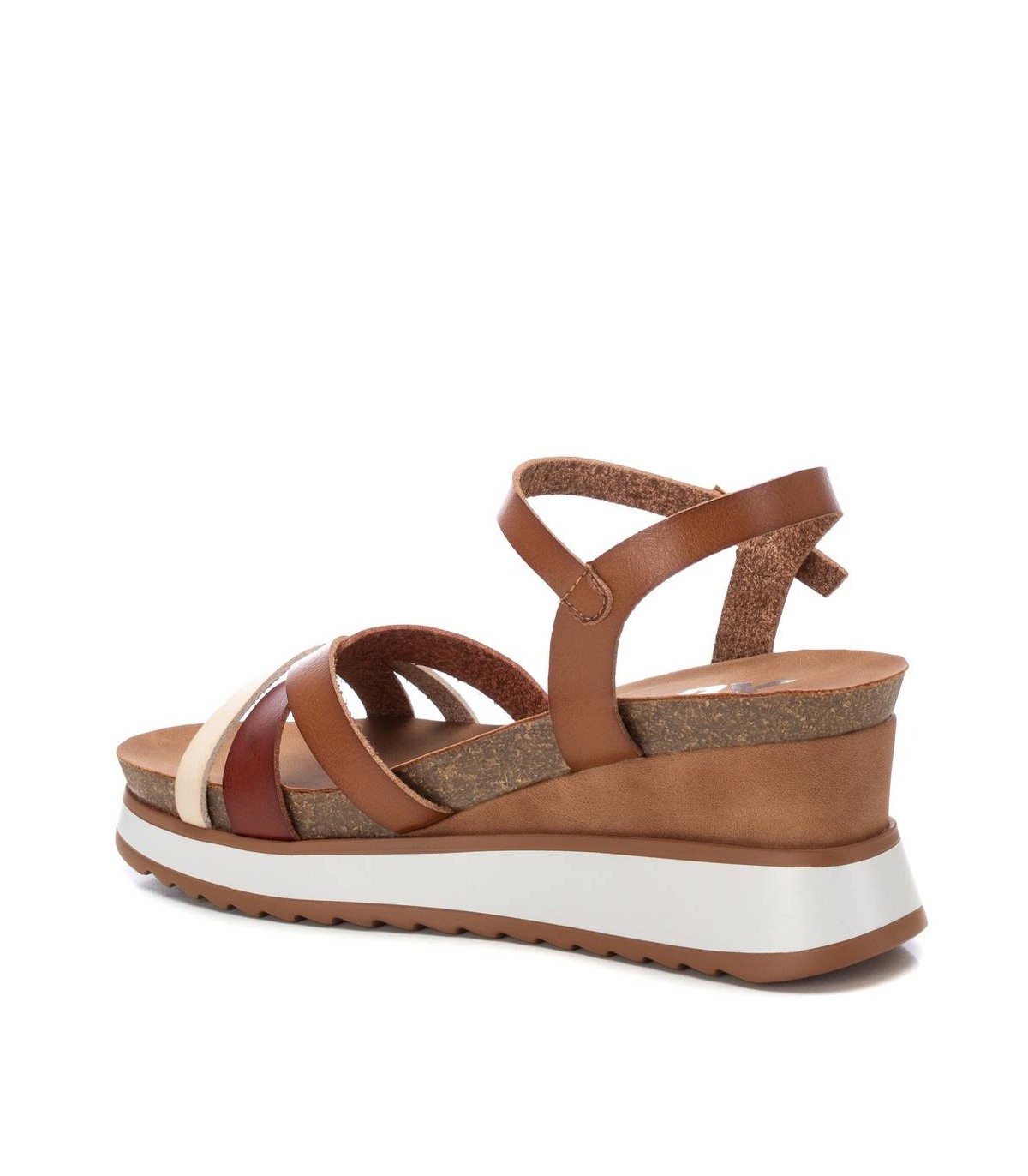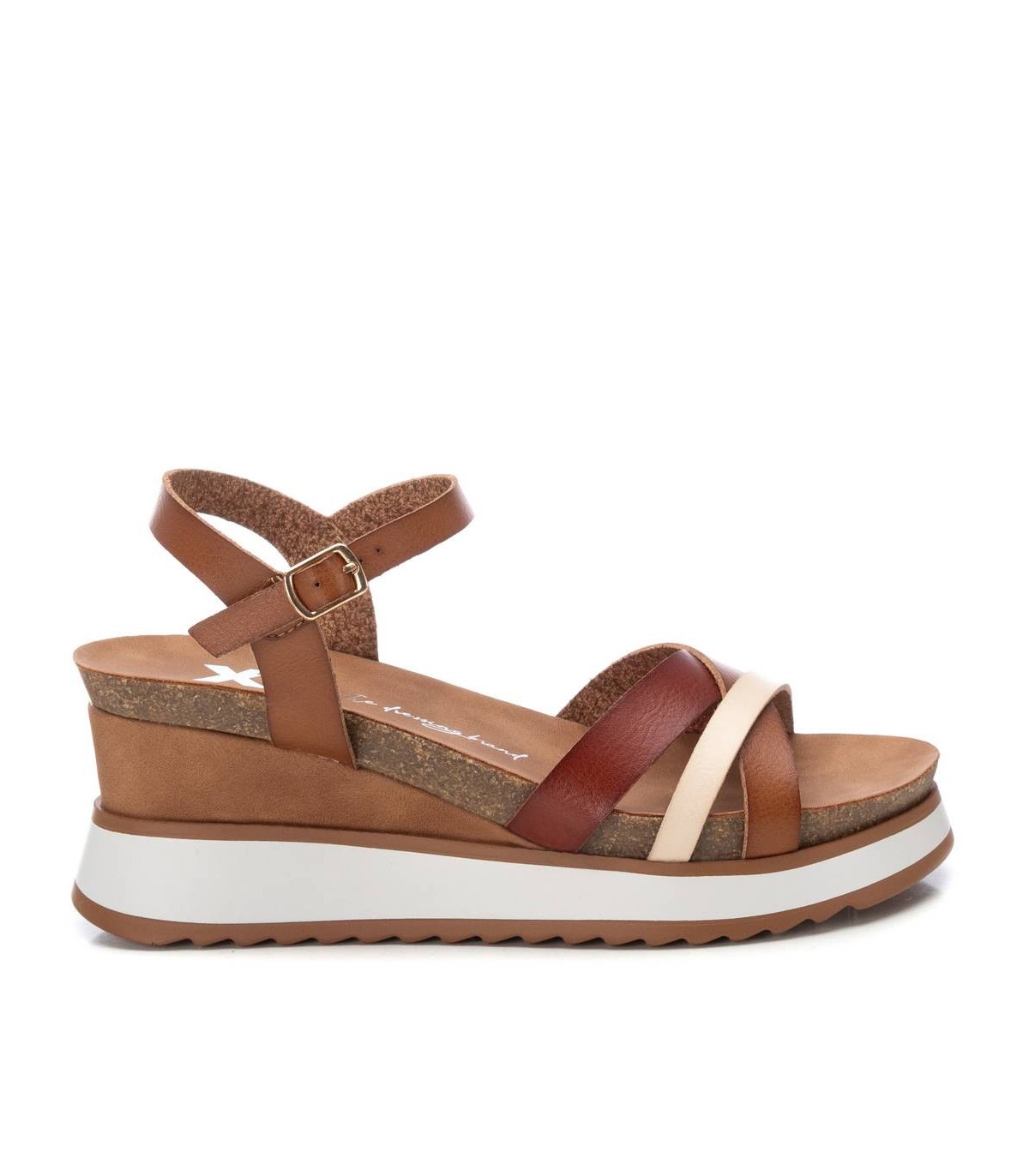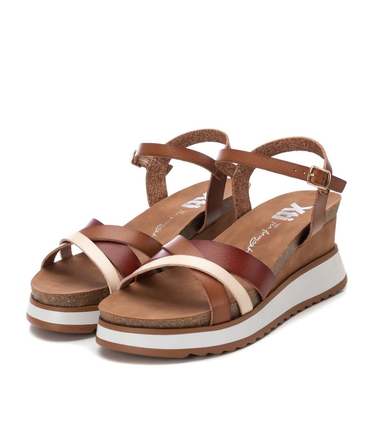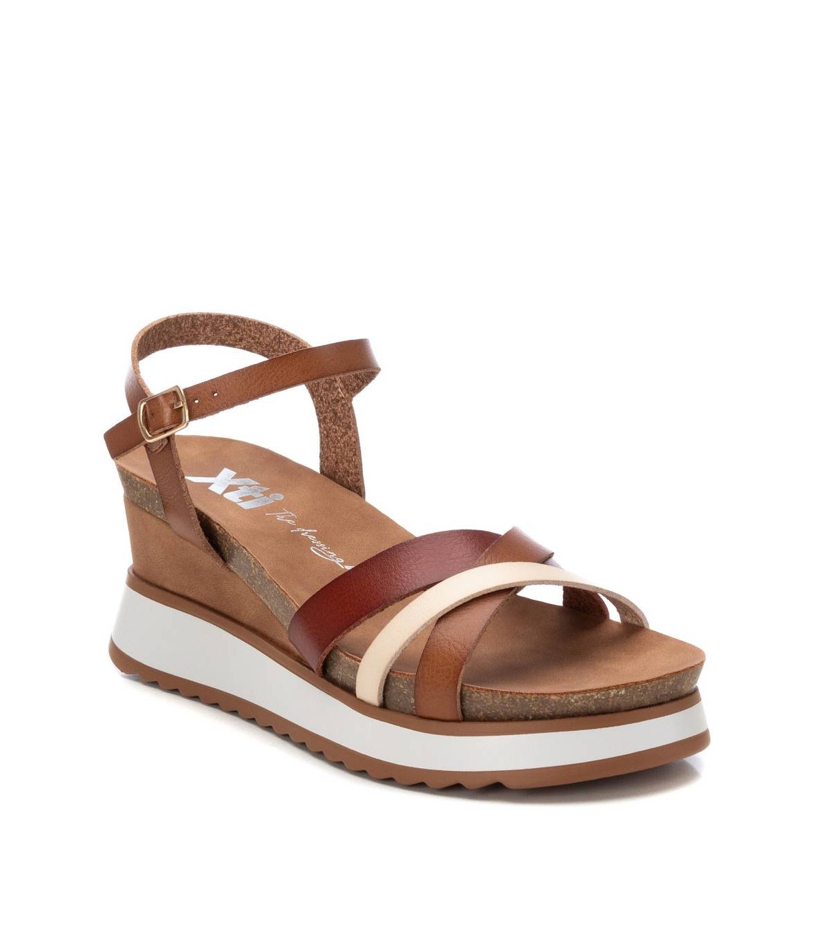 Sandalia de mujer, de la marca Xti. Diseño de tiras cruzadas con combinación de materiales que imitan la piel. Cierre mediante hebilla metálica. Planta bios. Cuña de 6 cm con suela antideslizante. Este modelo ha obtenido el certificado vegano por la organización mundial PETA (Organización de los derechos de los animales).