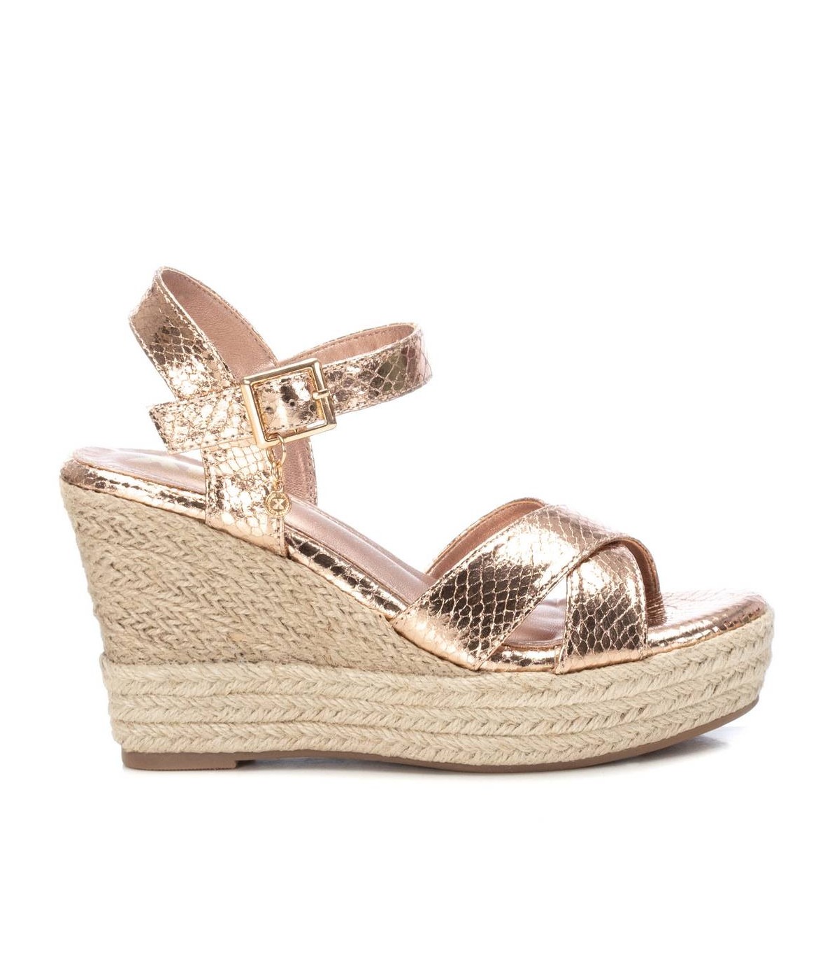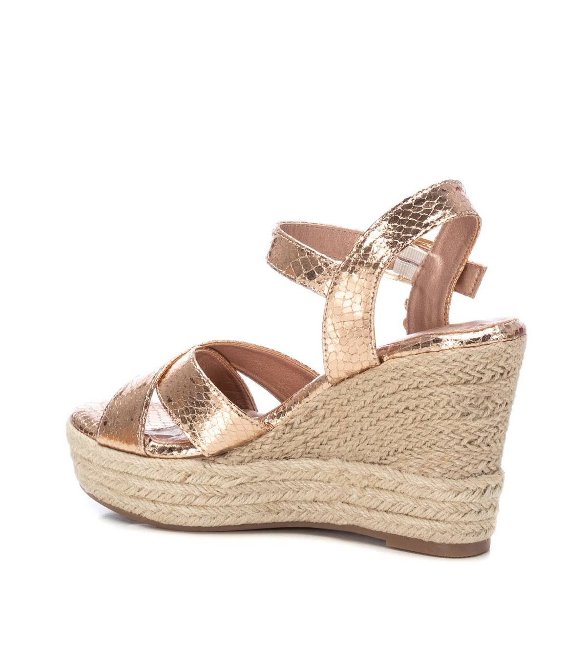 Sandalia de mujer, de la marca Xti. Fabricada en material que imita la piel con grabado piel de serpiente. Con hebilla para ajustar el tobillo. Cómoda planta con cuña forrada en tiras de yute trenzado. Este modelo ha obtenido el certificado vegano por la organización mundial PETA (Organización de los derechos de los animales).
