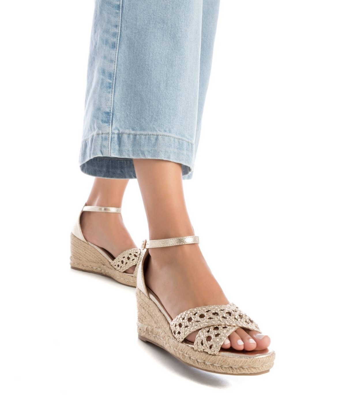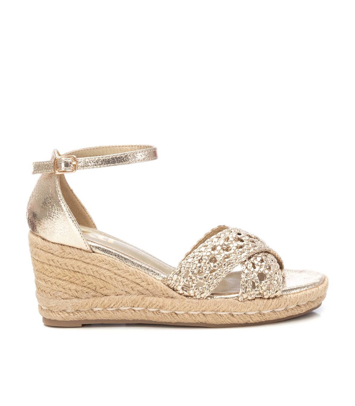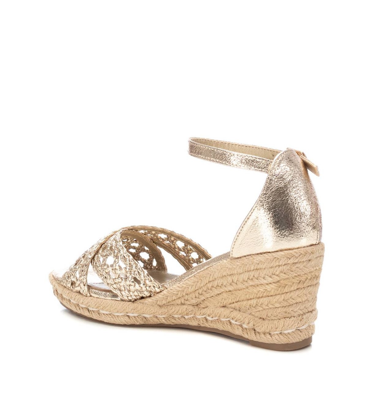 Sandalia de mujer, de la marca Xti. Fabricada en material que imita la piel con acabado metalizado. Diseño de pala cruzada y pulsera en el tobillo con hebilla metálica. Suela antideslizante. Cuña 8 cm. Este modelo ha obtenido el certificado vegano por la organización mundial PETA (Organización de los derechos de los animales).