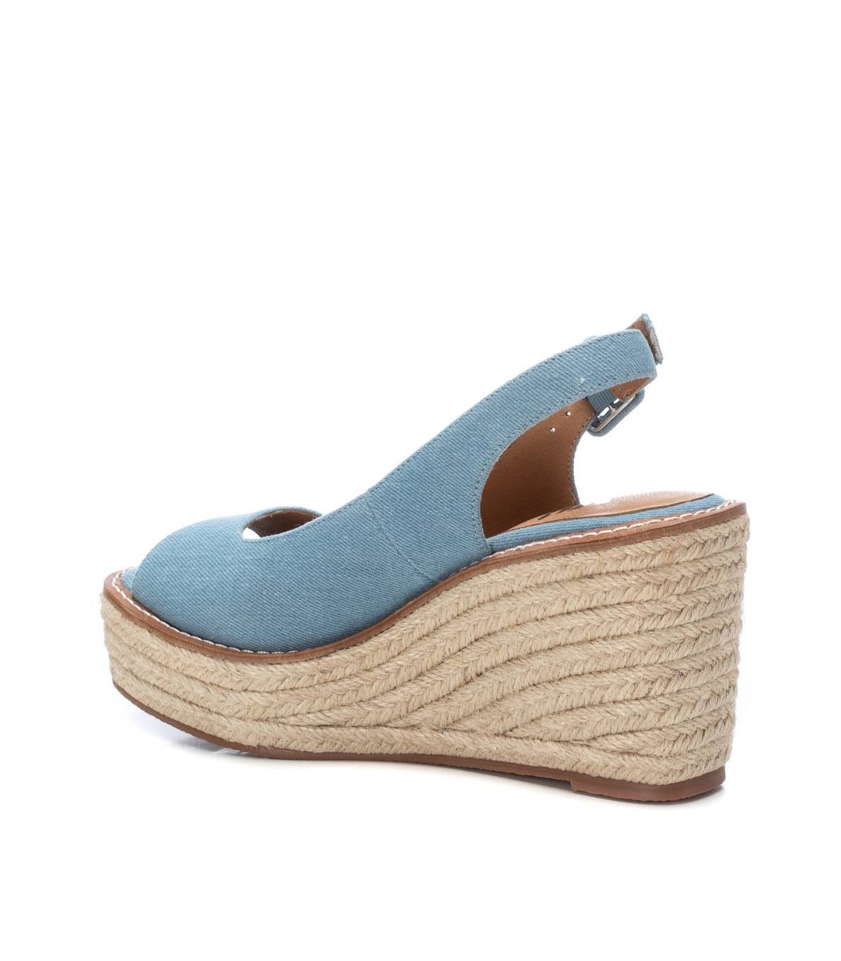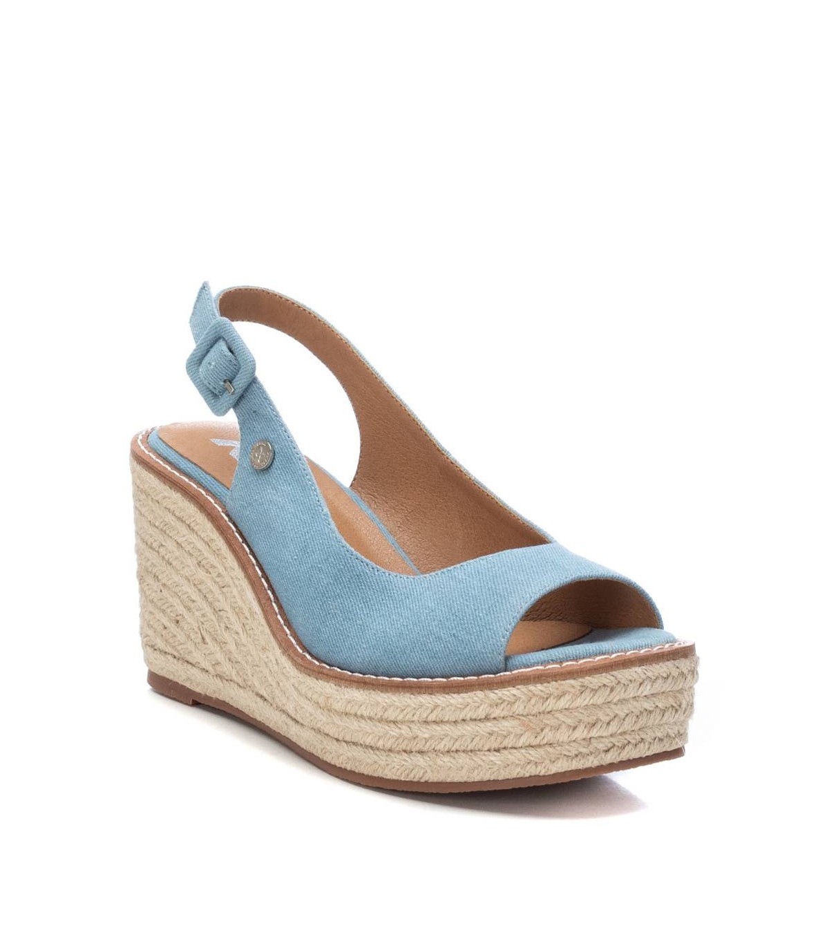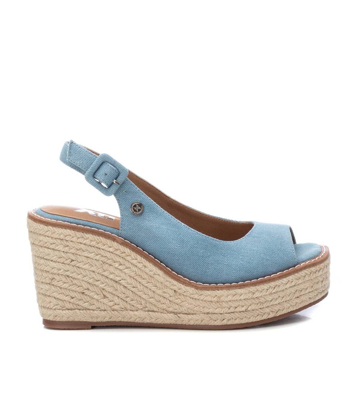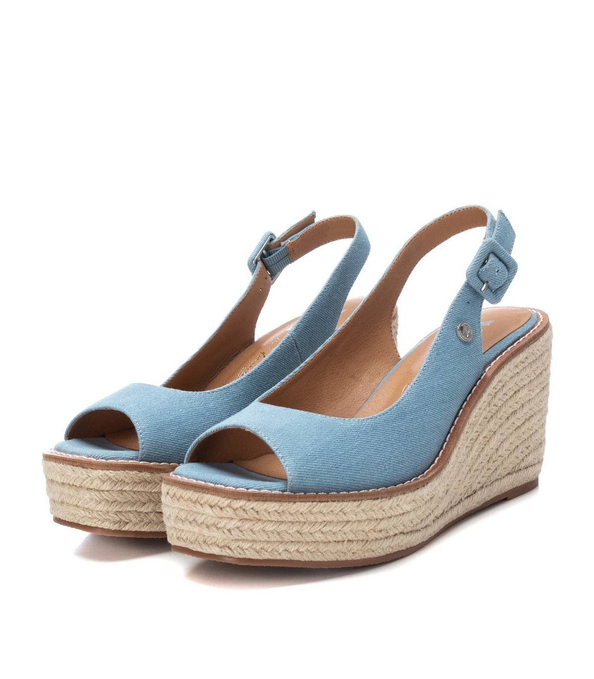 Sandalia de mujer, de la marca Xti. Fabricada en material textil denim. Modelo estilo alpargata destalonado con hebilla. Cuña de yute de 9 cm con suela antideslizante. Este modelo ha obtenido el certificado vegano por la organización mundial PETA (Organización de los derechos de los animales).