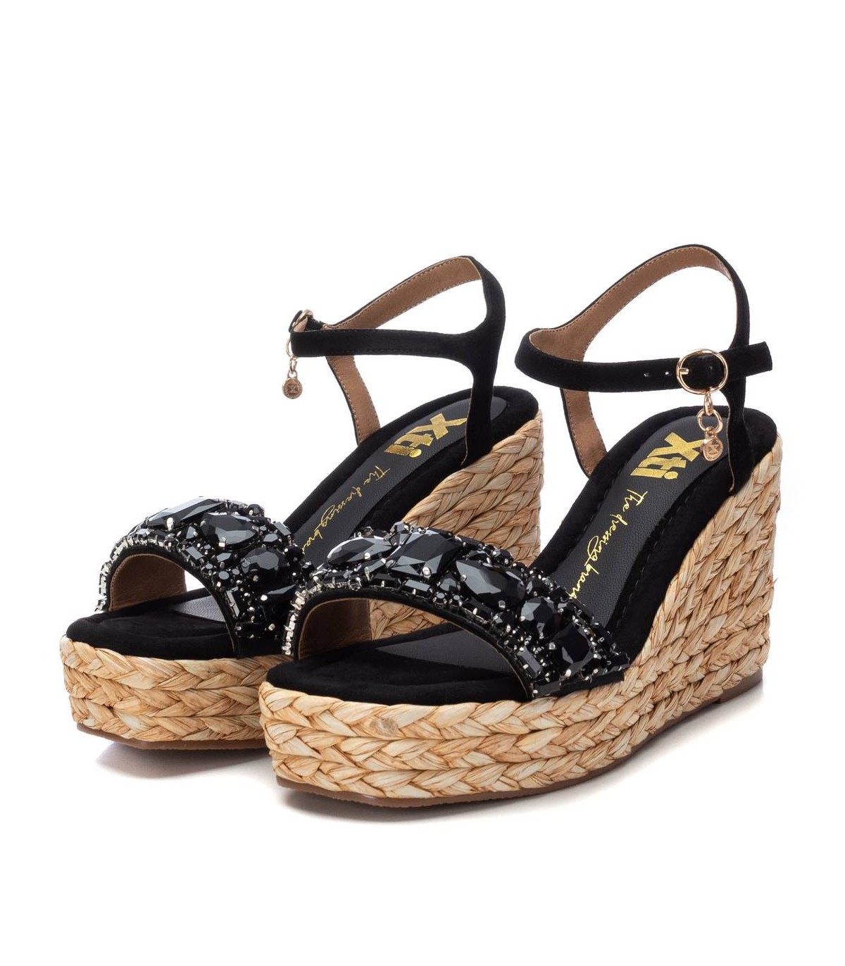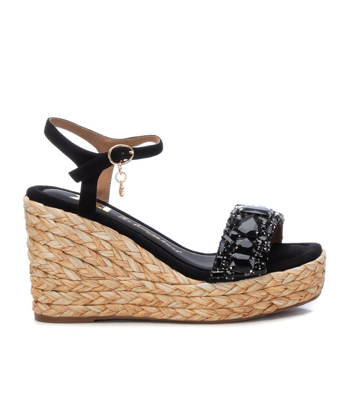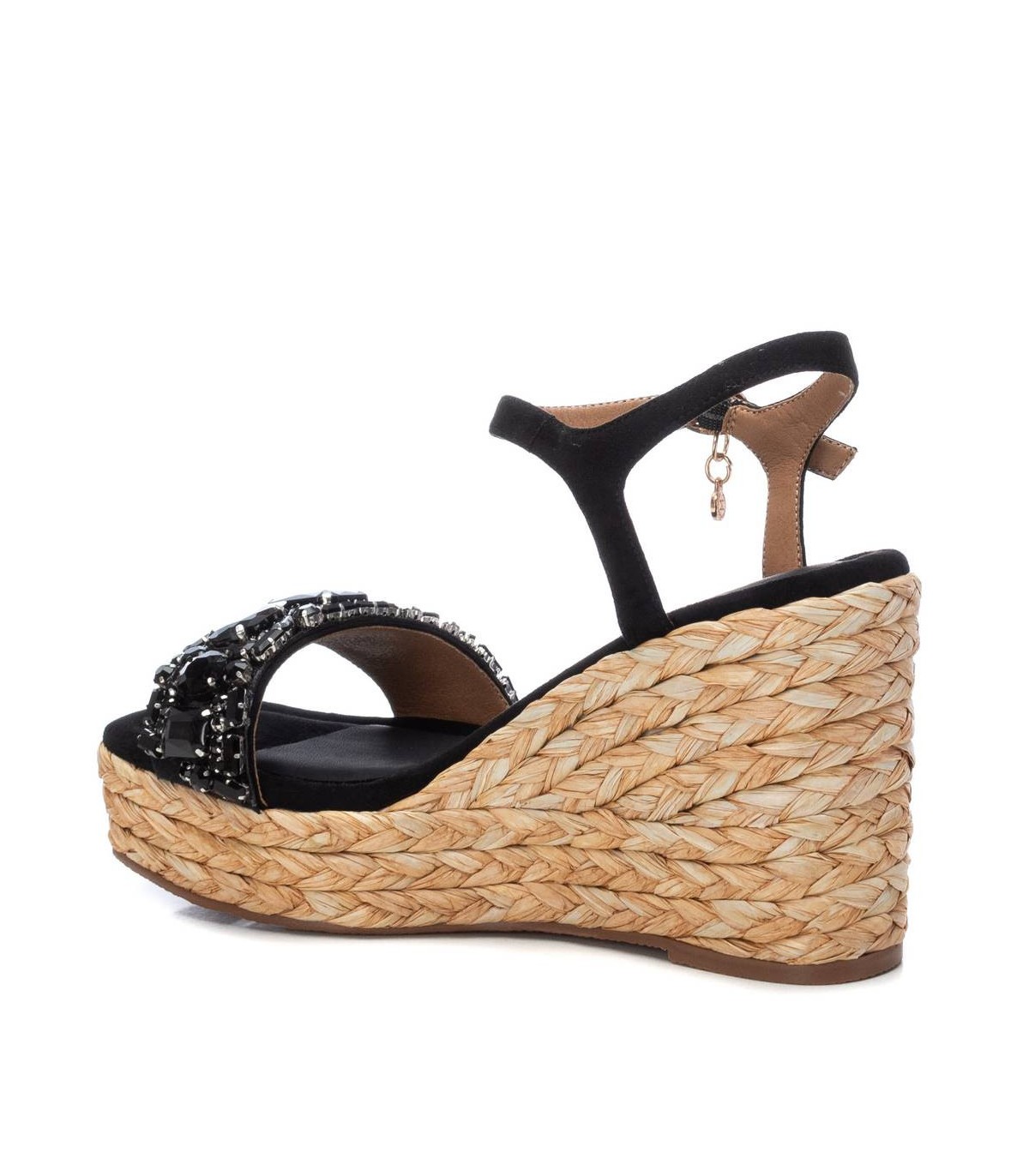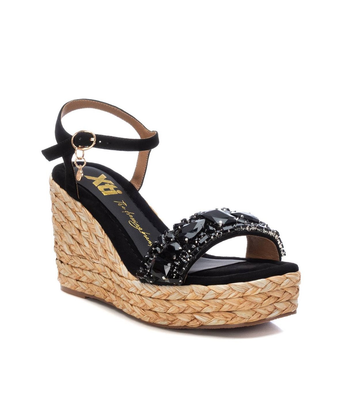 Sandalia de mujer de la marca Xti. Fabricada en antelina con piedras y piedras decorativas. Modelo de pala con correa al tobillo con hebilla para un buen ajuste. Cuña de 9 cm con plataforma delantera forrada en yute al tono del corte. Suela antideslizante. Este modelo ha obtenido el certificado vegano por la organización mundial PETA (Organización de los derechos de los animales).