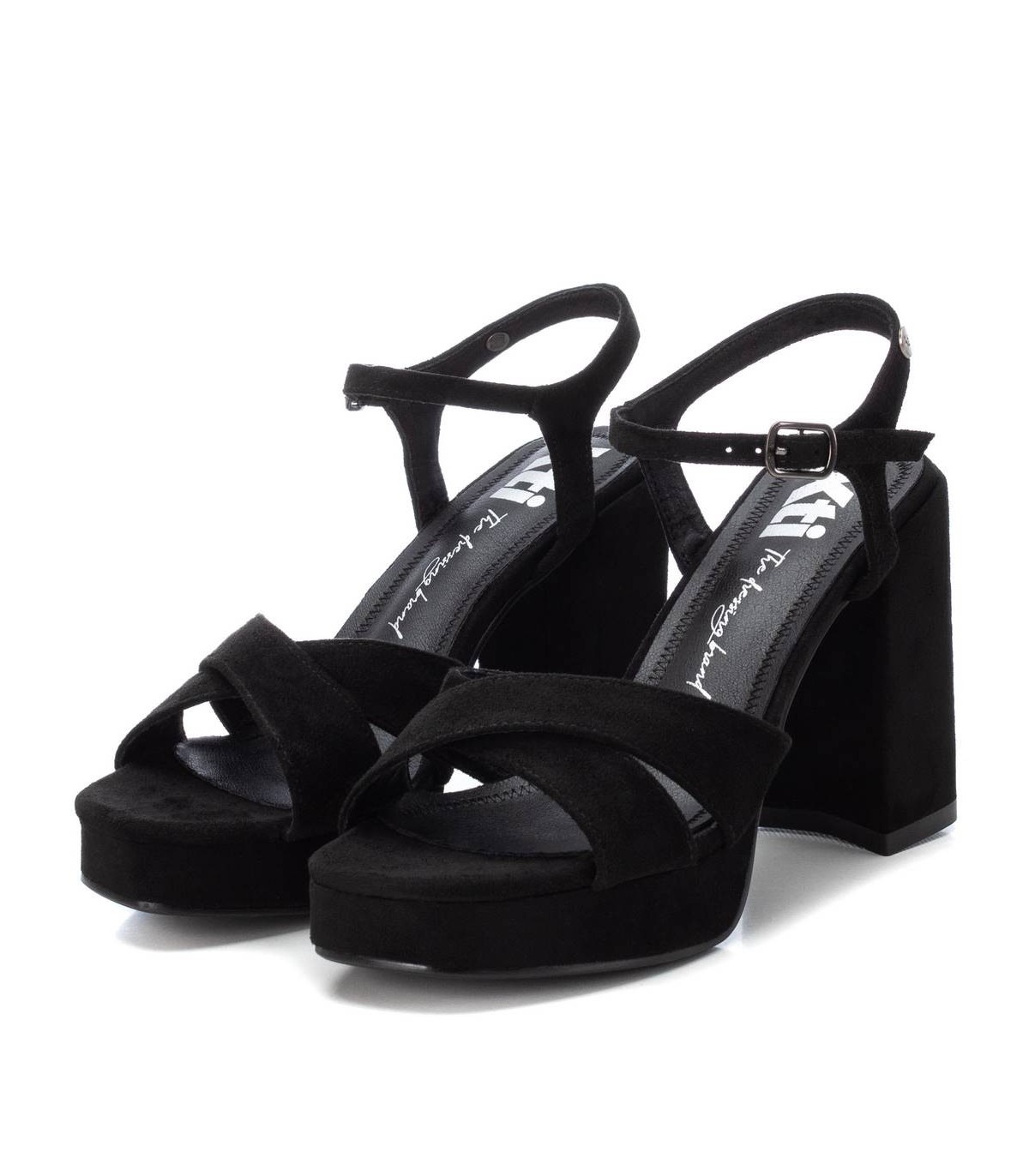 Sandalia de mujer, de la marca Xti. Fabricada en material que imita la piel con acabado metalizado. Pala cruzada con pulsera al tobillo con hebilla. Tacón ancho de 9 cm con plataforma delantera. Suela de goma antideslizante. Este modelo ha obtenido el certificado vegano por la organización mundial PETA (Organización de los derechos de los animales).