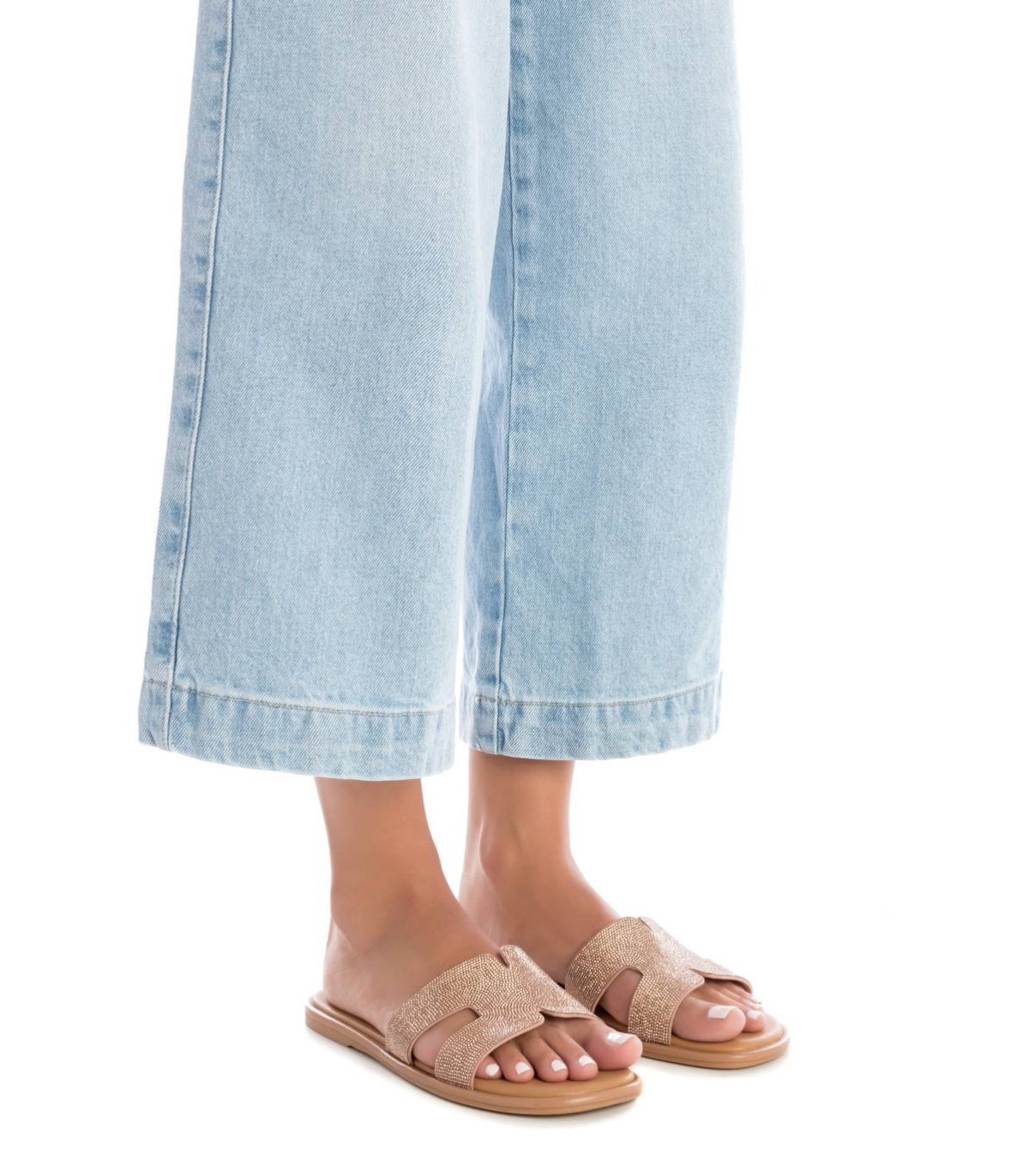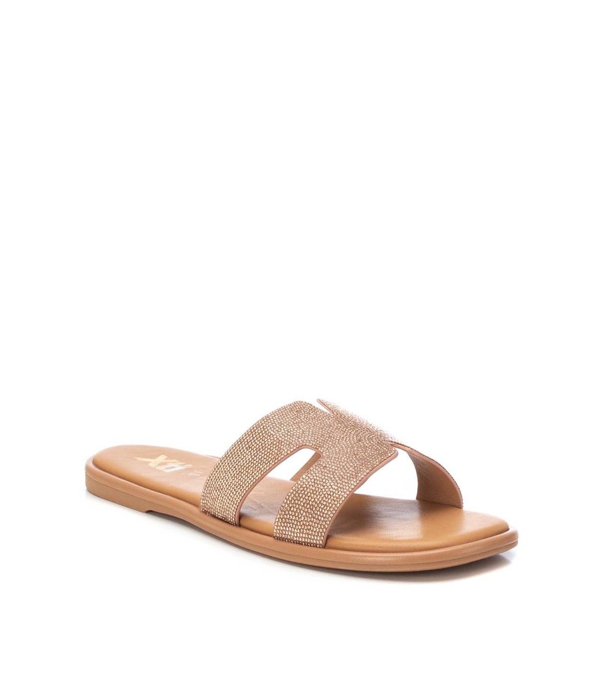 Sandalia de mujer, de la marca Xti. Fabricada en antelina con detalles de piedras de fantasía. Suela de goma antideslizante. Este modelo ha obtenido el certificado vegano por la organización mundial PETA (Organización de los derechos de los animales).