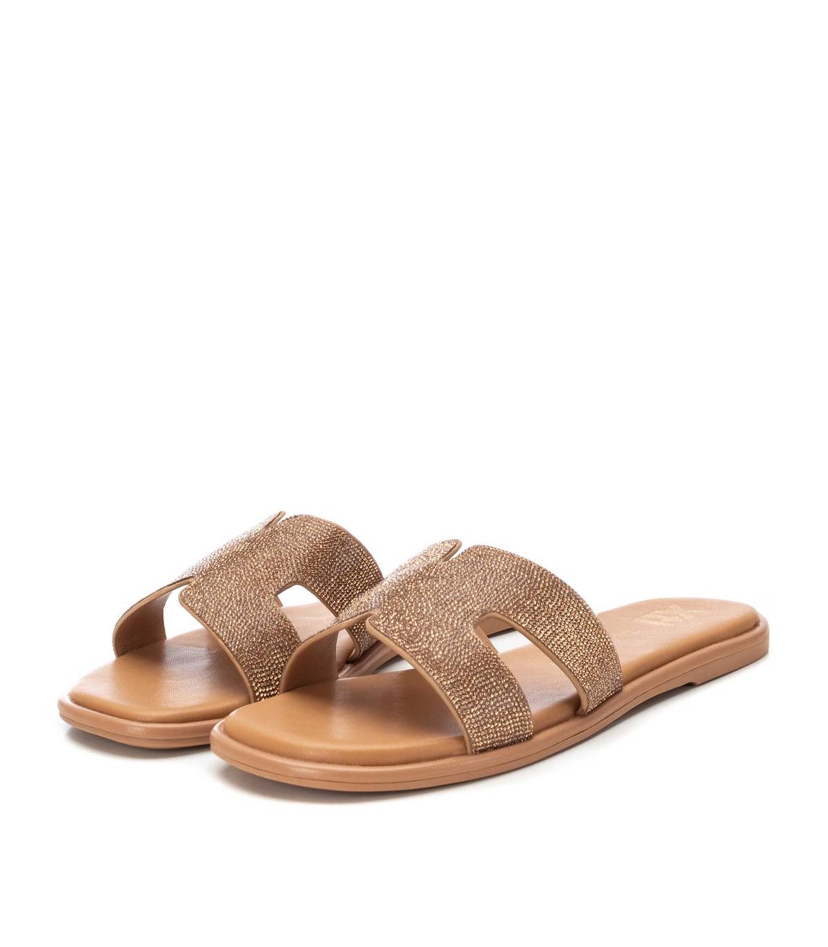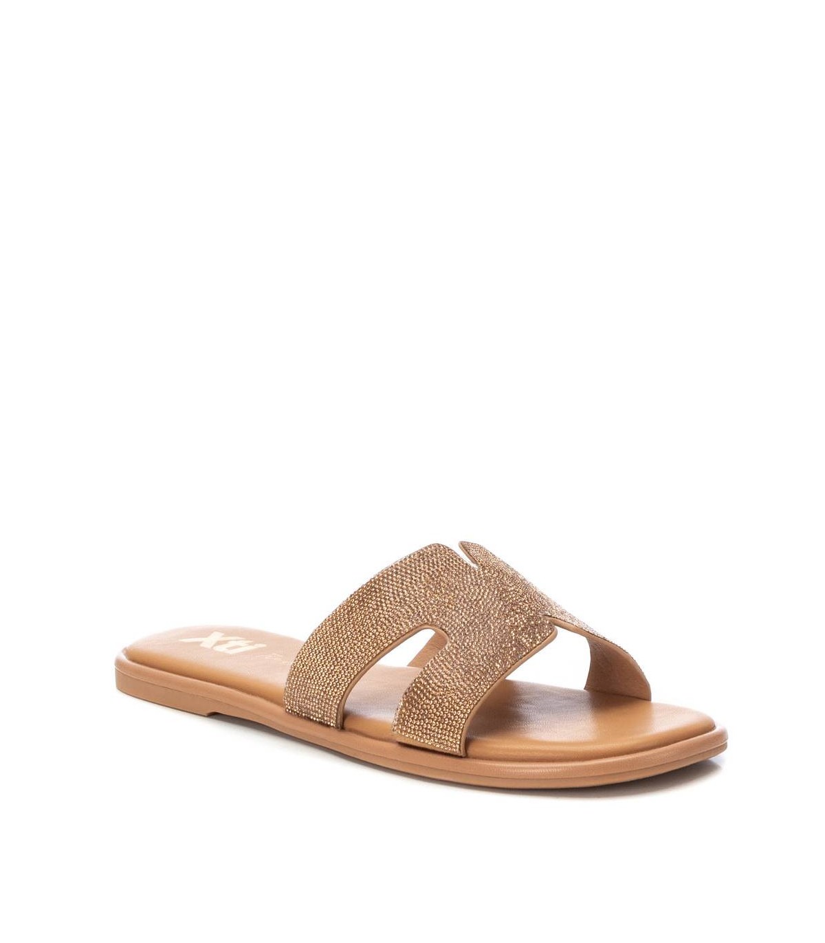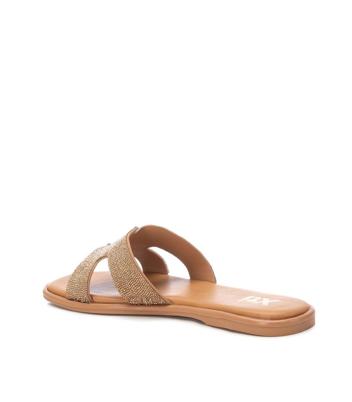 Sandalia de mujer, de la marca Xti. Fabricada en antelina con detalles de piedras de fantasía. Suela de goma antideslizante. Este modelo ha obtenido el certificado vegano por la organización mundial PETA (Organización de los derechos de los animales).