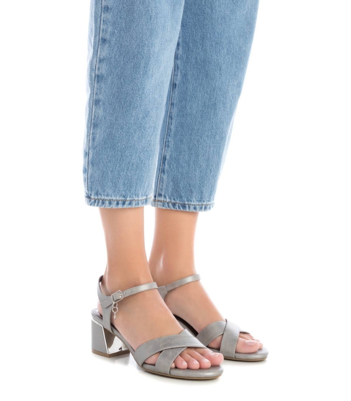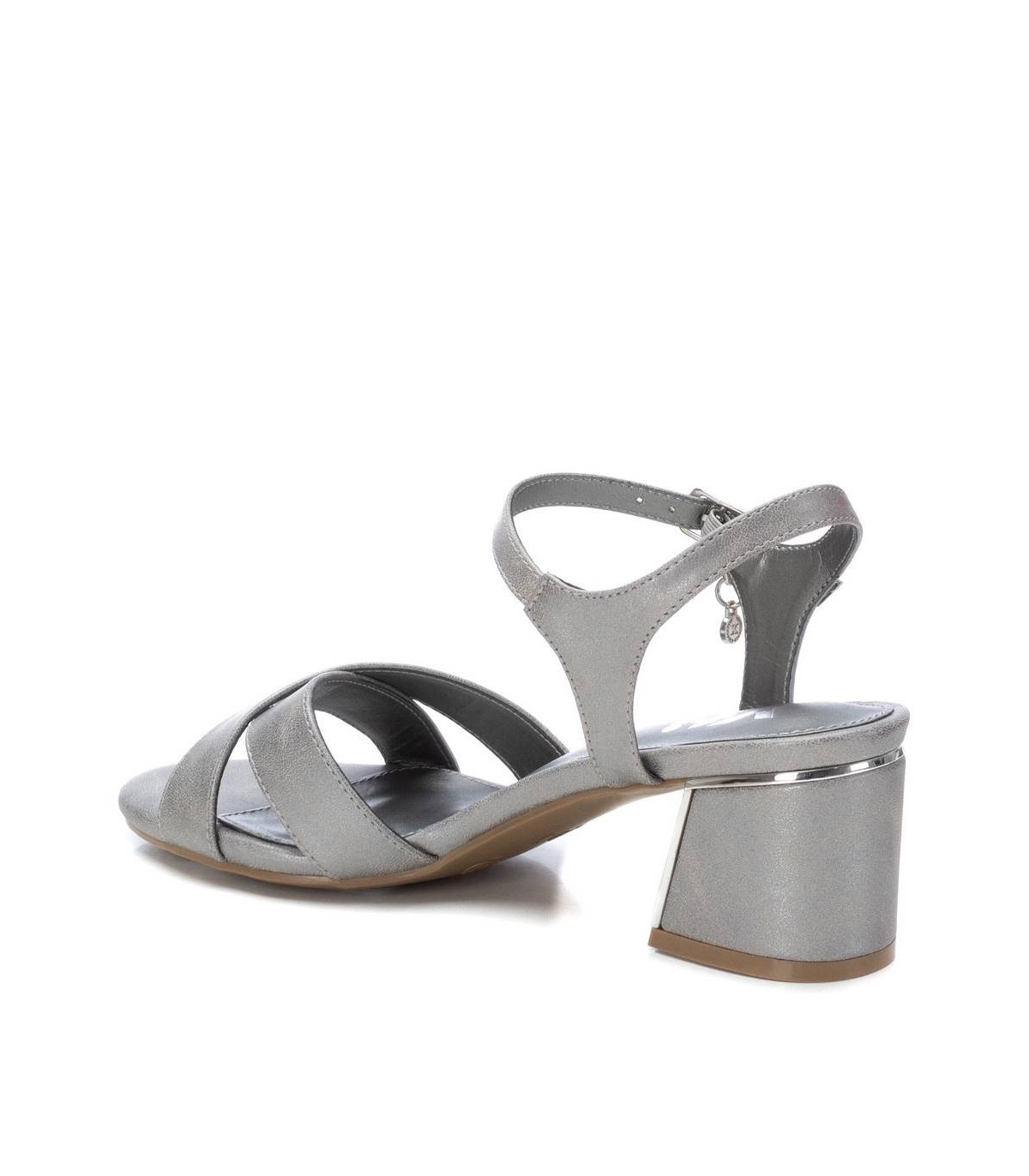 Sandalia de tacón de mujer, de la marca Xti. Fabricada en material que imita la piel con detalle de pieza metalizada en el tacón, dándole un toque especial. Cierre con hebilla en pulsera. Cómodo tacón ancho de 6 cm y suela de goma antideslizante. Este modelo ha obtenido el certificado vegano por la organización mundial PETA (Organización de los derechos de los animales).