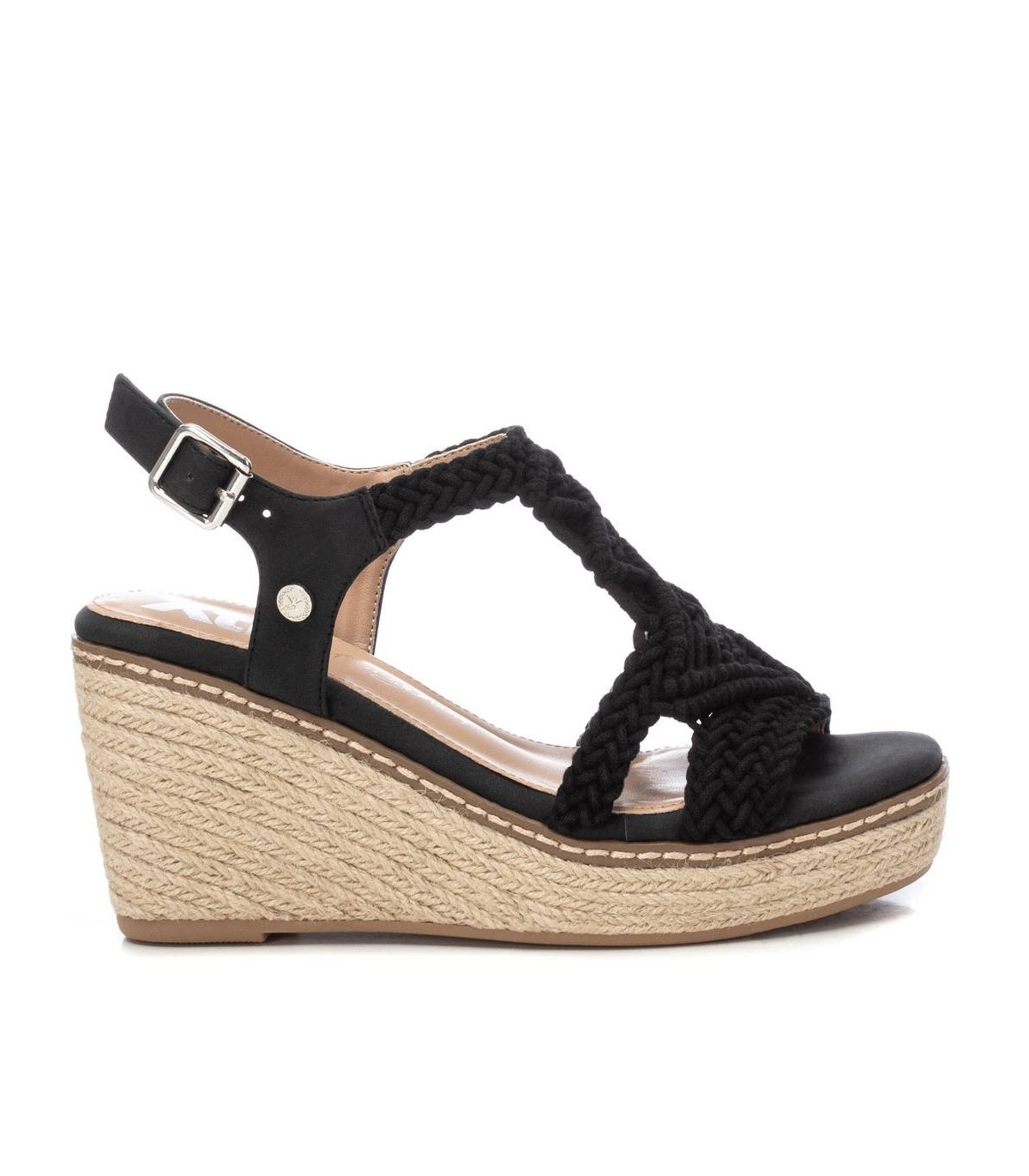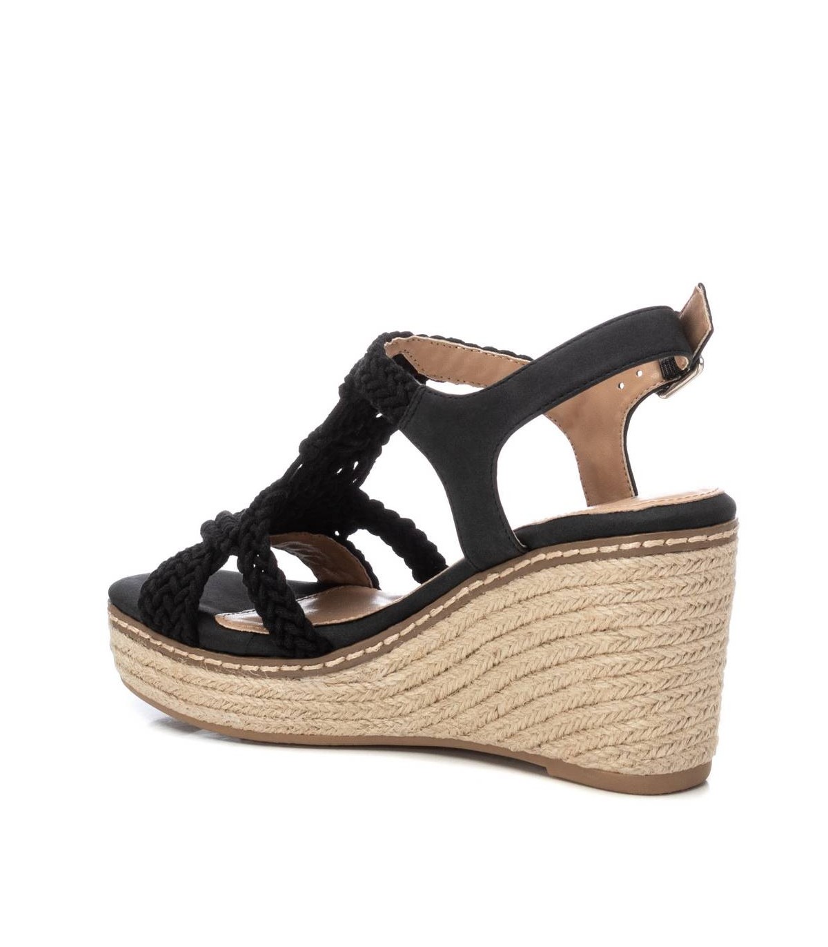 Sandalia de mujer, de la marca Xti. Fabricada en tejido estilo macramé. Cierre mediante hebilla al tobillo. Cuña de 8 cm con plataforma delantera forrada en yute trenzado. Suela de goma antideslizante. Este modelo ha obtenido el certificado vegano por la organización mundial PETA (Organización de los derechos de los animales).