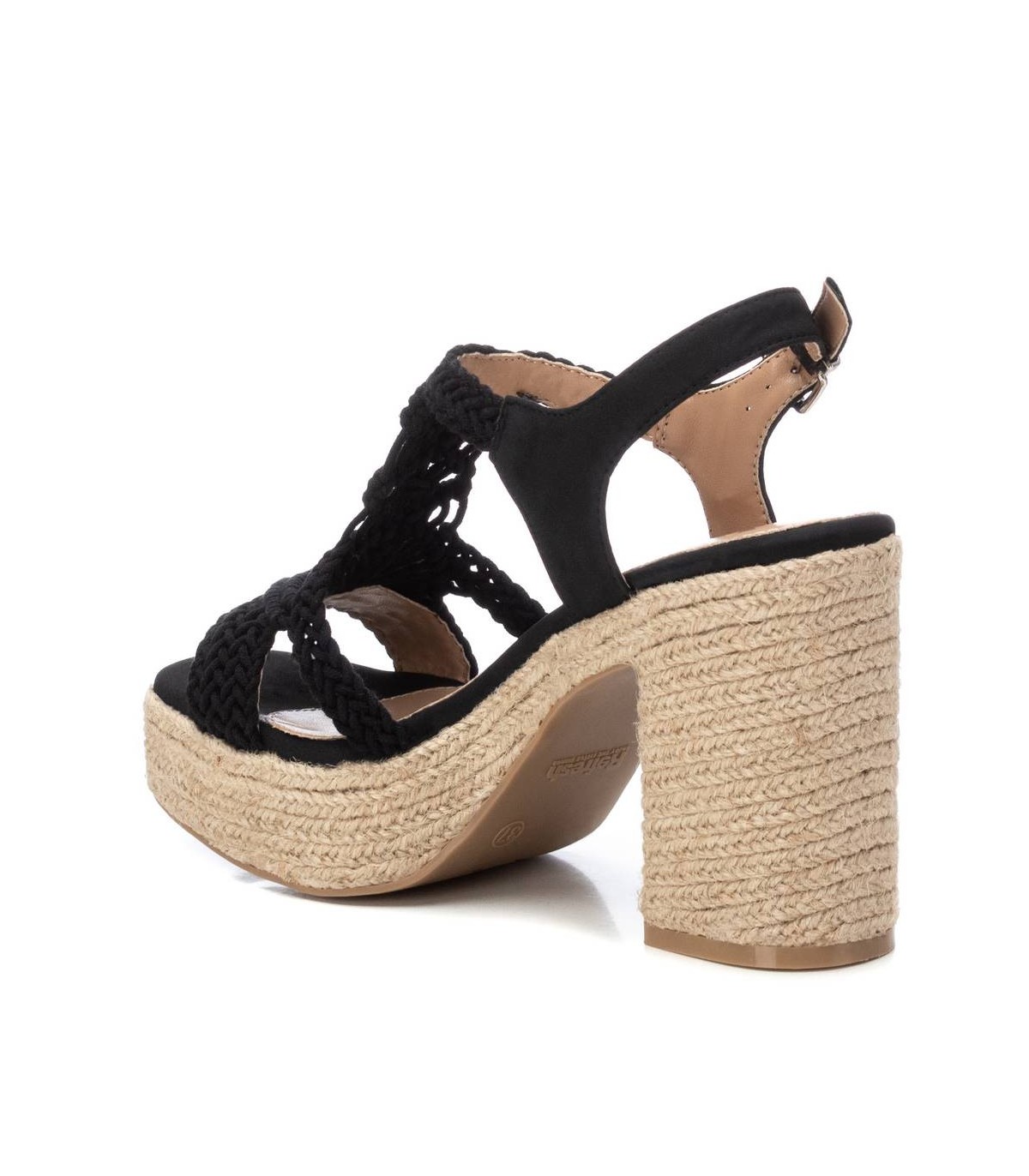 Sandalia de mujer, de la marca Xti. Fabricada en textil con diseño de macramé. Cierre con hebilla metálica para facilitar el ajuste. Tacón forrado en yute con plataforma delantera y suela de goma antideslizante. Este modelo ha obtenido el certificado vegano por la organización mundial PETA (Organización de los derechos de los animales).