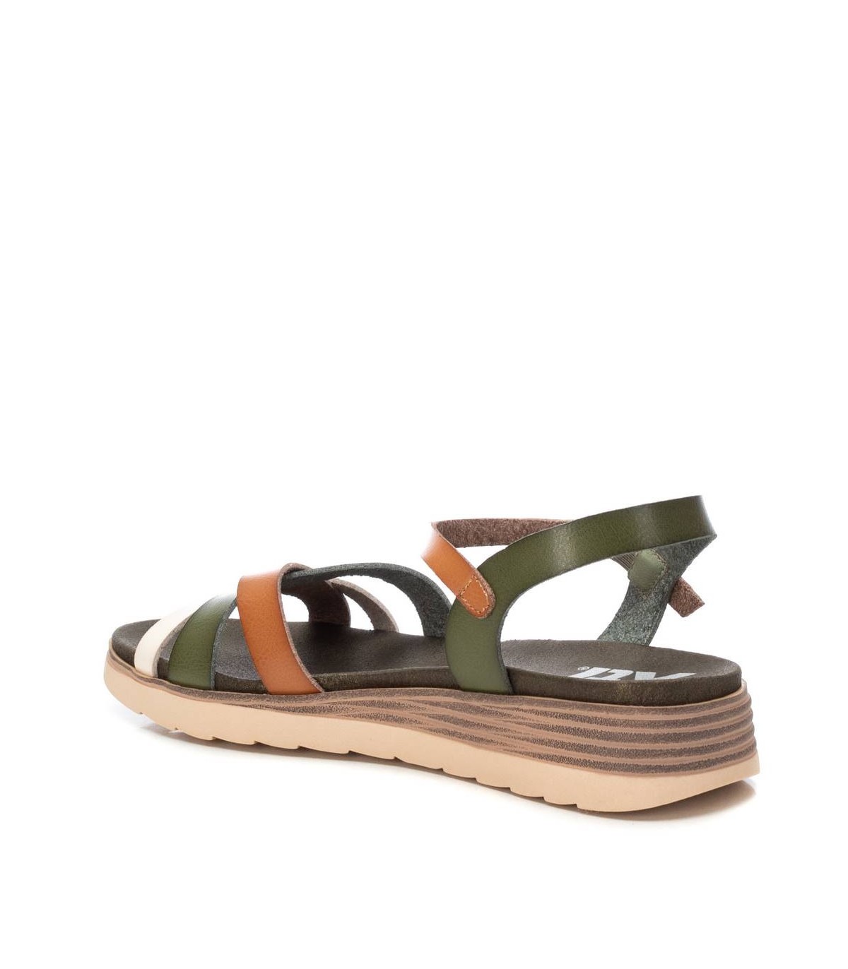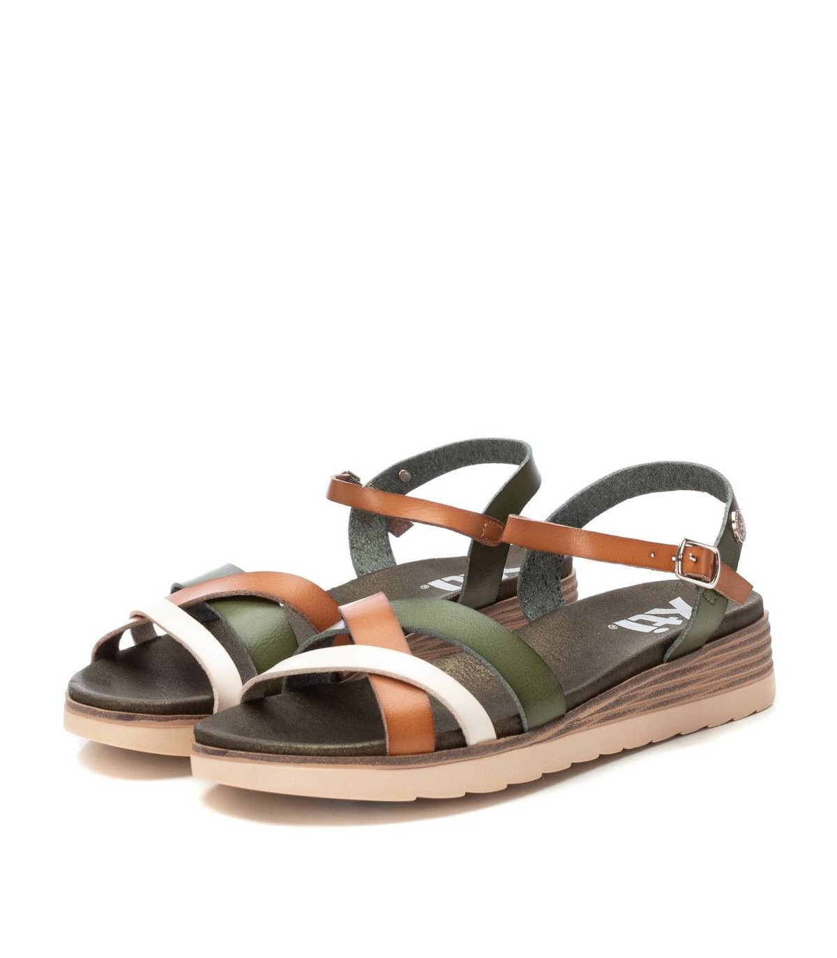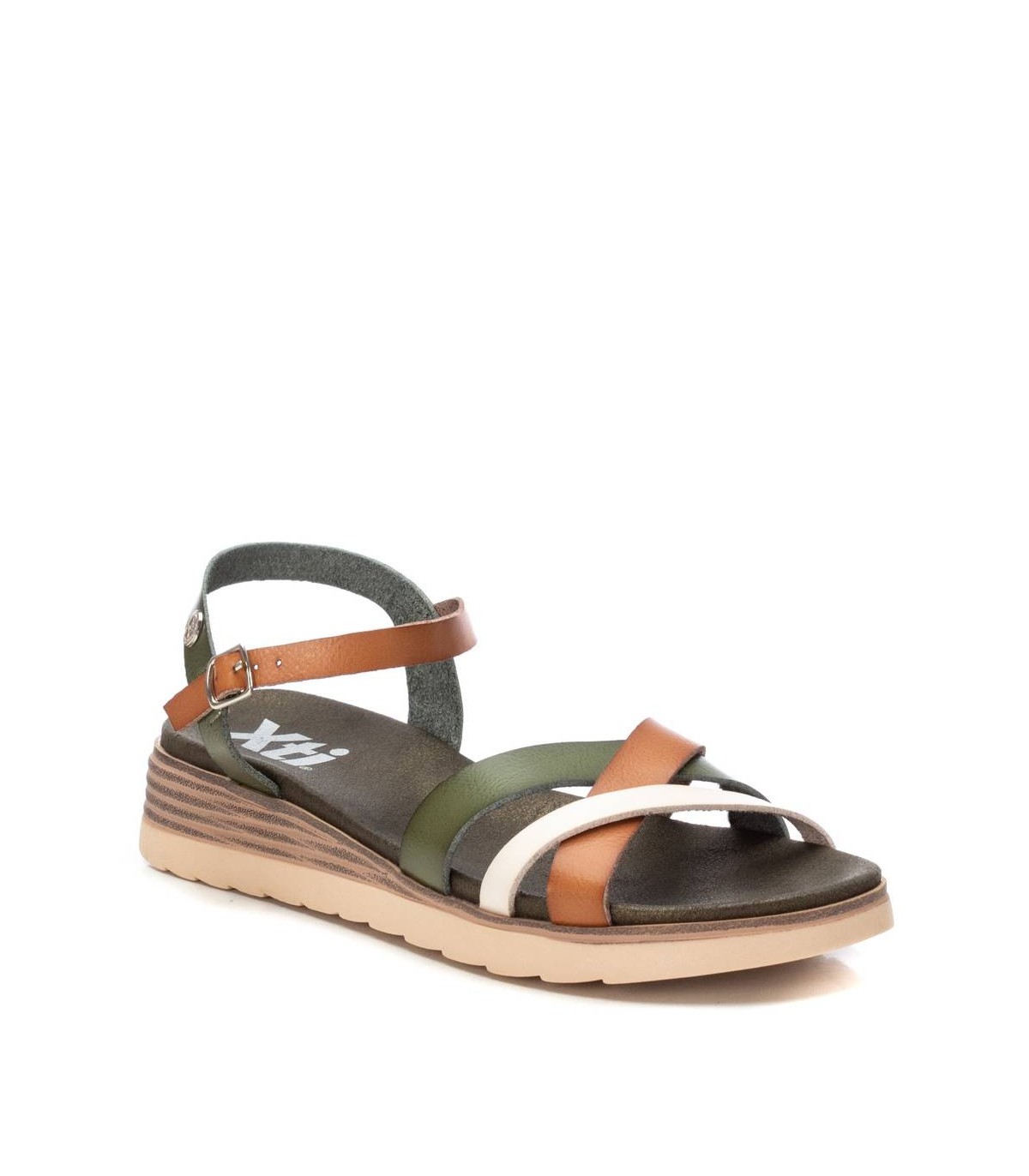 Sandalia de mujer, de la marca Xti. Fabricada en material que imita la piel. Pulsera con hebilla metálica para ajustar al tobillo. Cómoda planta acolchada con pequeña plataforma de 4 cm de altura con efecto madera. Suela de goma antideslizante. Este modelo ha obtenido el certificado vegano por la organización mundial PETA (Organización de los derechos de los animales).