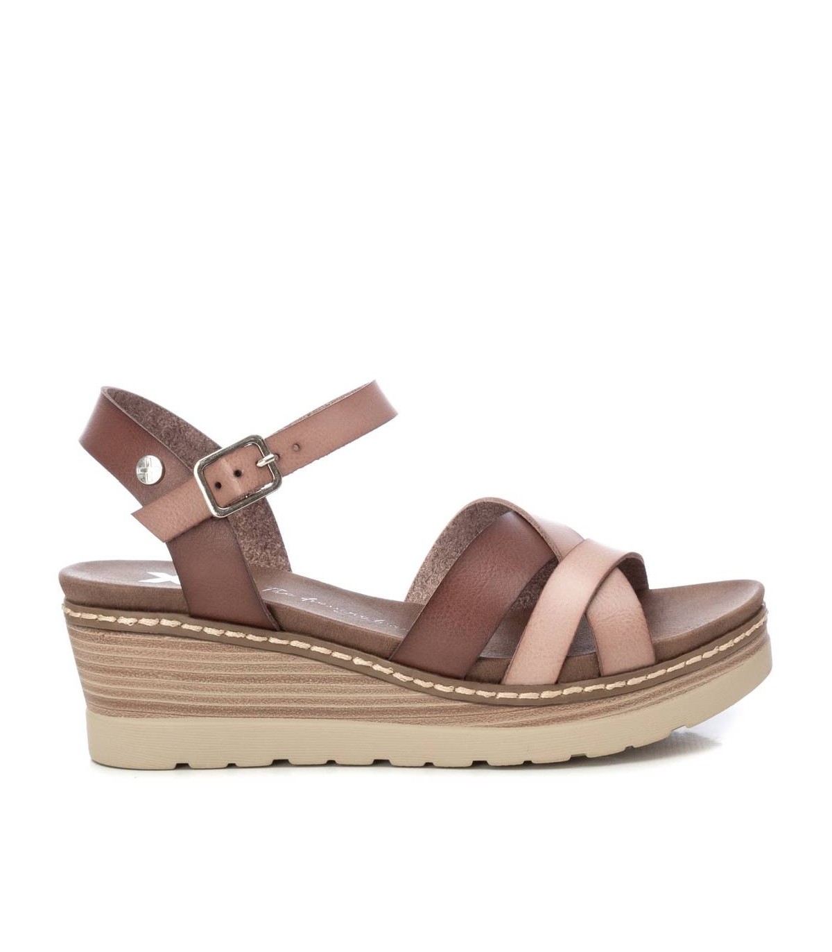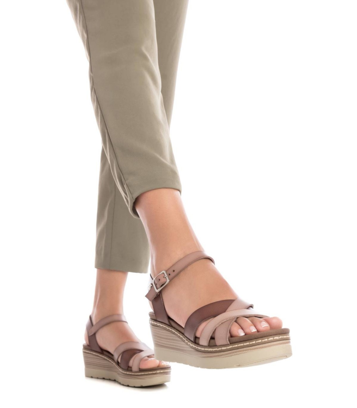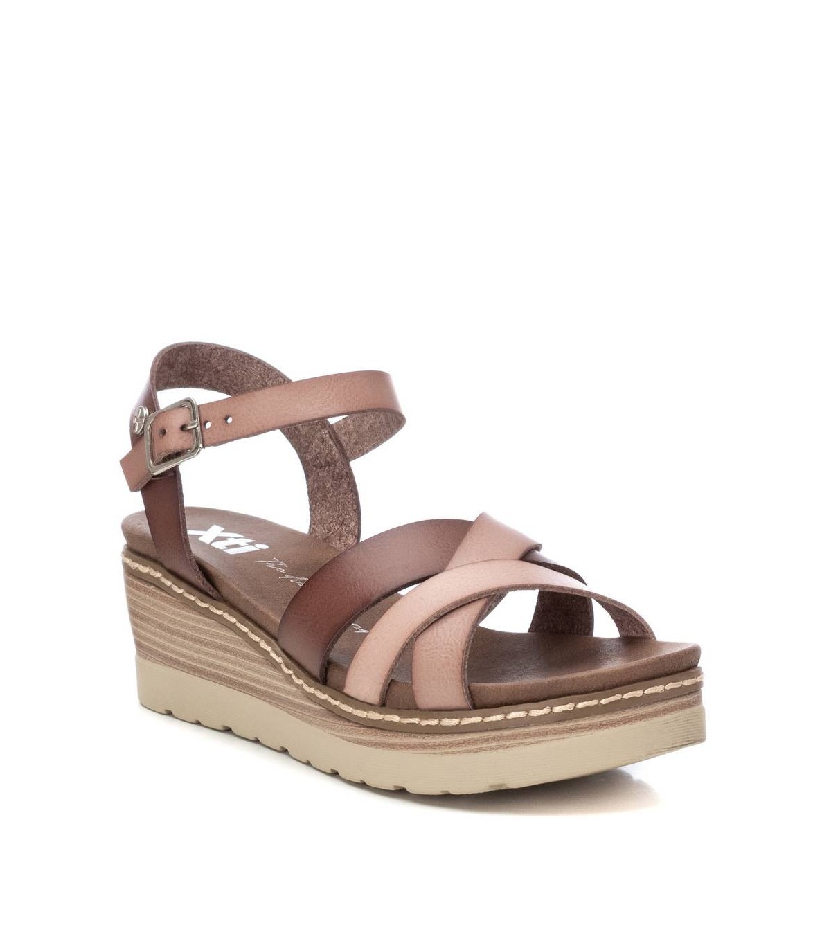 Sandalia de mujer, de la marca Xti. Fabricada en tiras de material que imita la piel. Pulsera con hebilla metalizada para ajustar al tobillo. Cómoda planta acolchada con pequeña plataforma de 5 cm de altura con efecto madera. Suela de goma antideslizante. Este modelo ha obtenido el certificado vegano por la organización mundial PETA (Organización de los derechos de los animales).
