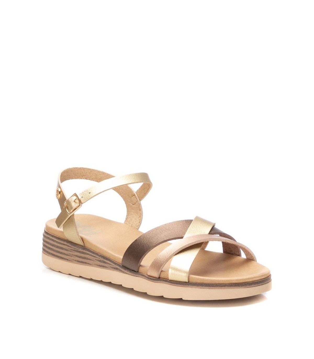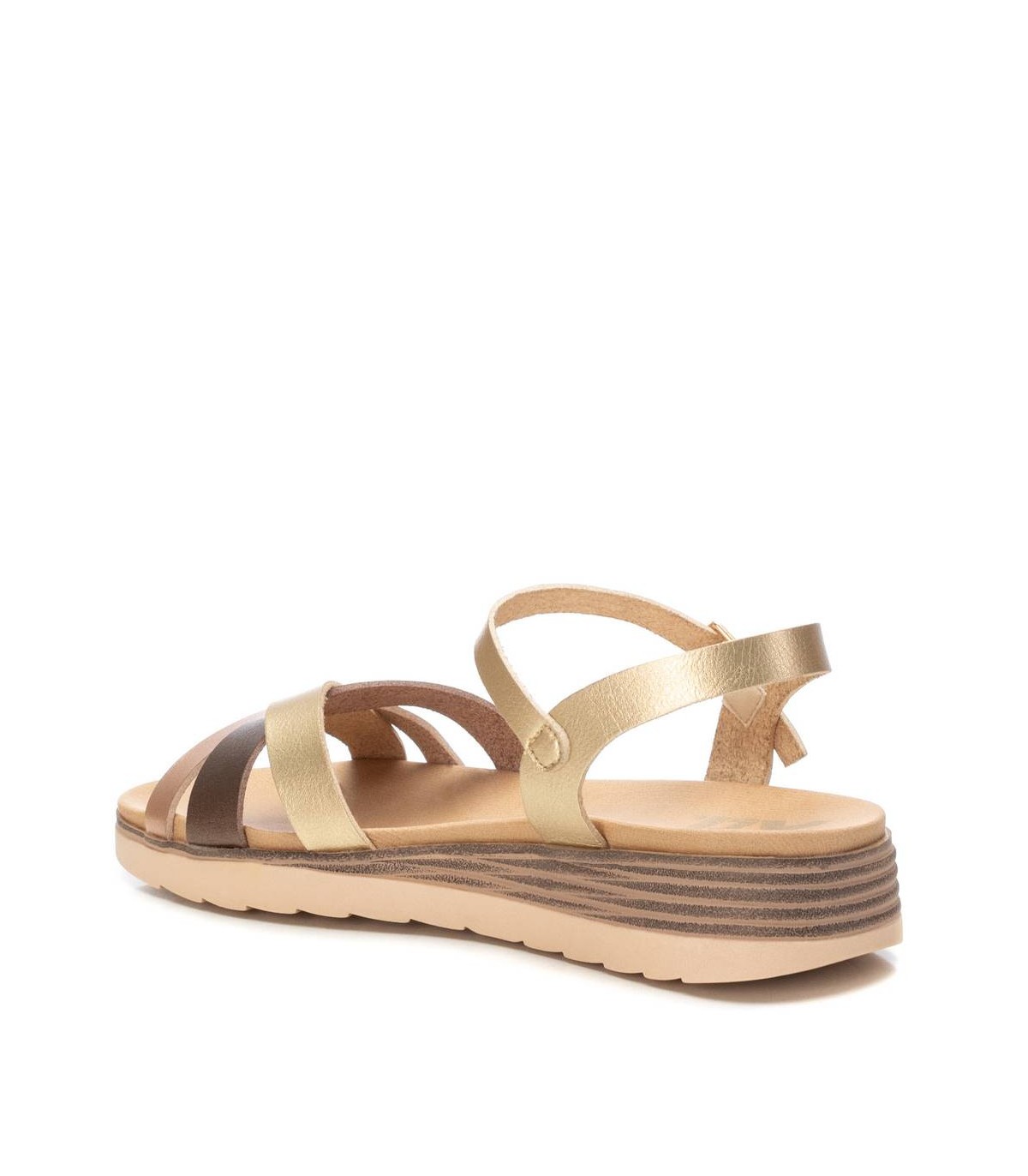 Sandalia de mujer, de la marca Xti. Fabricada en material que imita la piel con acabado metalizado. Diseño de tiras entrelazadas y pulsera en el tobillo con hebilla metálica. Pequeña cuña de 4 cm con suela antideslizante. Este modelo ha obtenido el certificado vegano por la organización mundial PETA (Organización de los derechos de los animales).