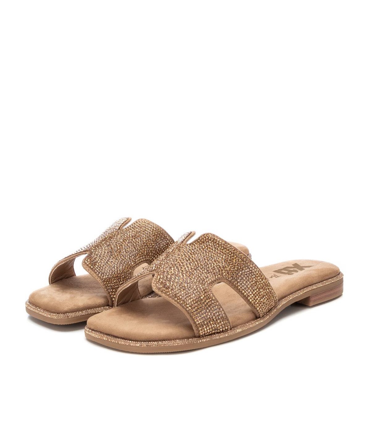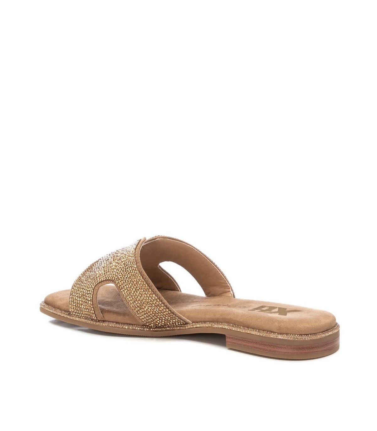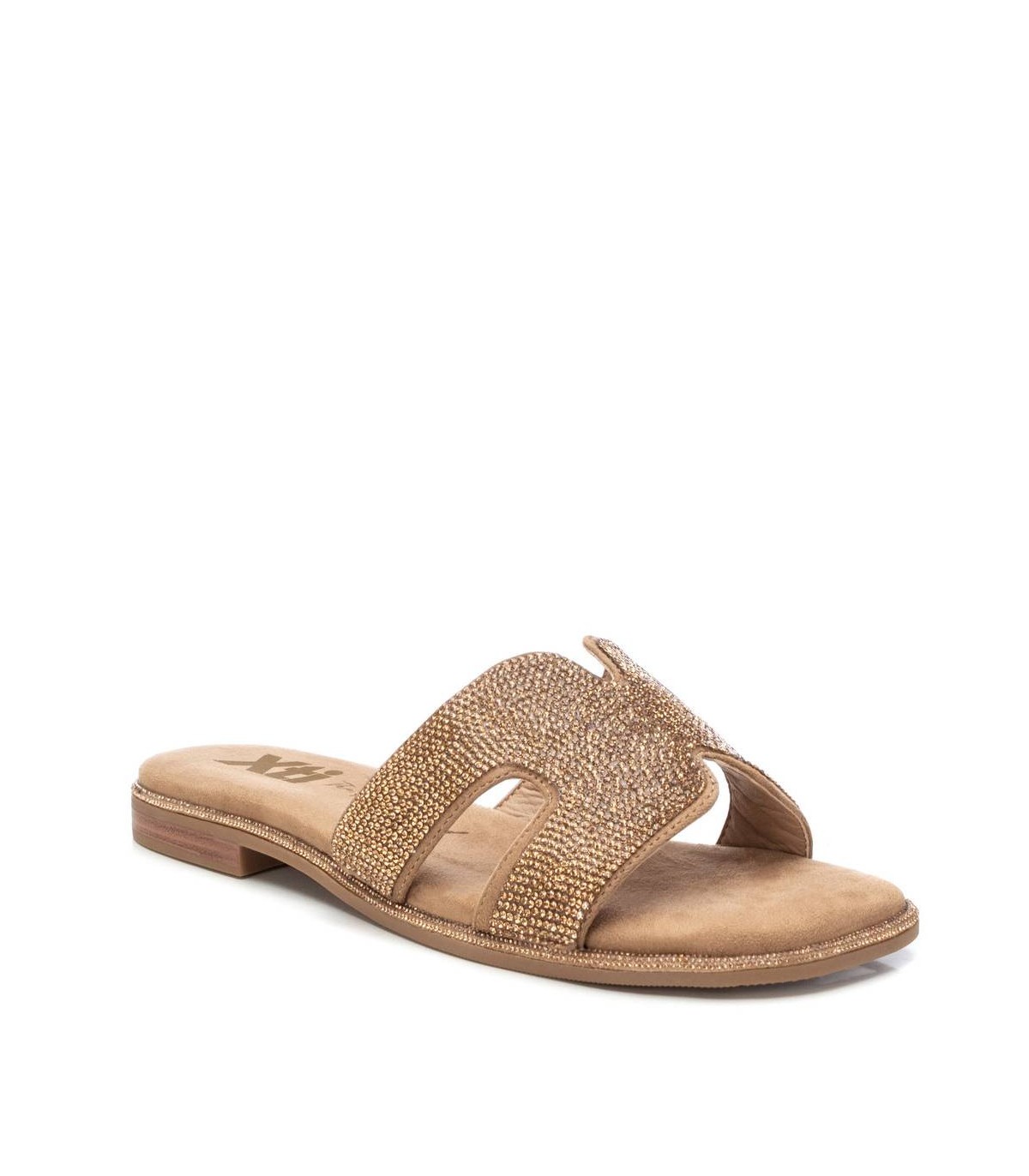 Sandalia de mujer, de la marca Xti. Fabricada en antelina con detalles de piedras de fantasía. Suela de goma antideslizante. Este modelo ha obtenido el certificado vegano por la organización mundial PETA (Organización de los derechos de los animales).