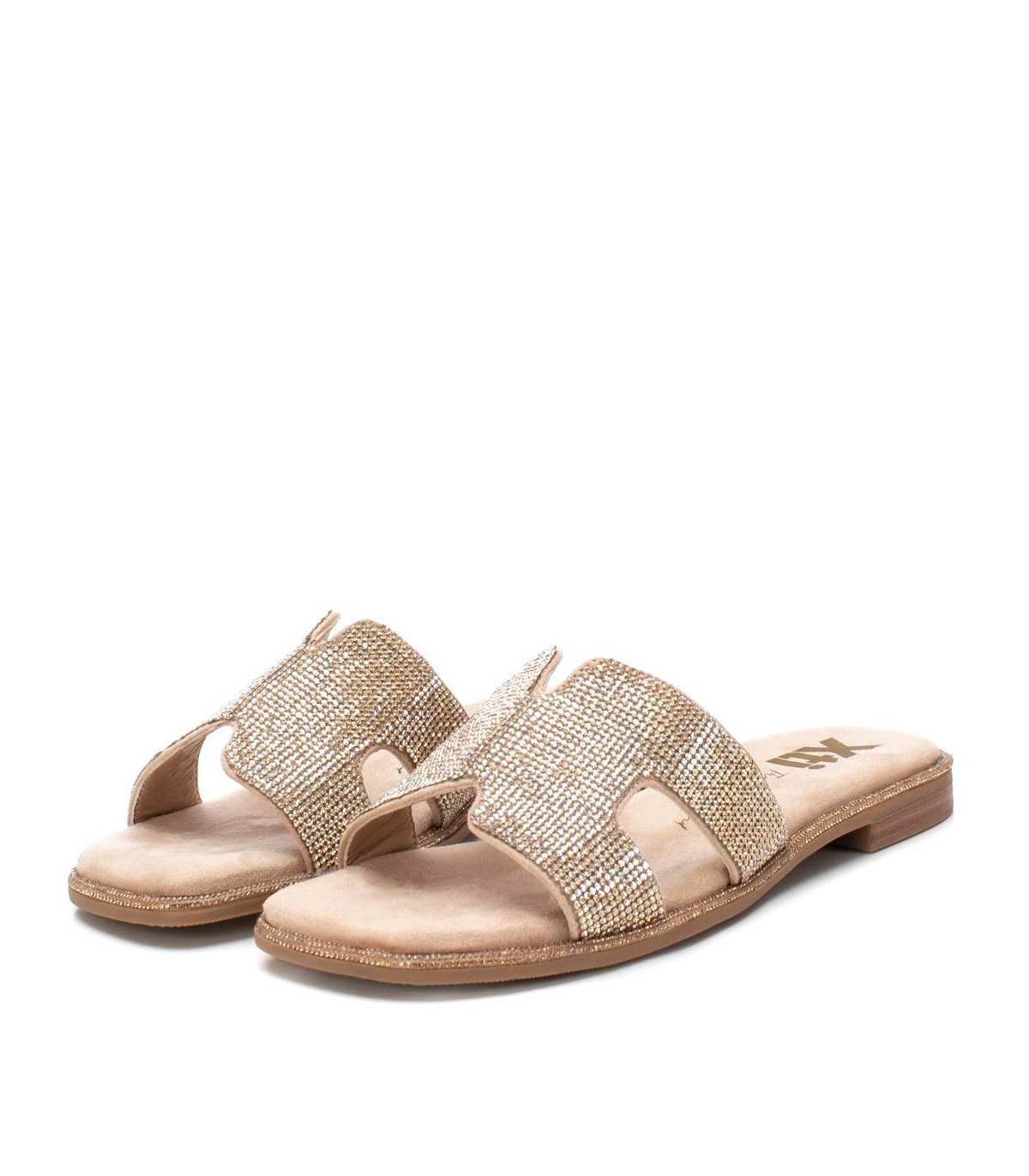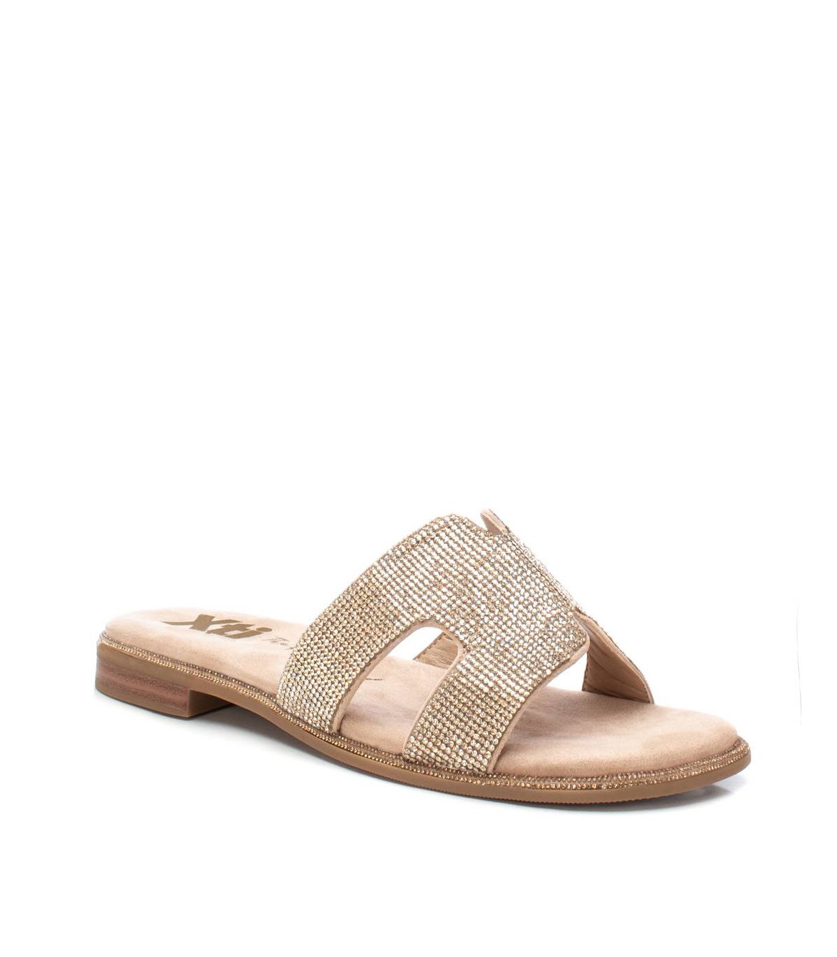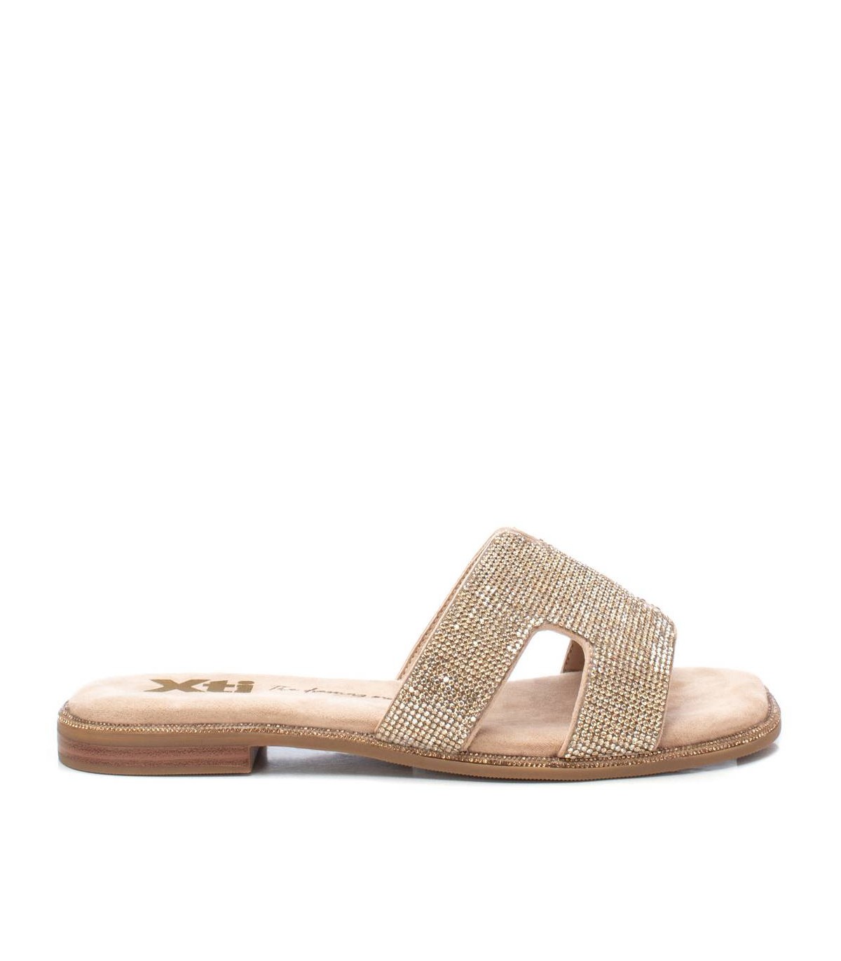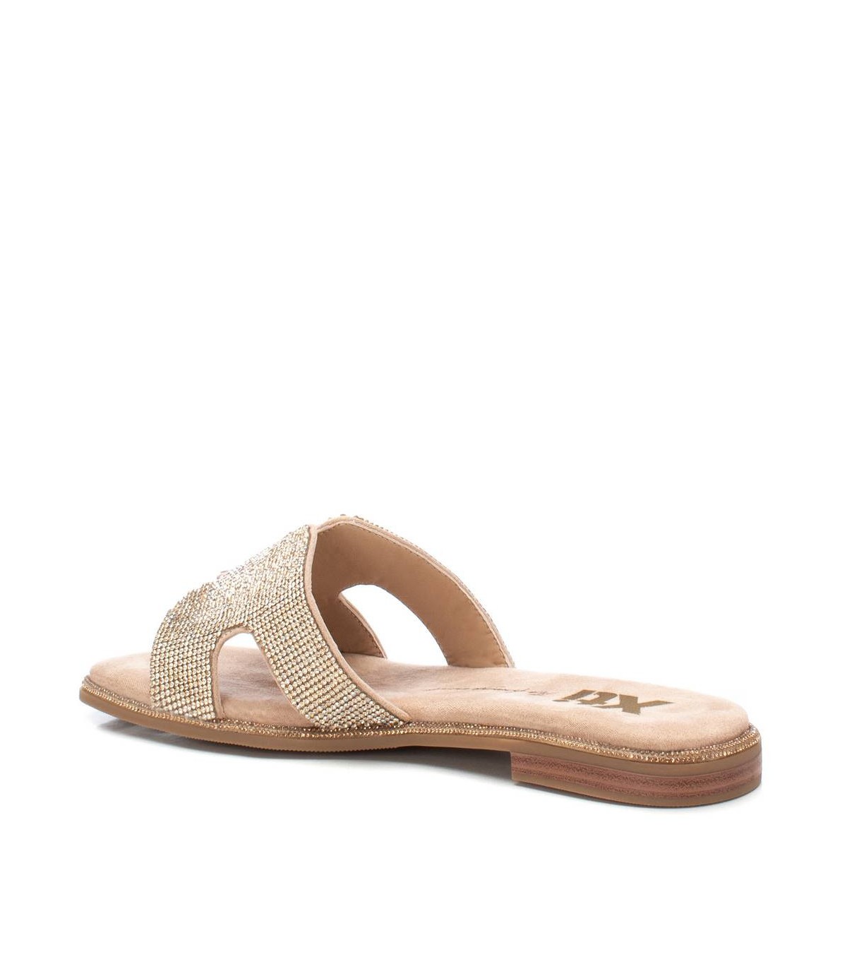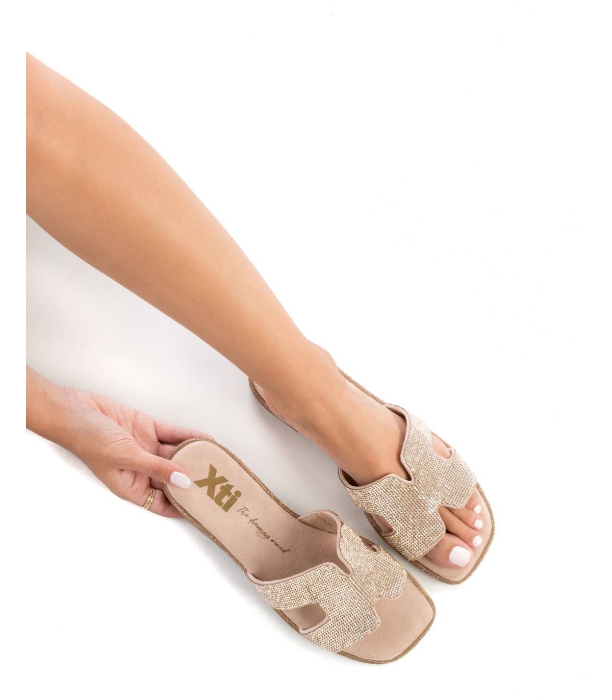 Sandalia de mujer, de la marca Xti. Fabricada en antelina con detalles de piedras de fantasía. Suela de goma antideslizante. Este modelo ha obtenido el certificado vegano por la organización mundial PETA (Organización de los derechos de los animales).