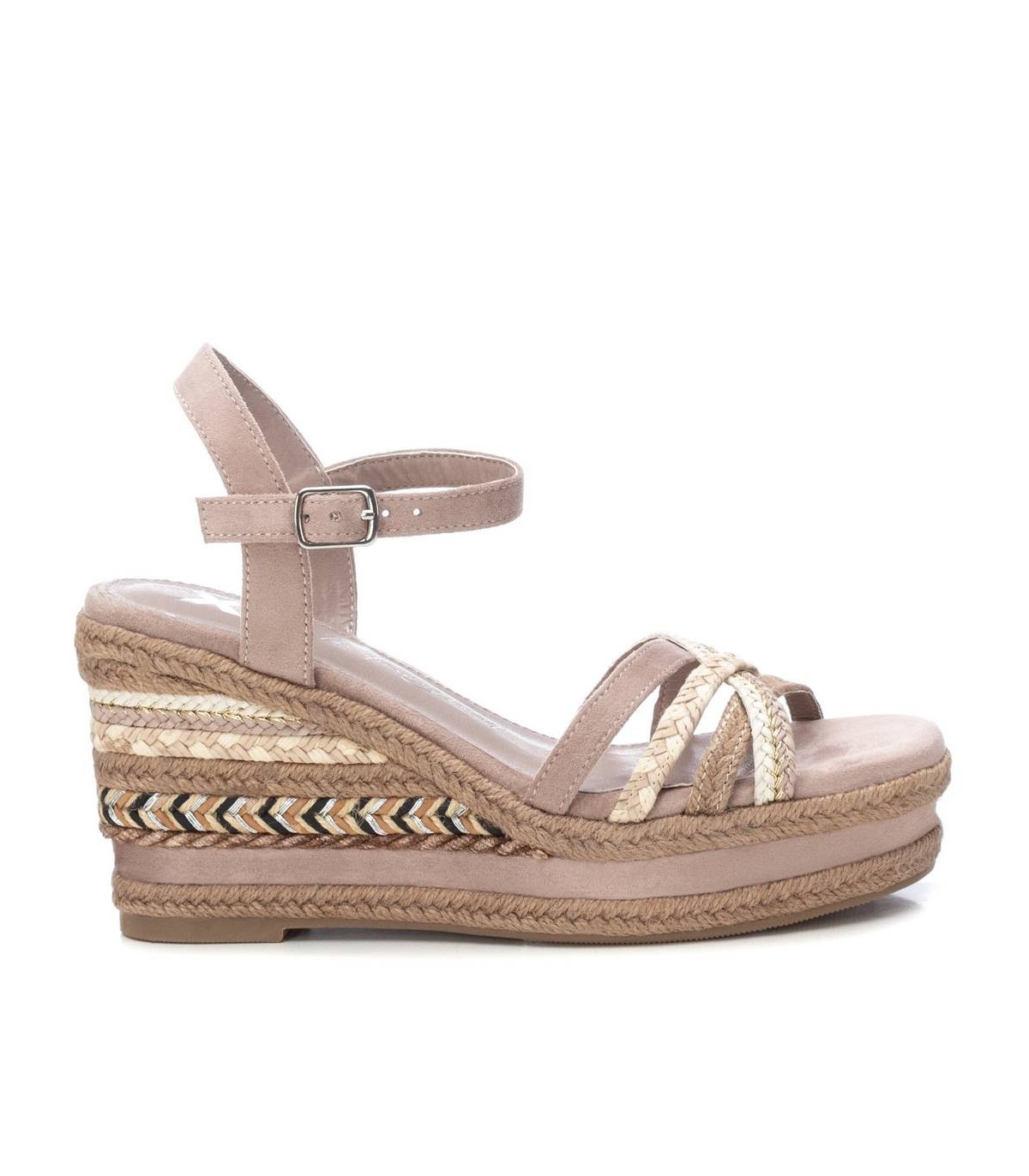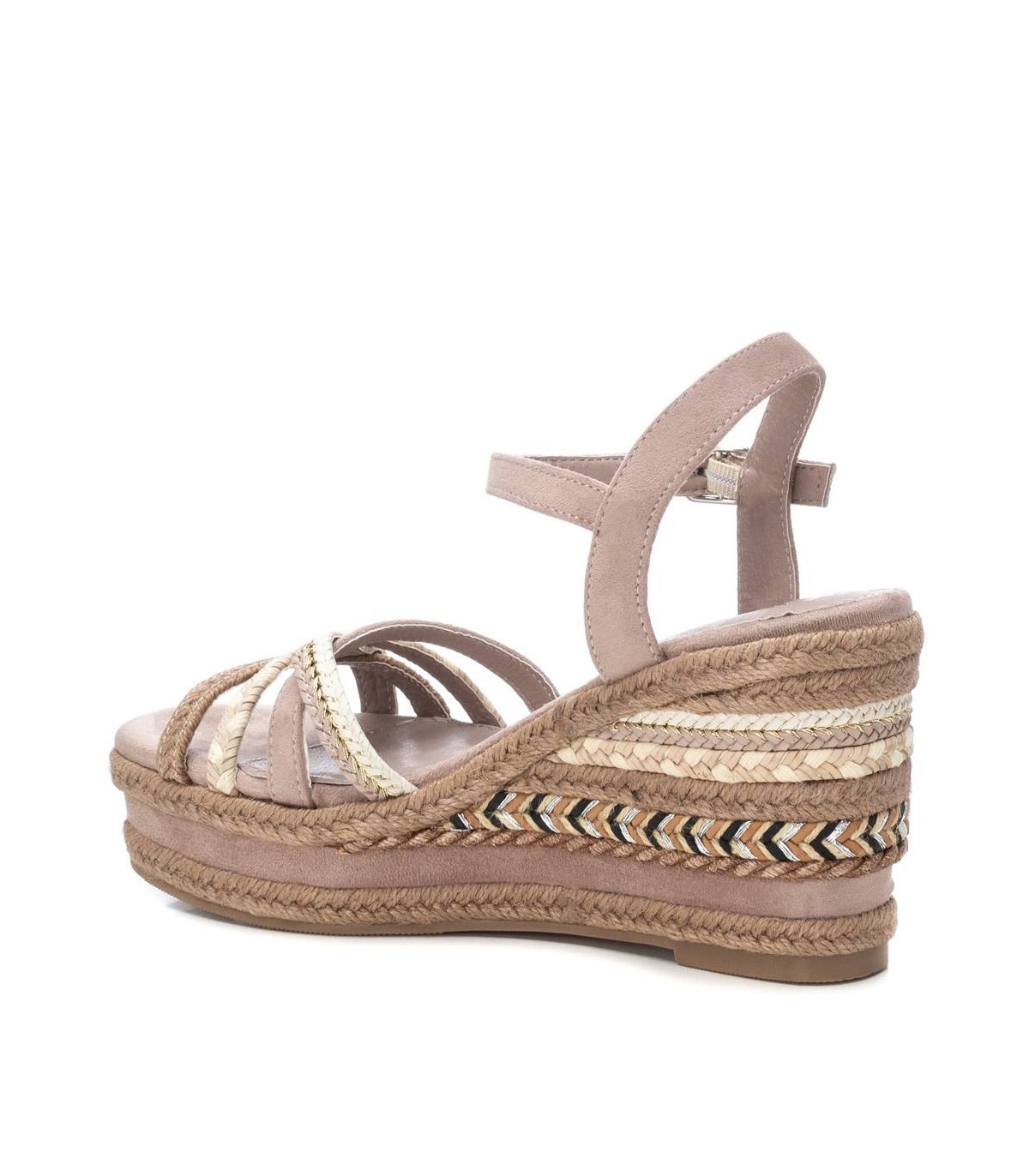 Sandalia de mujer, de la marca Xti. Fabricada en material antelina combinado con tiras decorativas y detalles de hilos metalizados. Diseño de tiras con pulsera al tobillo. Cierre mediante hebilla. Cuña de 9 cm con plataforma delantera de yute y suela de goma antideslizante. Este modelo ha obtenido el certificado vegano por la organización mundial PETA (Organización de los derechos de los animales).