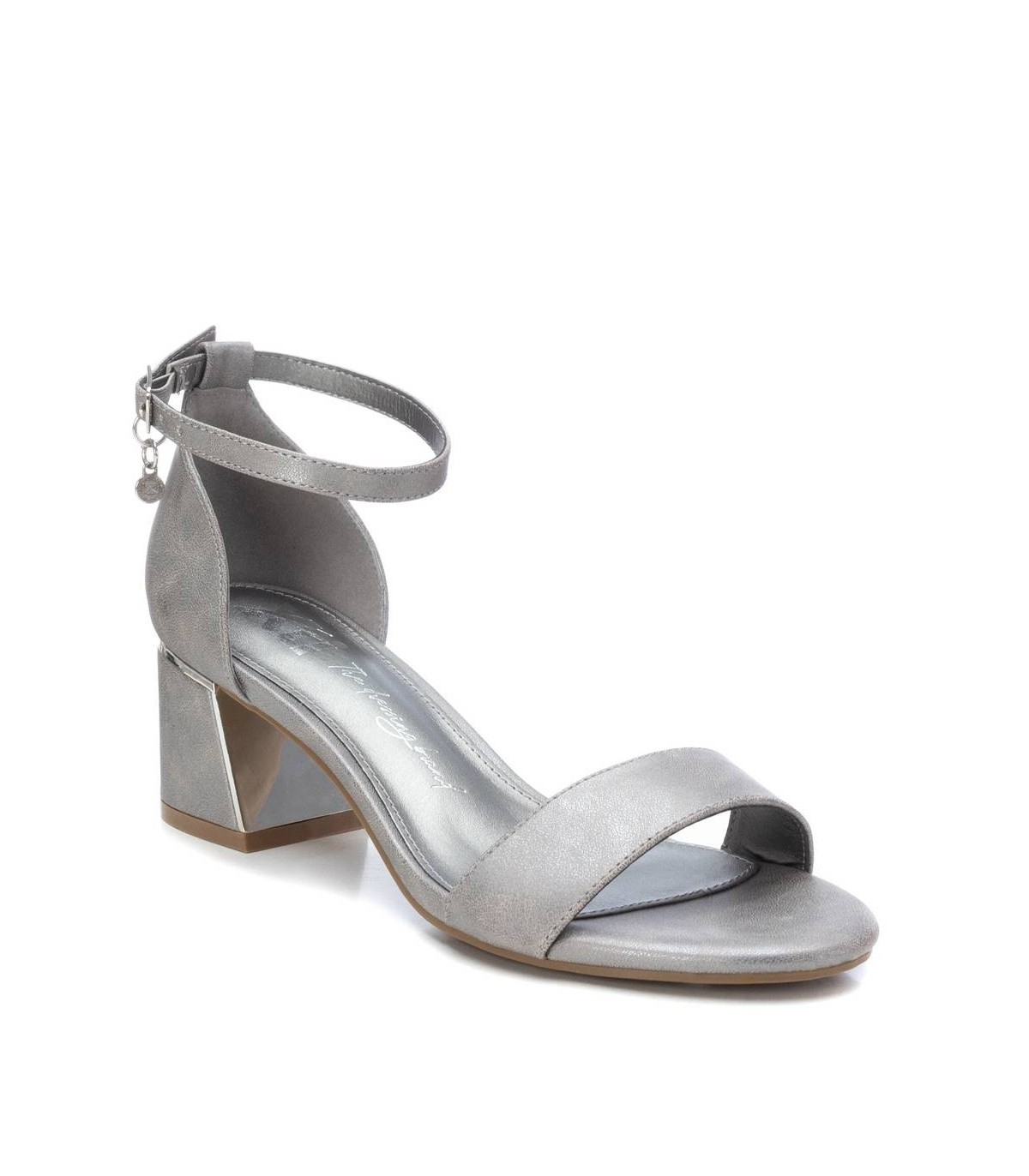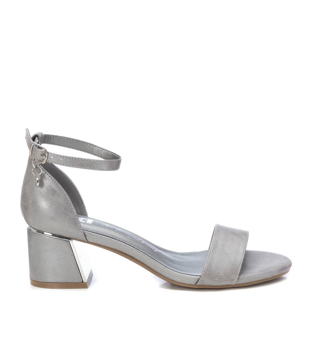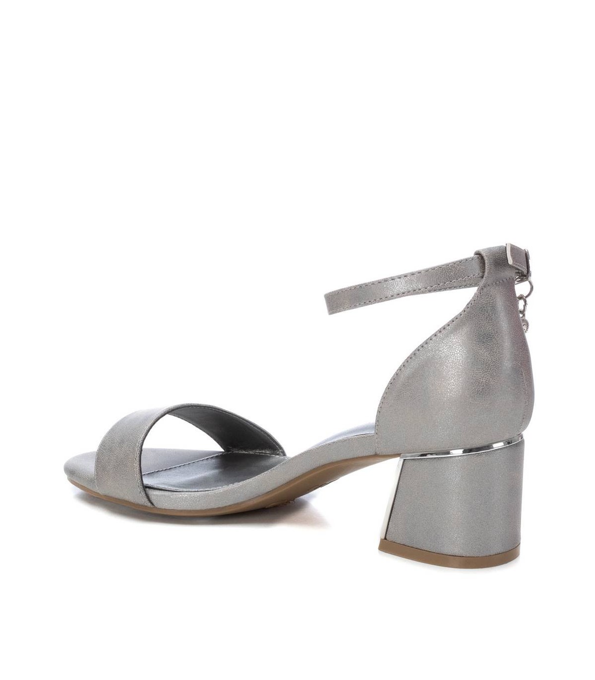 Sandalia de mujer de la marca Xti. Fabricada en material que imita la piel con acabado metalizado. Cierre mediante hebilla. Cómodo tacón ancho de 6 cm con suela de goma antideslizante. Este modelo ha obtenido el certificado vegano por la organización mundial PETA (Organización de los derechos de los animales).