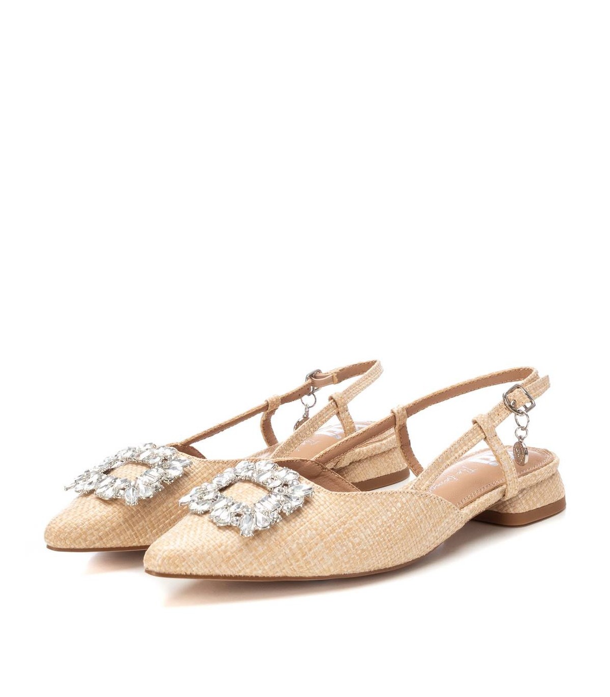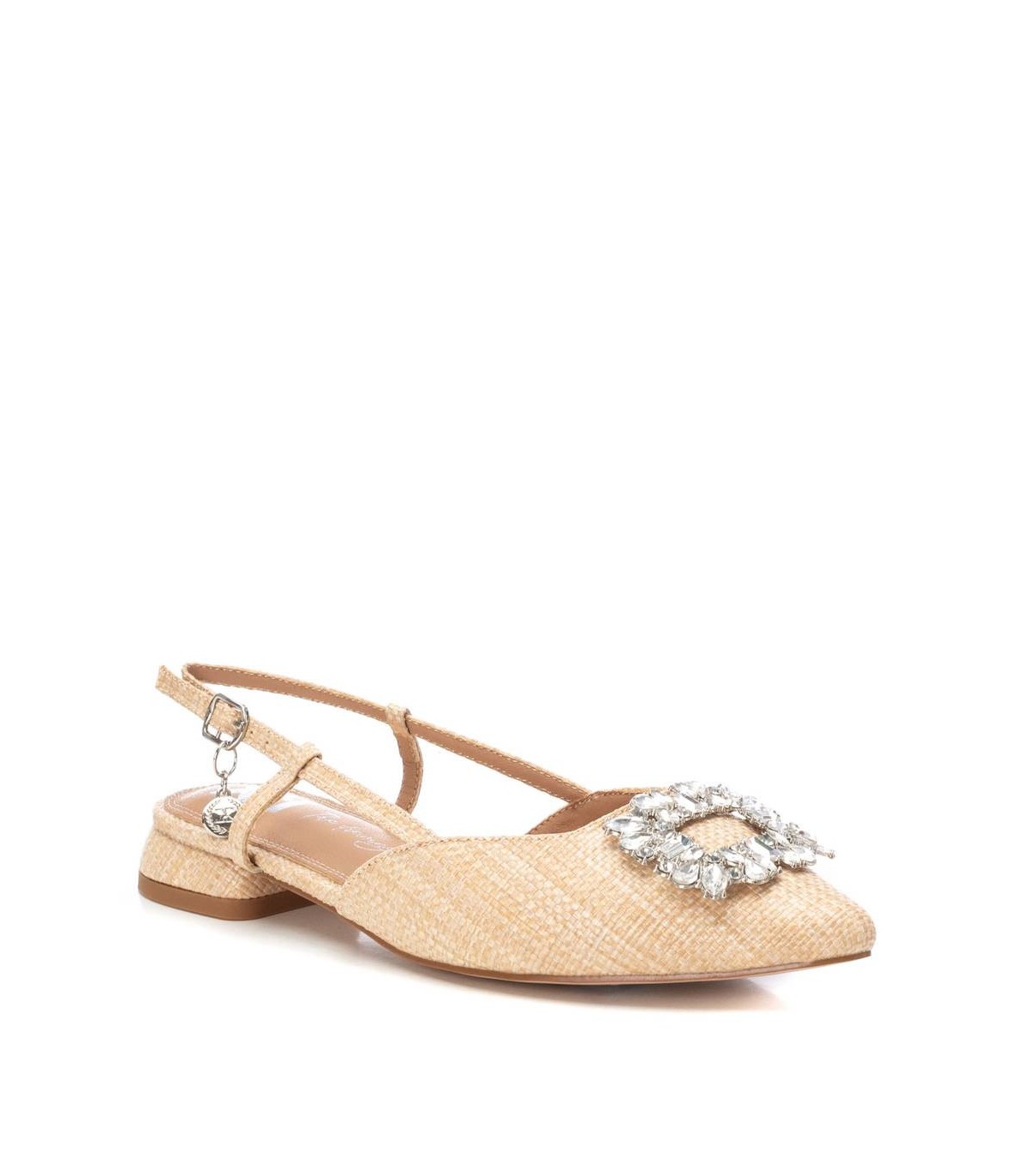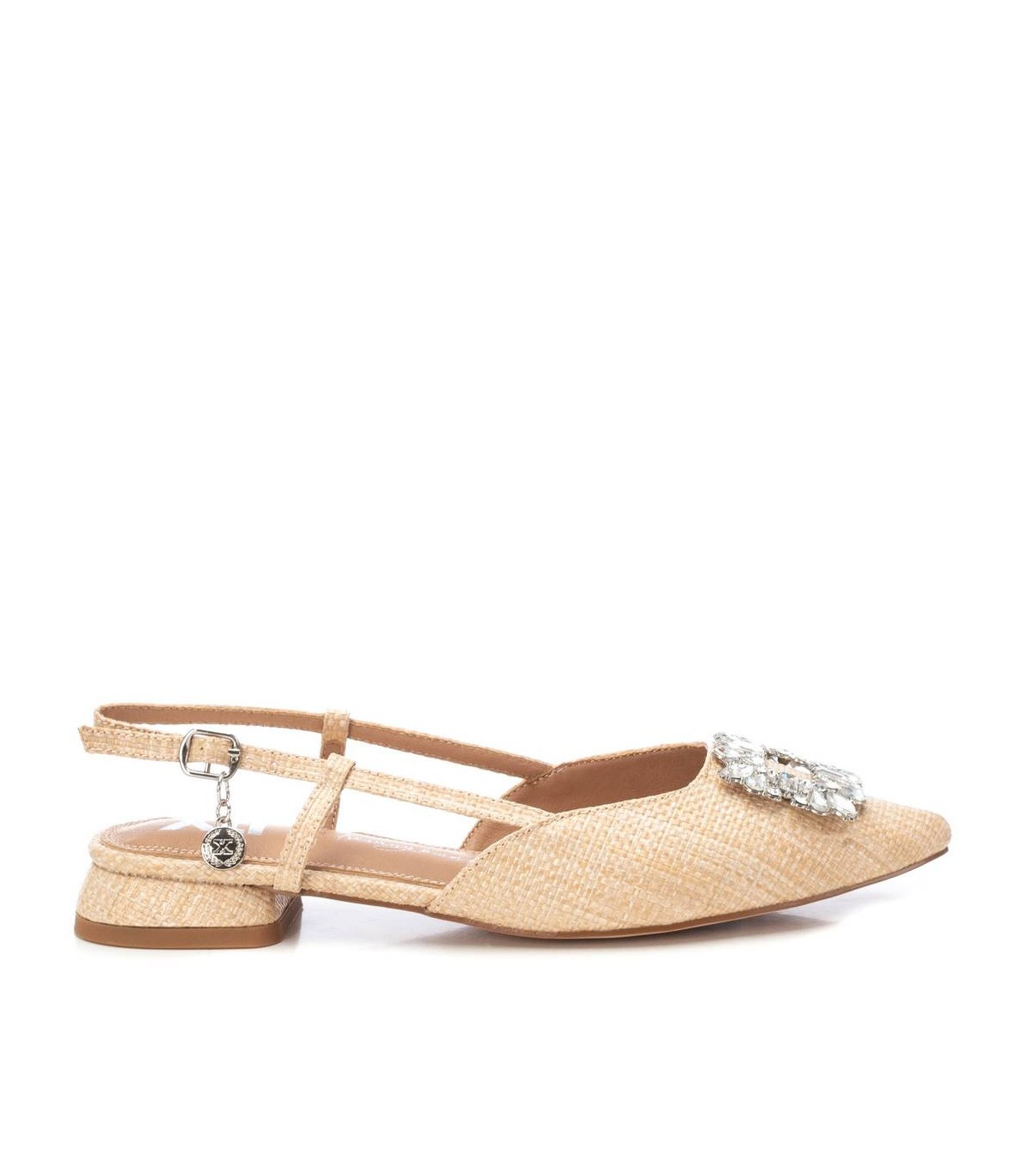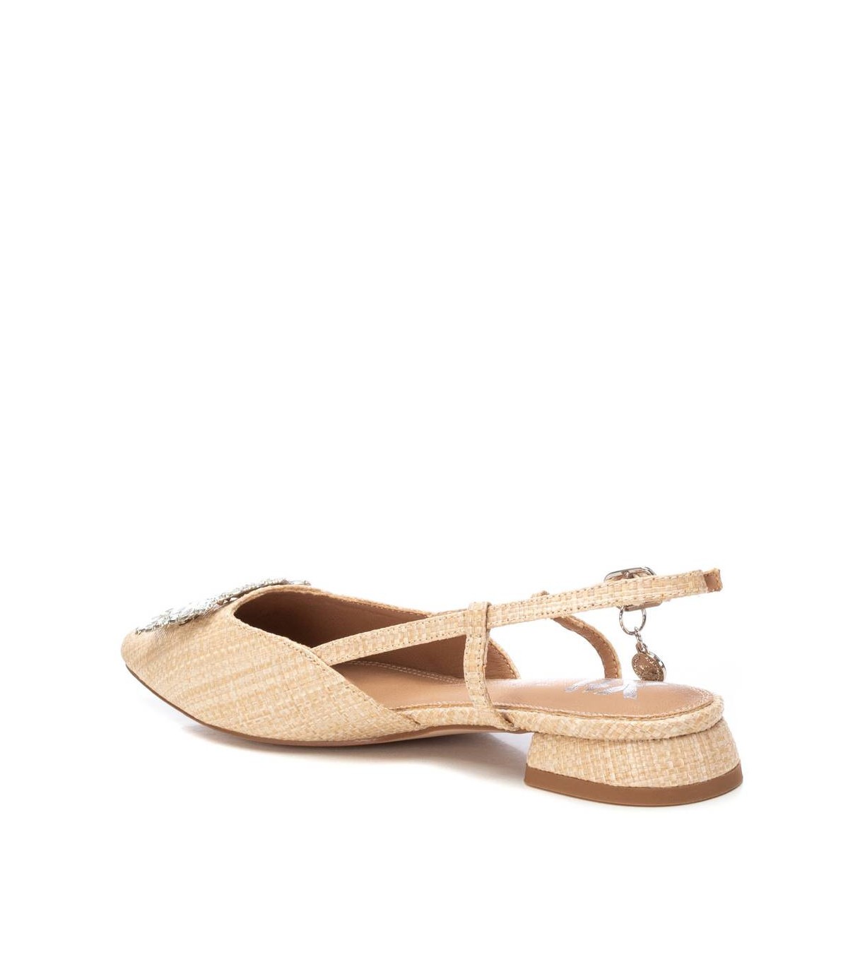 Zapato destalonado de mujer de la marca Xti. Fabricada en rafia. Con bonito detalle de pedrería. Pulsera con hebilla metálica para facilitar su puesta. Suela de goma antideslizante. Estos zapatos serán el centro de tus mejores looks. Este modelo ha obtenido el certificado vegano por la organización mundial PETA (Organización de los derechos de los animales).