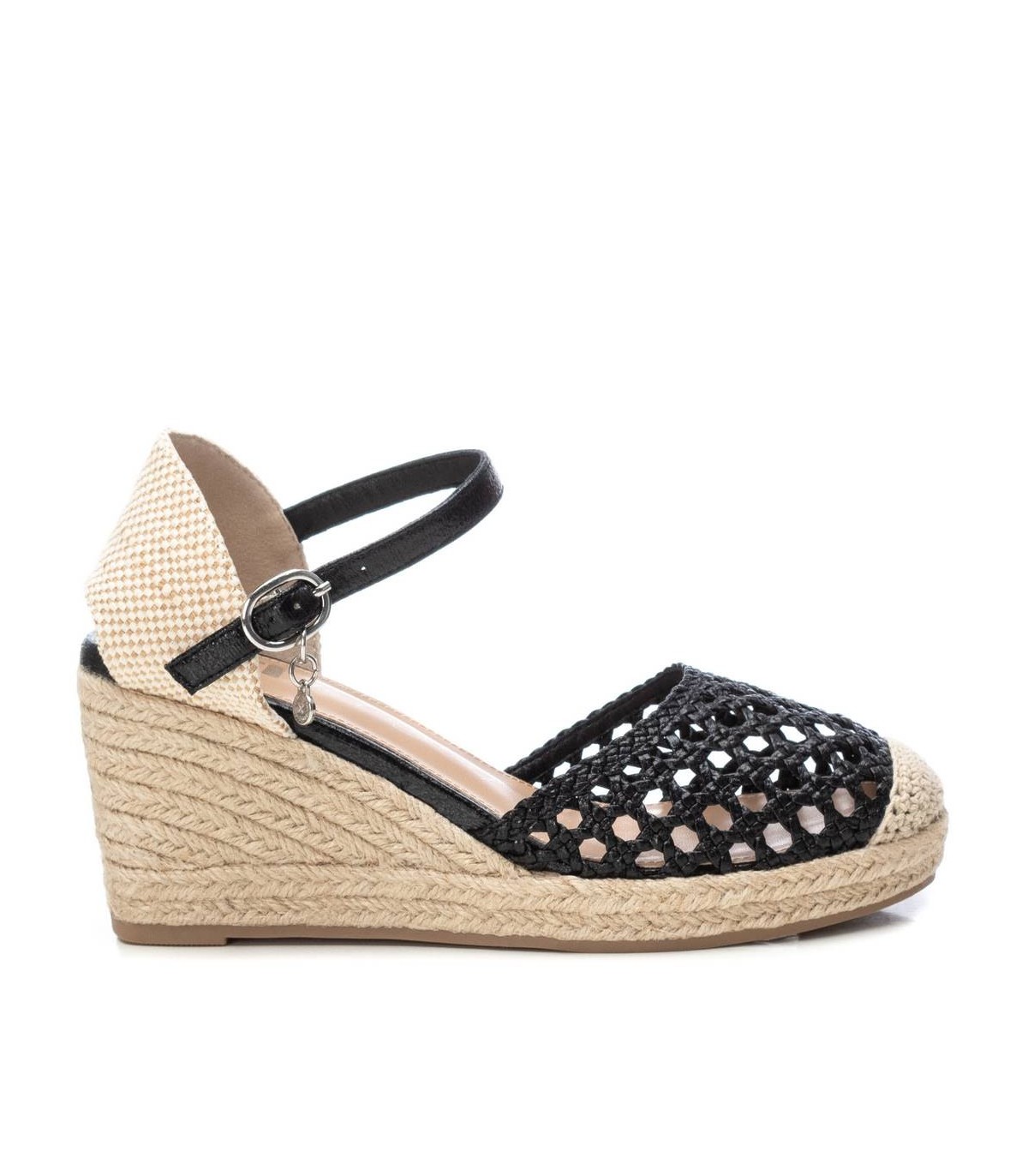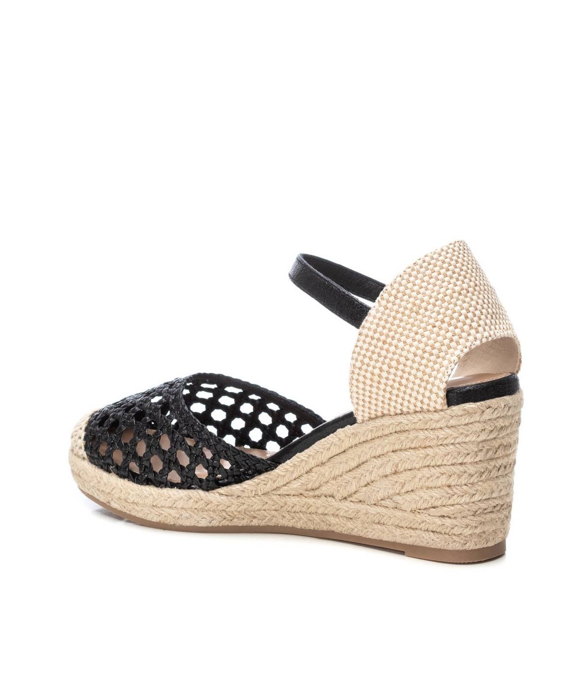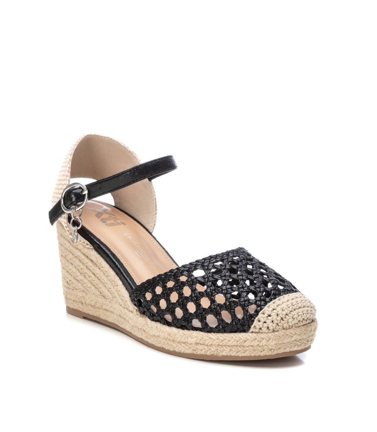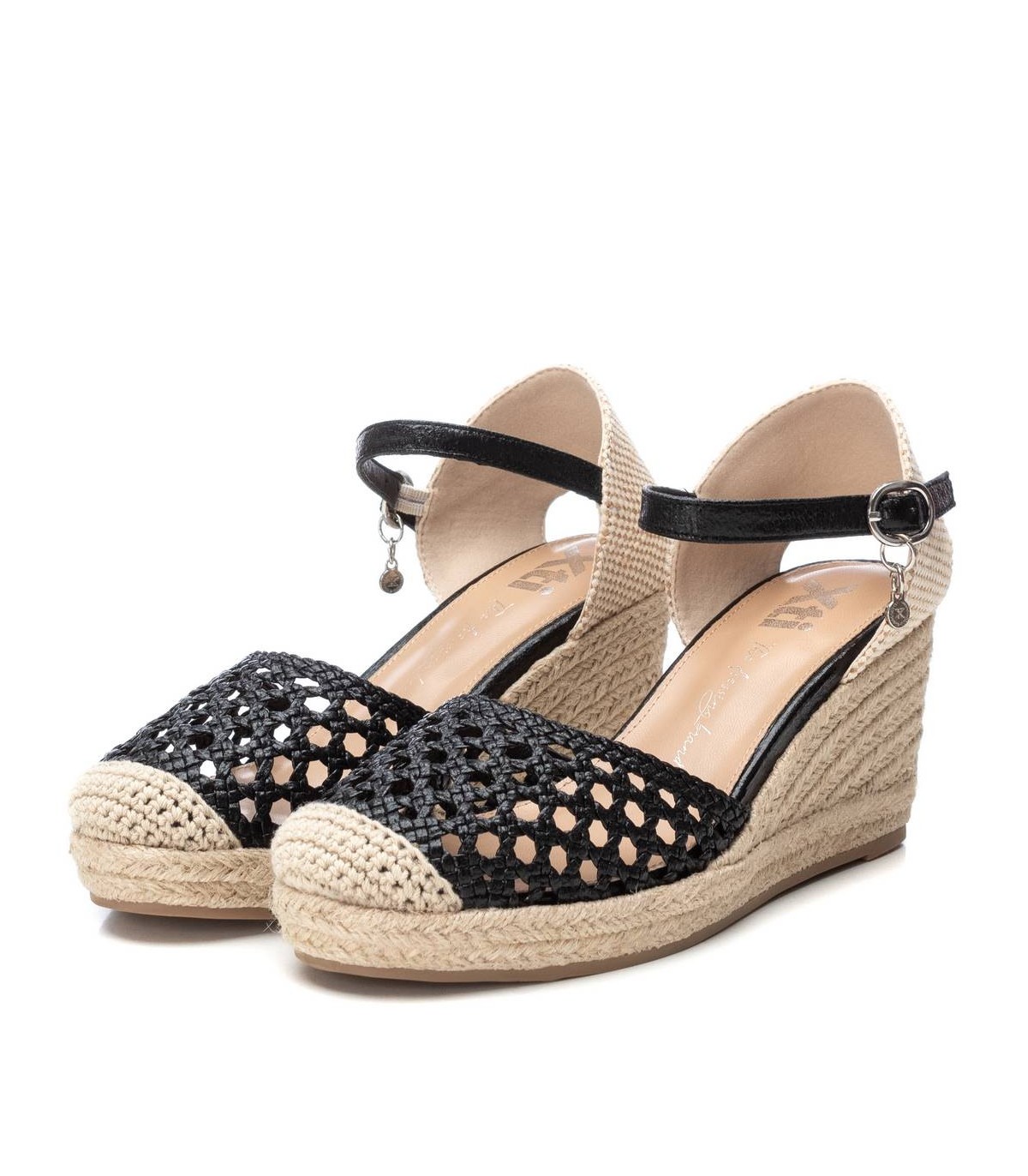 Valenciana de mujer, de la marca Xti. Fabricada en material que imita la piel con acabado metalizado. Cierre con hebilla. Plantilla acolchada. Cuña de 8 cm de yute con suela antideslizante. Este modelo ha obtenido el certificado vegano por la organización mundial PETA (Organización de los derechos de los animales).