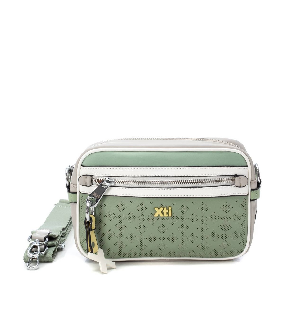 Bolso pequeño de la marca Xti. Fabricado en material que imita a la piel. Cierre de cremallera. 5 bolsillos en total. Medidas: 14 x 20 x 8 cm. Este modelo ha obtenido el certificado vegano por la organización mundial PETA (Organización de los derechos de los animales).