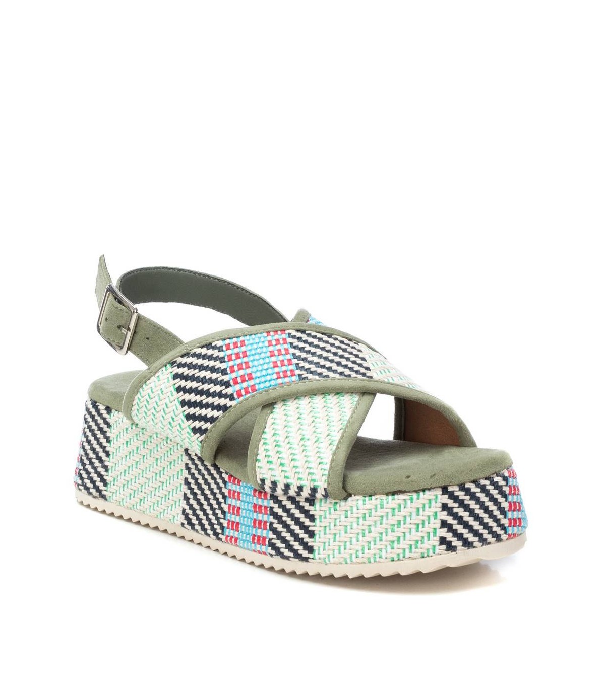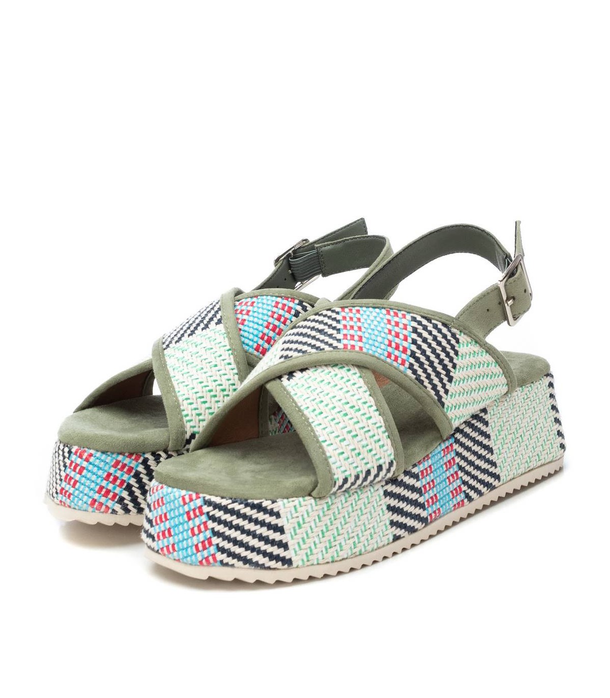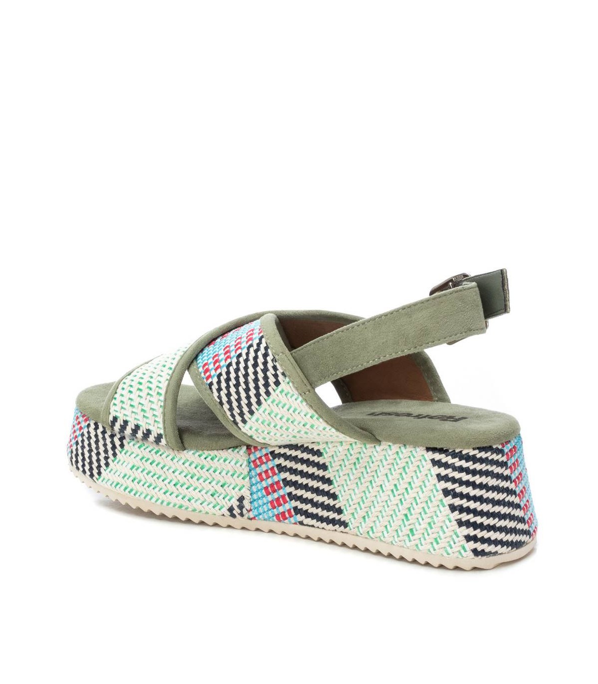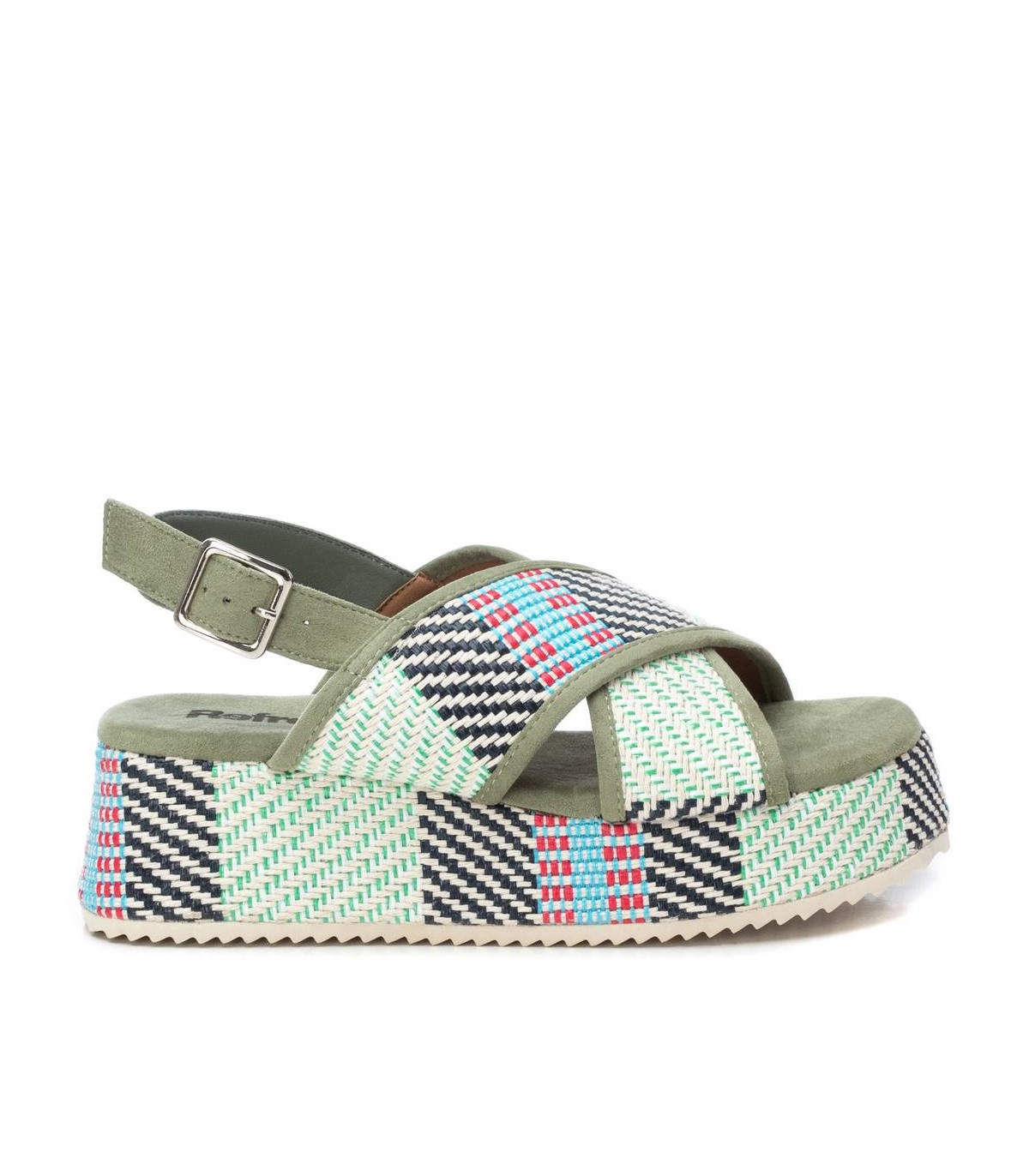 Sandalia de mujer, de la marca Refresh. Fabricada en material textil. Doble pala cruzada con correa al tobillo. Cierre mediante hebilla. Cómoda planta acolchada. Cuña de 5 cm con plataforma forrada en el mismo material. Suela antideslizante. Este modelo ha obtenido el certificado vegano por la organización mundial PETA (Organización de los derechos de los animales).