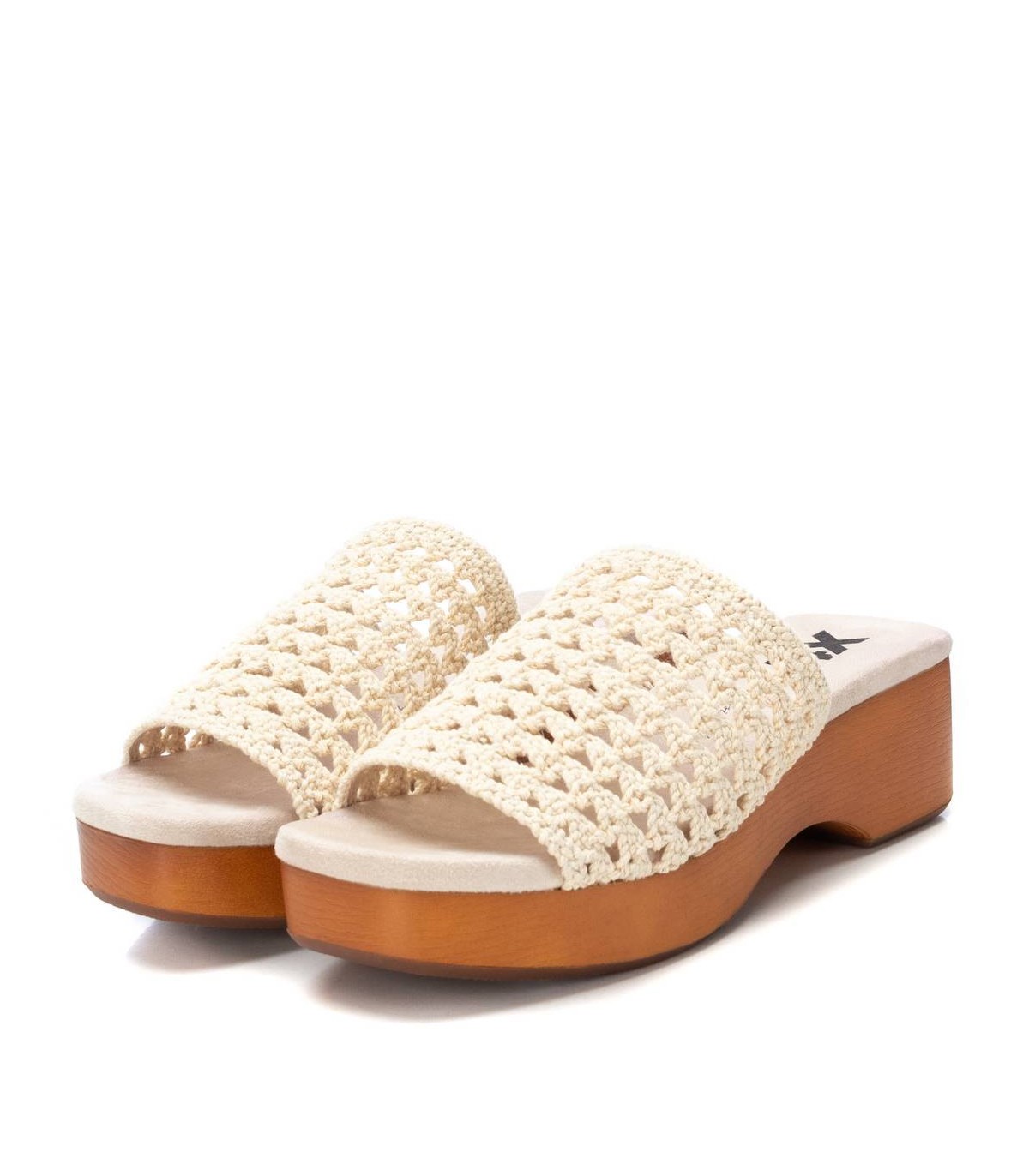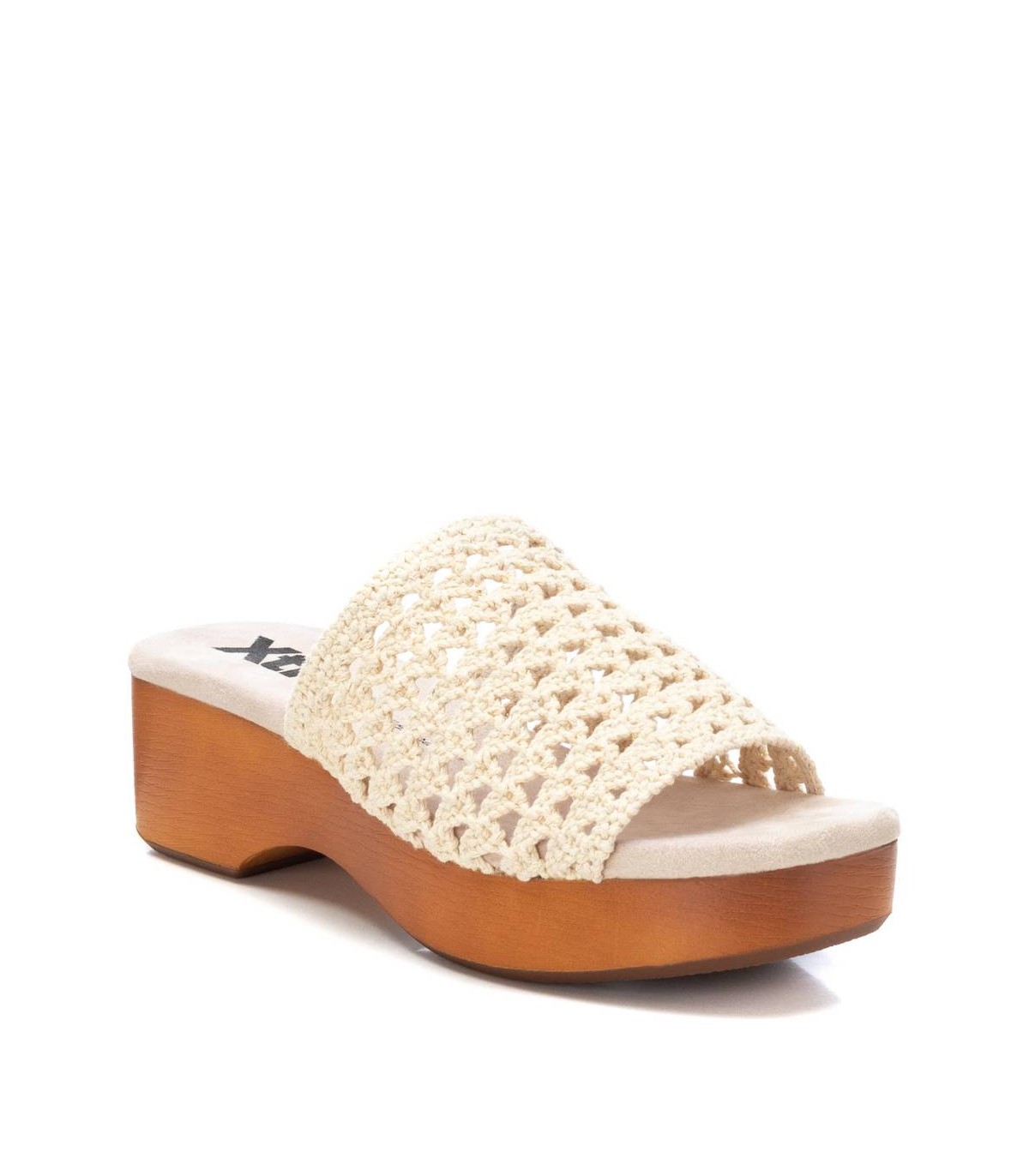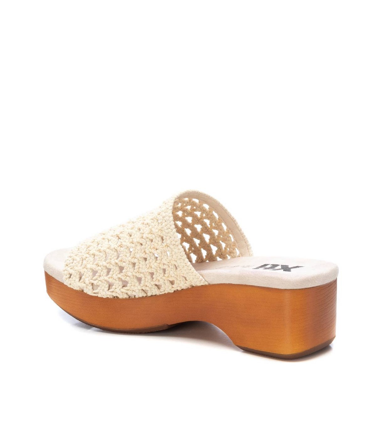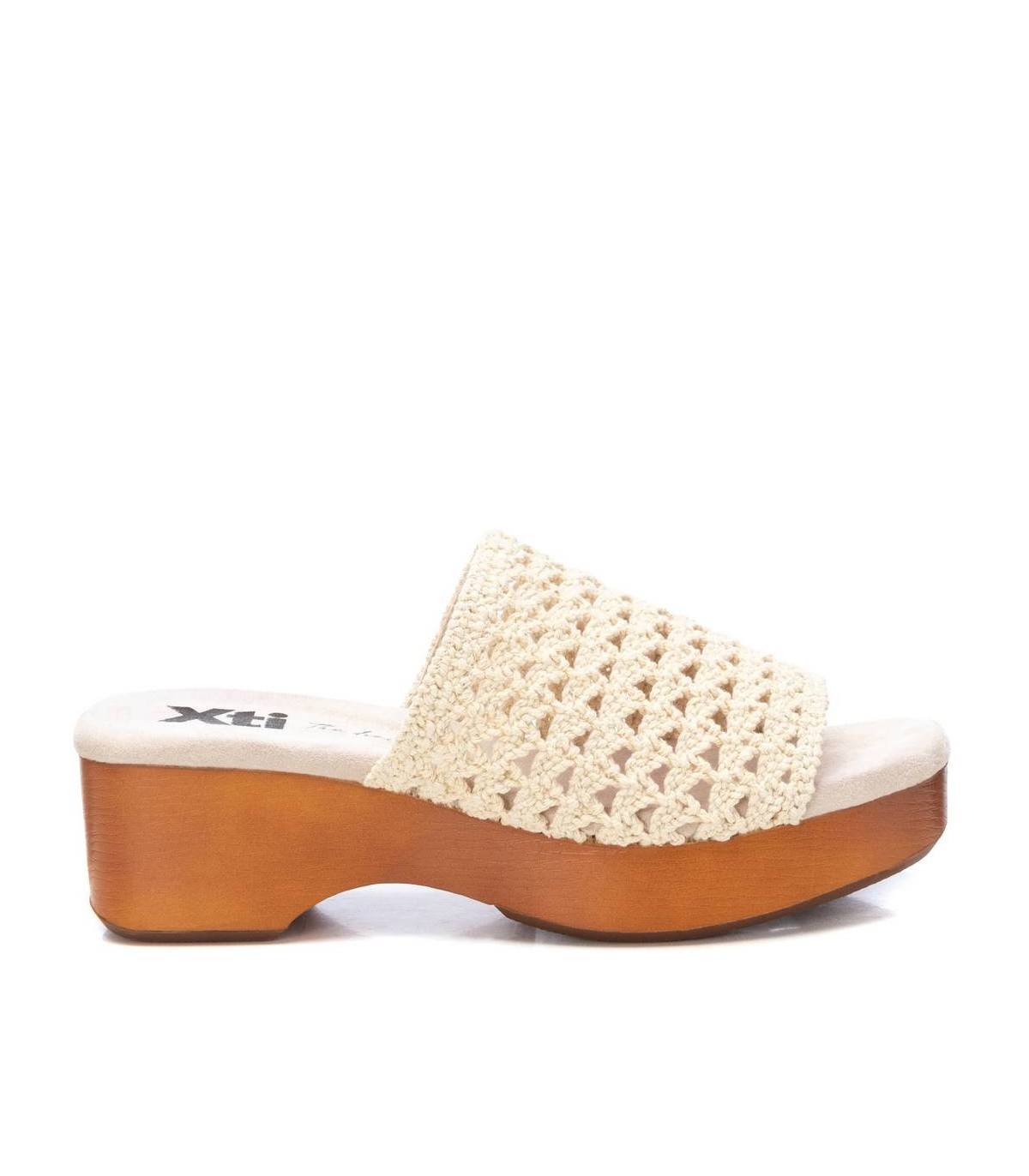 Sandalia de mujer, de la marca Xti. Fabricada en material textil tipo crochet. Diseño tipo pala. Tacón con plataforma madera y suela de goma antideslizante. Este modelo ha obtenido el certificado vegano por la organización mundial PETA (Organización de los derechos de los animales).