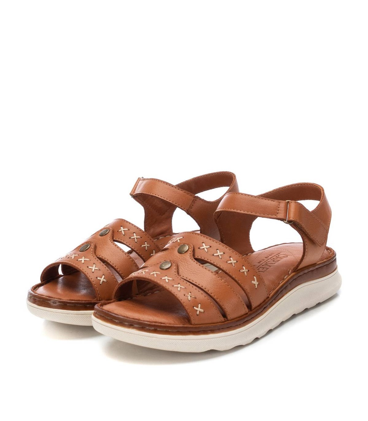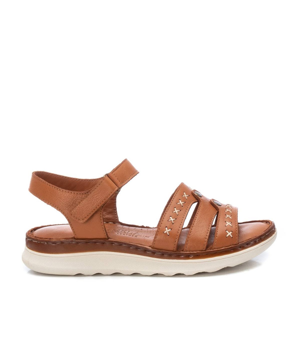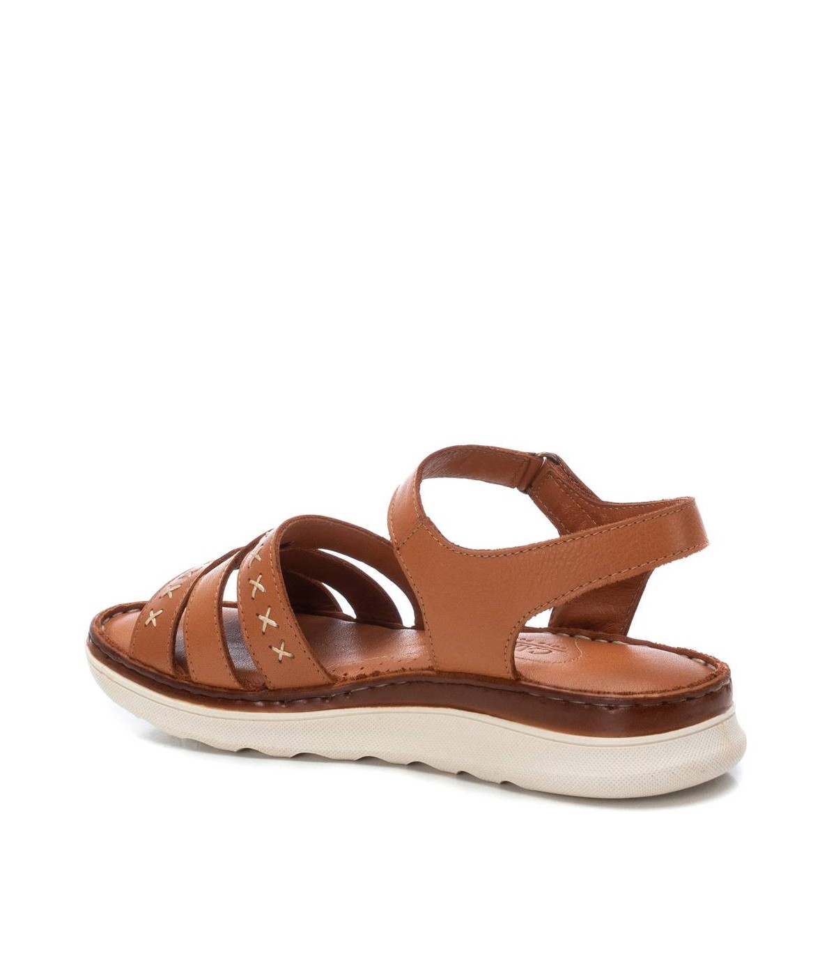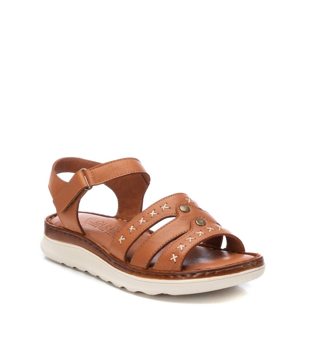 Sandalia de mujer, de la marca Carmela. Fabricada en piel de alta calidad. Modelo de tiras con sútil cosido decorativo. Pulsera al tobillo con cierre de velcro para su perfecta sujeción al tobillo. Suela antideslizante.