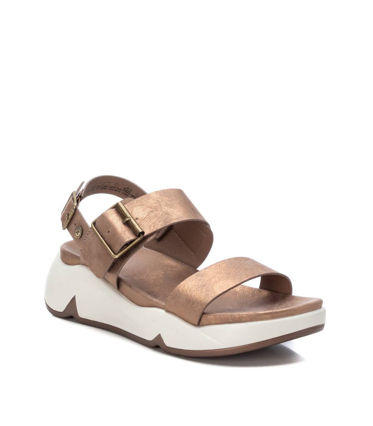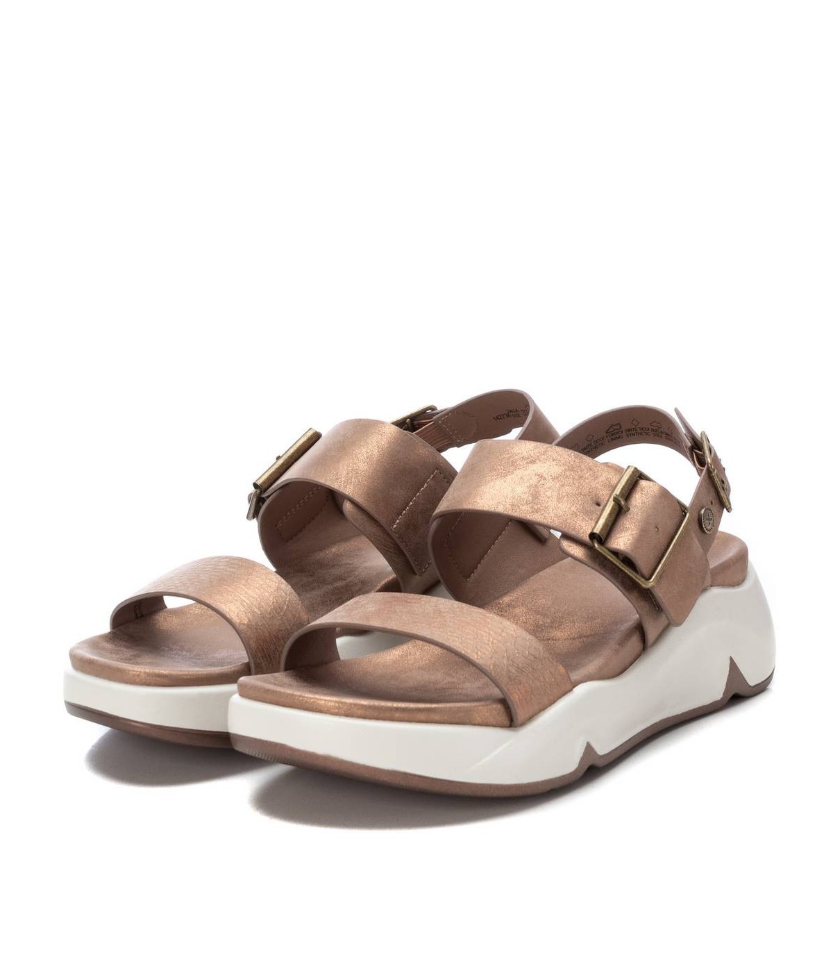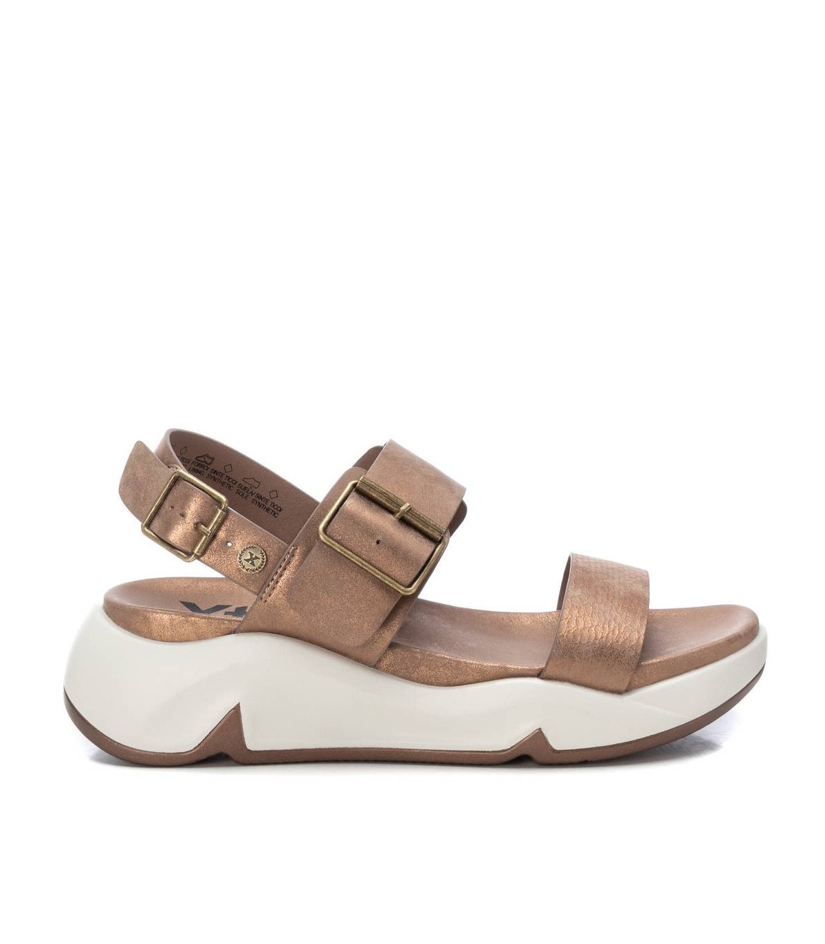 Sandalia de mujer, de la marca Xti. Fabricada en material que imita la piel. Modelo de doble pala, una de ellas con hebilla. Correa que sujeta al tobillo con hebilla metalica. Suela gruesa de goma antideslizante. Este modelo ha obtenido el certificado vegano por la organización mundial PETA (Organización de los derechos de los animales).