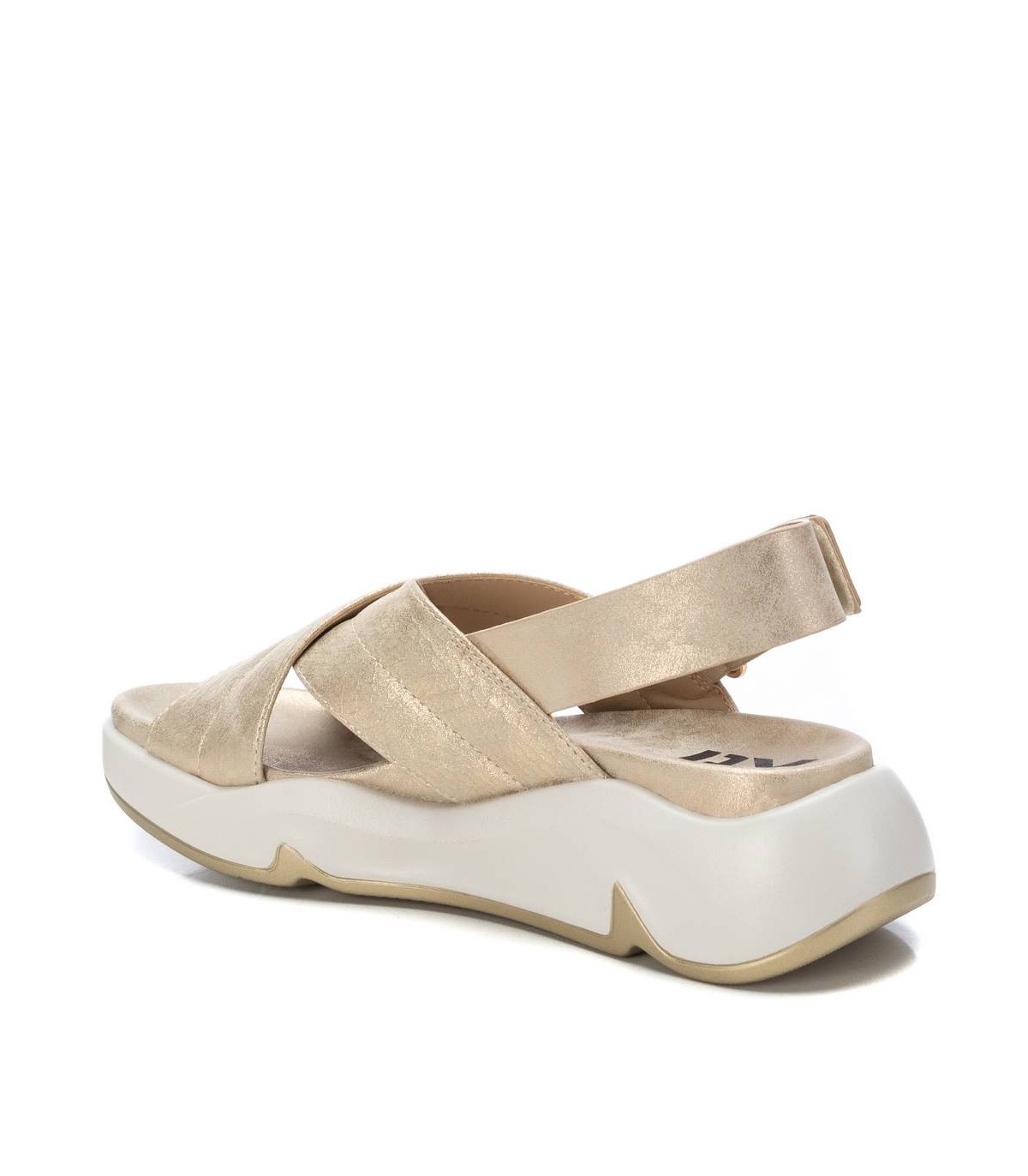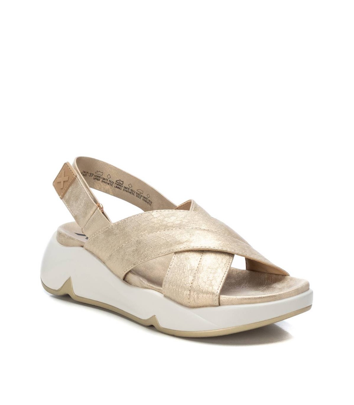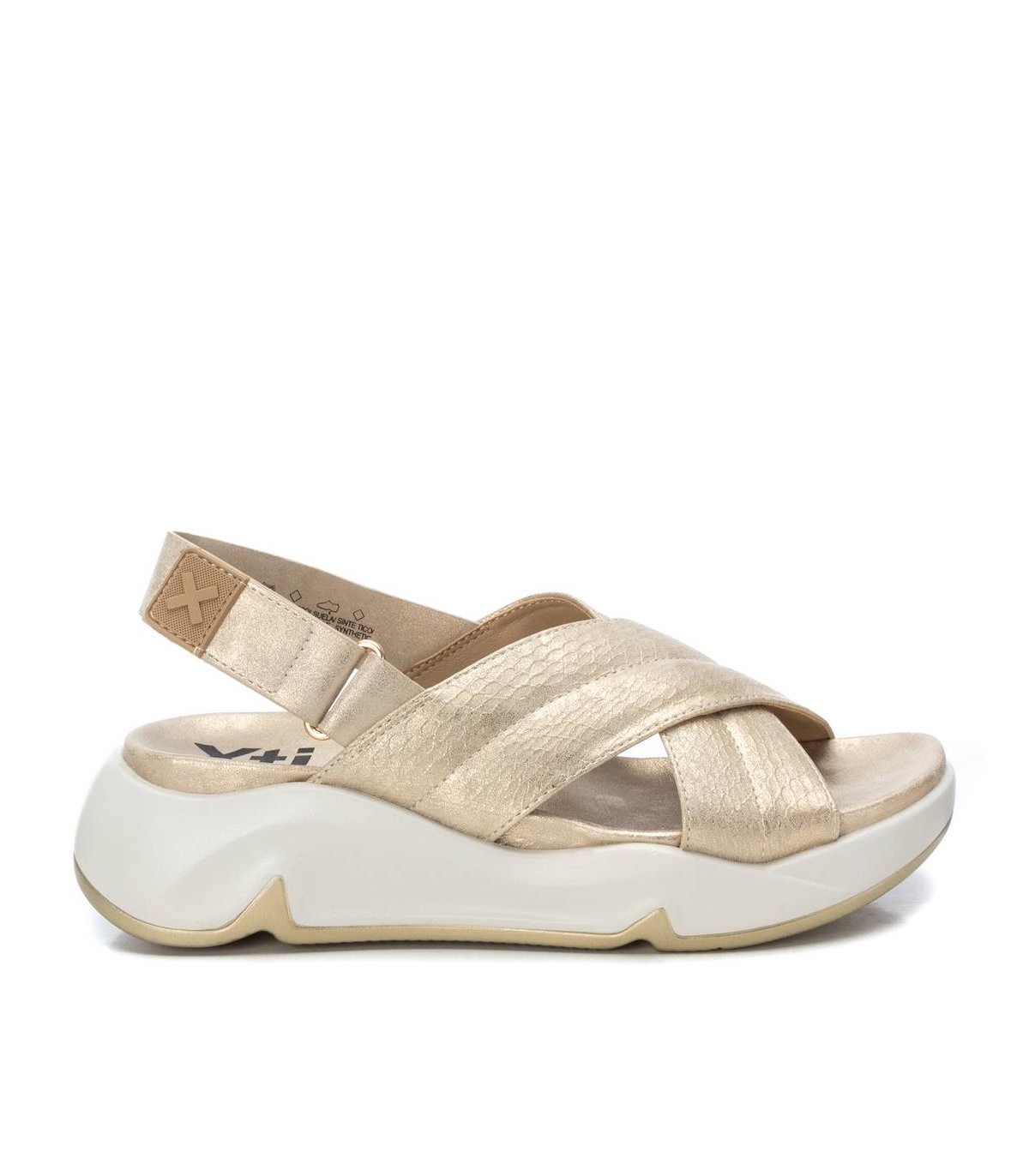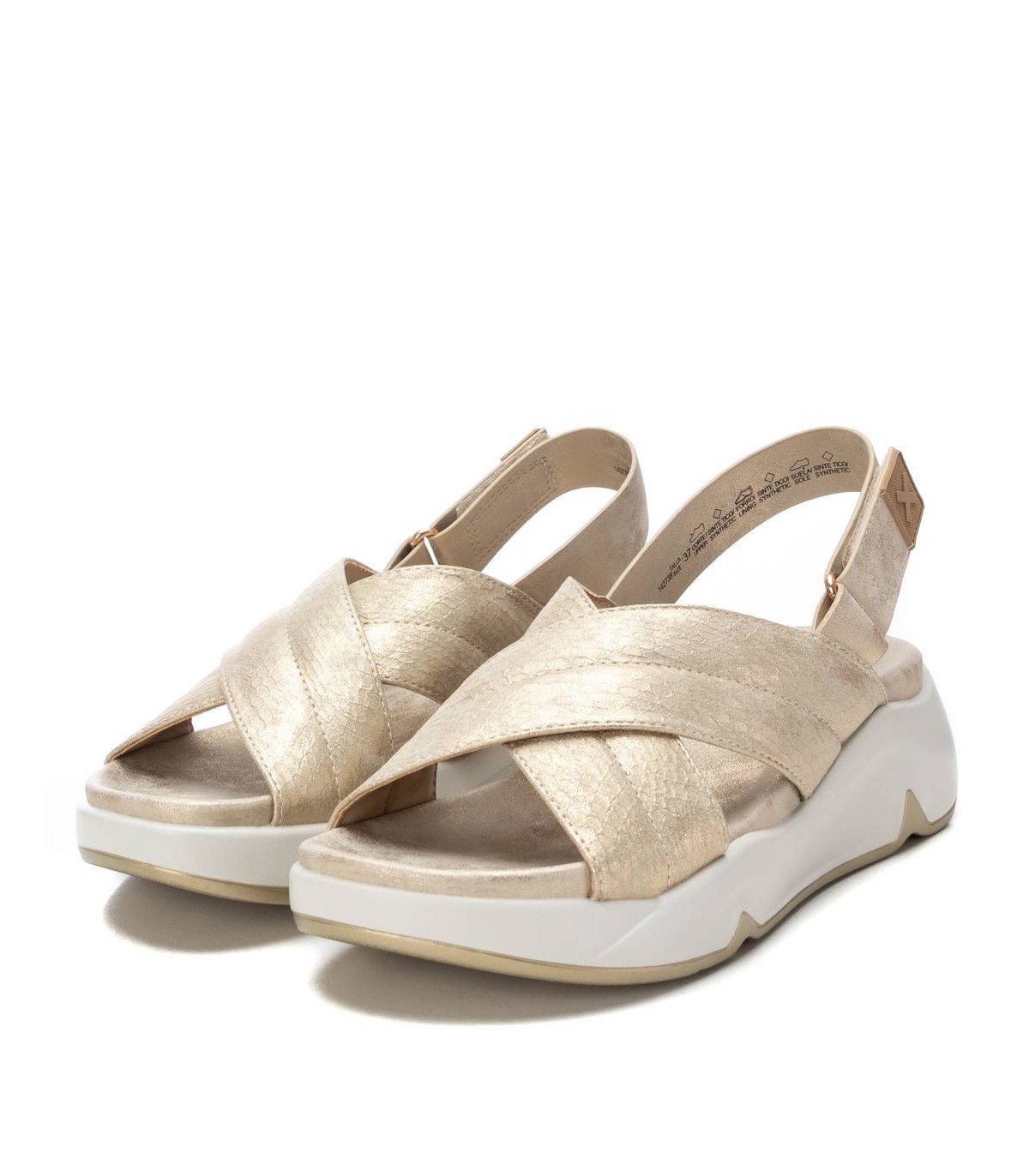 Sandalia de mujer, de la marca Xti. Fabricada en material que imita la piel, de alta calidad con acabado metalizado. Modelo de pala cruzada. Cierre mediante tira adherente. Suela de goma antideslizante. Este modelo ha obtenido el certificado vegano por la organización mundial PETA (Organización de los derechos de los animales).