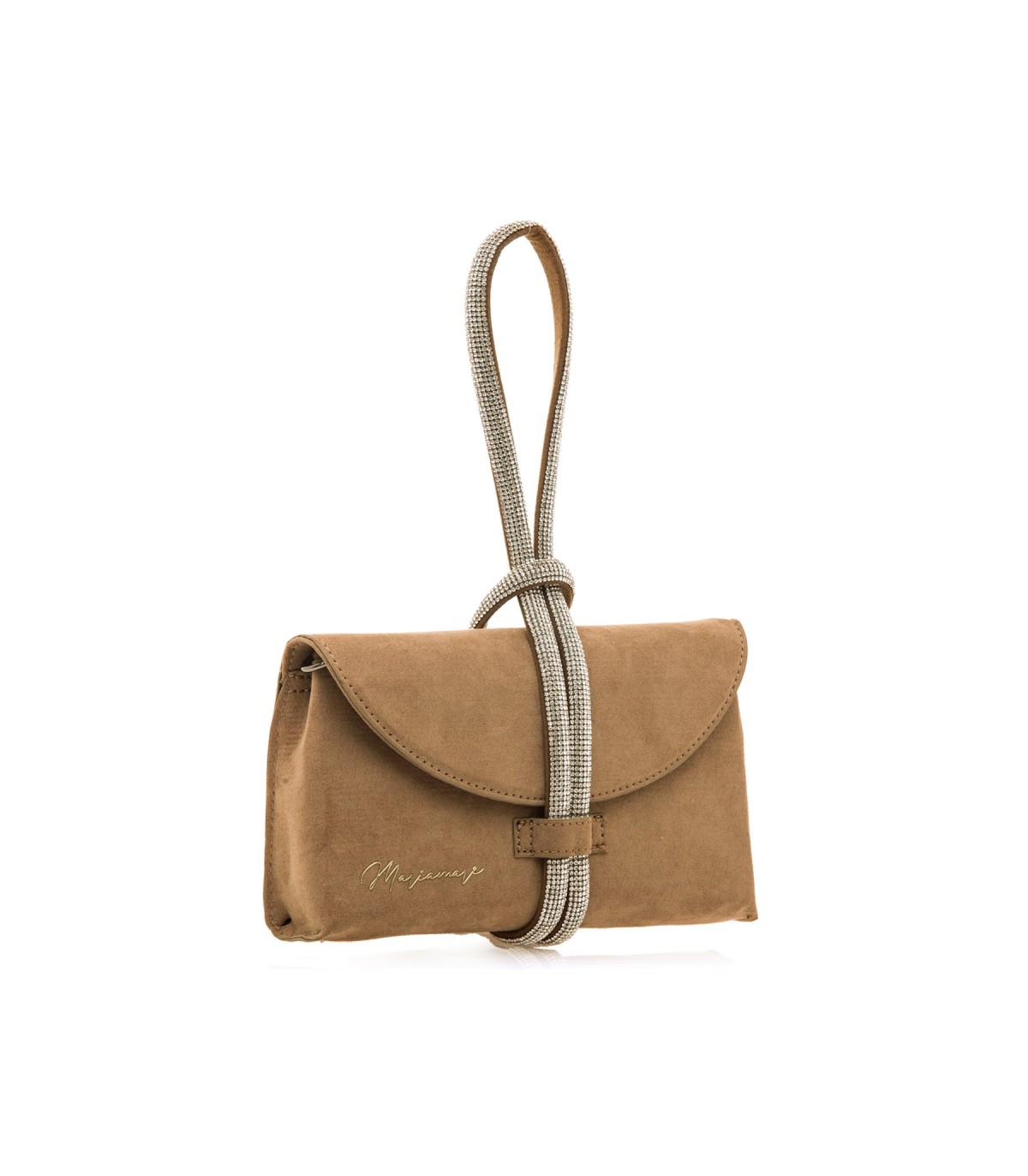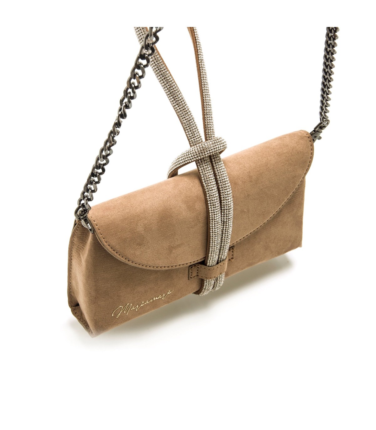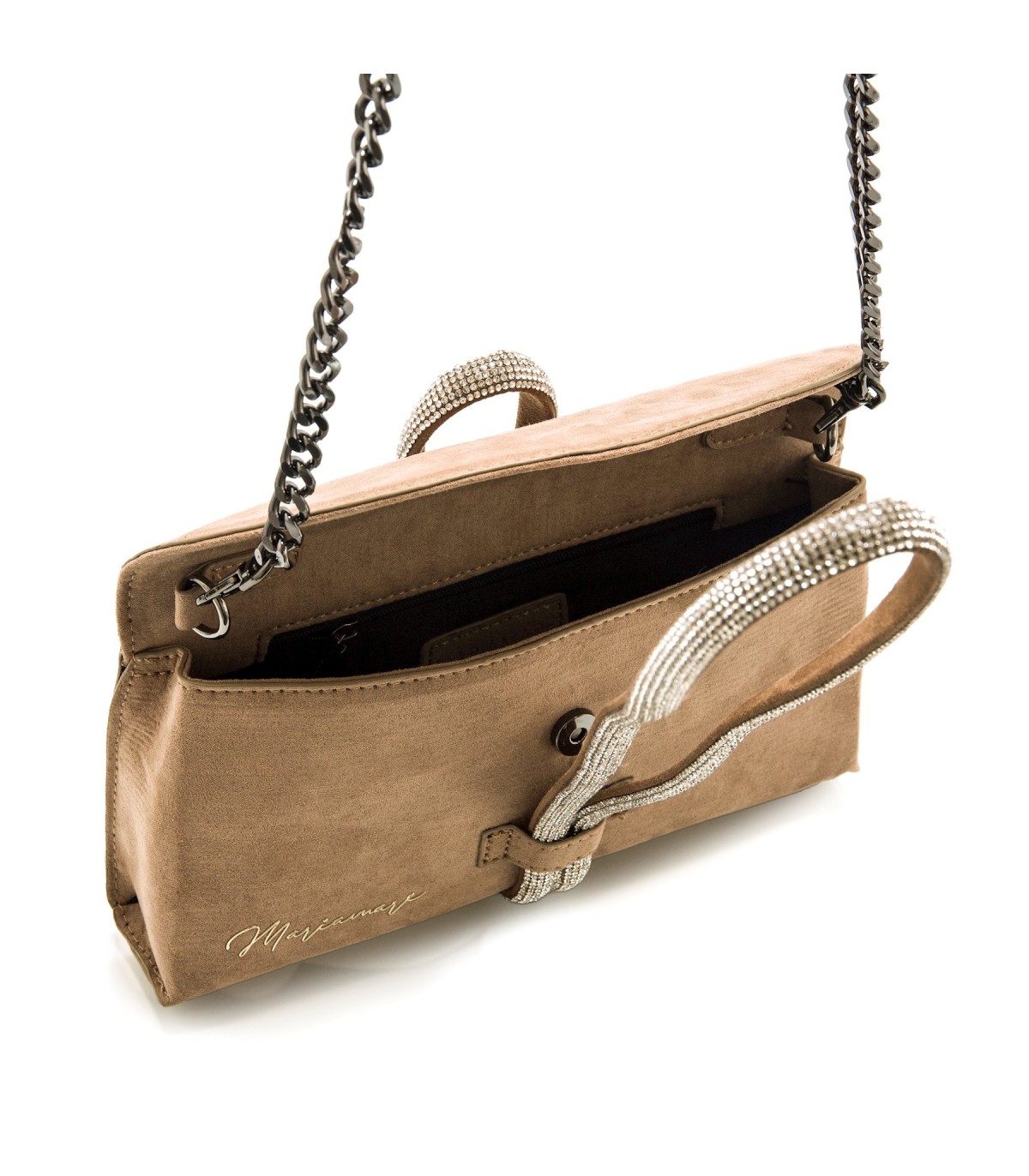 Bolso Roun color taupe para mujer, de Mariamare. Hecho con un material afelpado y un estilo moderno y versátil. Tiene cierre doble, magnético, y un brazalete de cristales que, además de hacerlo seguro, proporciona elegancia junto a su cadena plateada desmontable. Ideal para ocasiones especiales. Este bolso de noche puede llevarse a modo bandolera o cartera. ¡Conoce Roun de Mariamare!