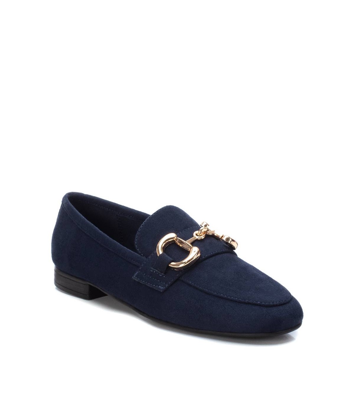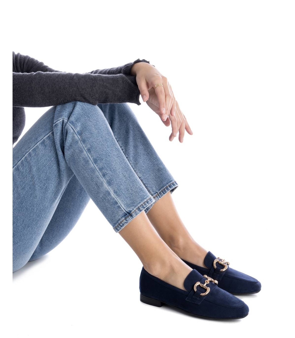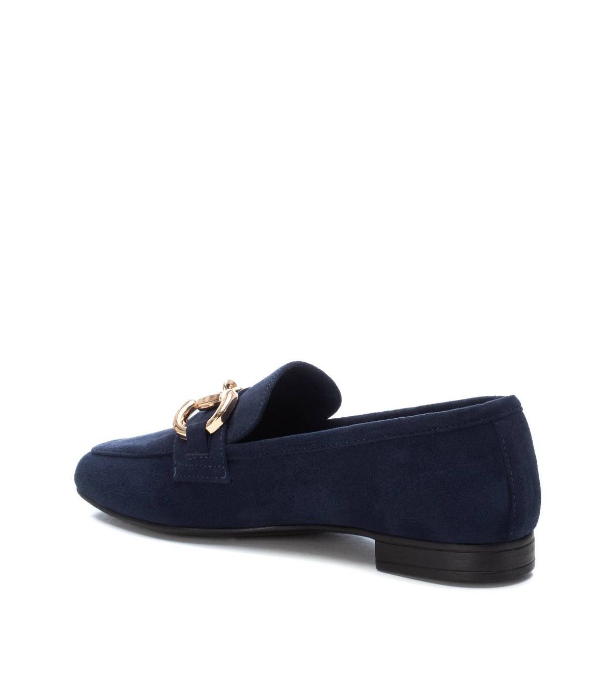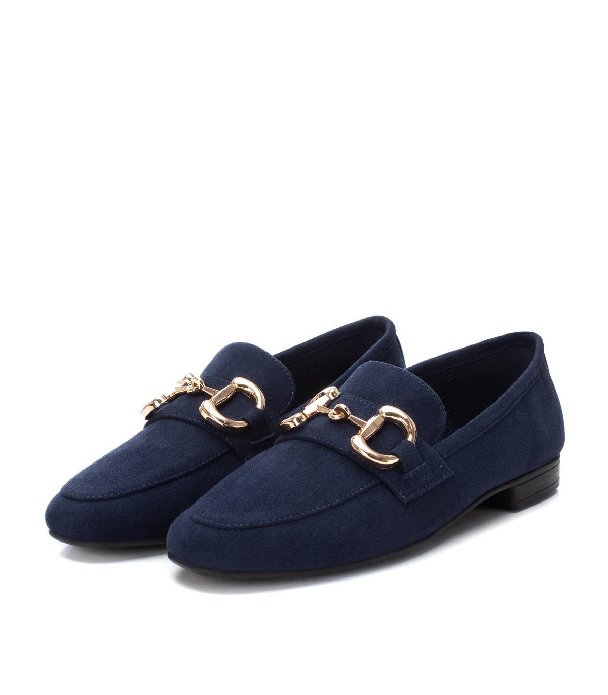 Zapato de mujer, de la marca Xti. Fabricado en antelina. Adorno metálico en tendencia. Suela plana de goma antidesliante. Este modelo ha obtenido el certificado vegano por la organización mundial PETA (Organización de los derechos de los animales).
