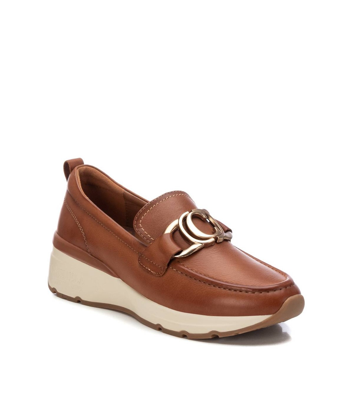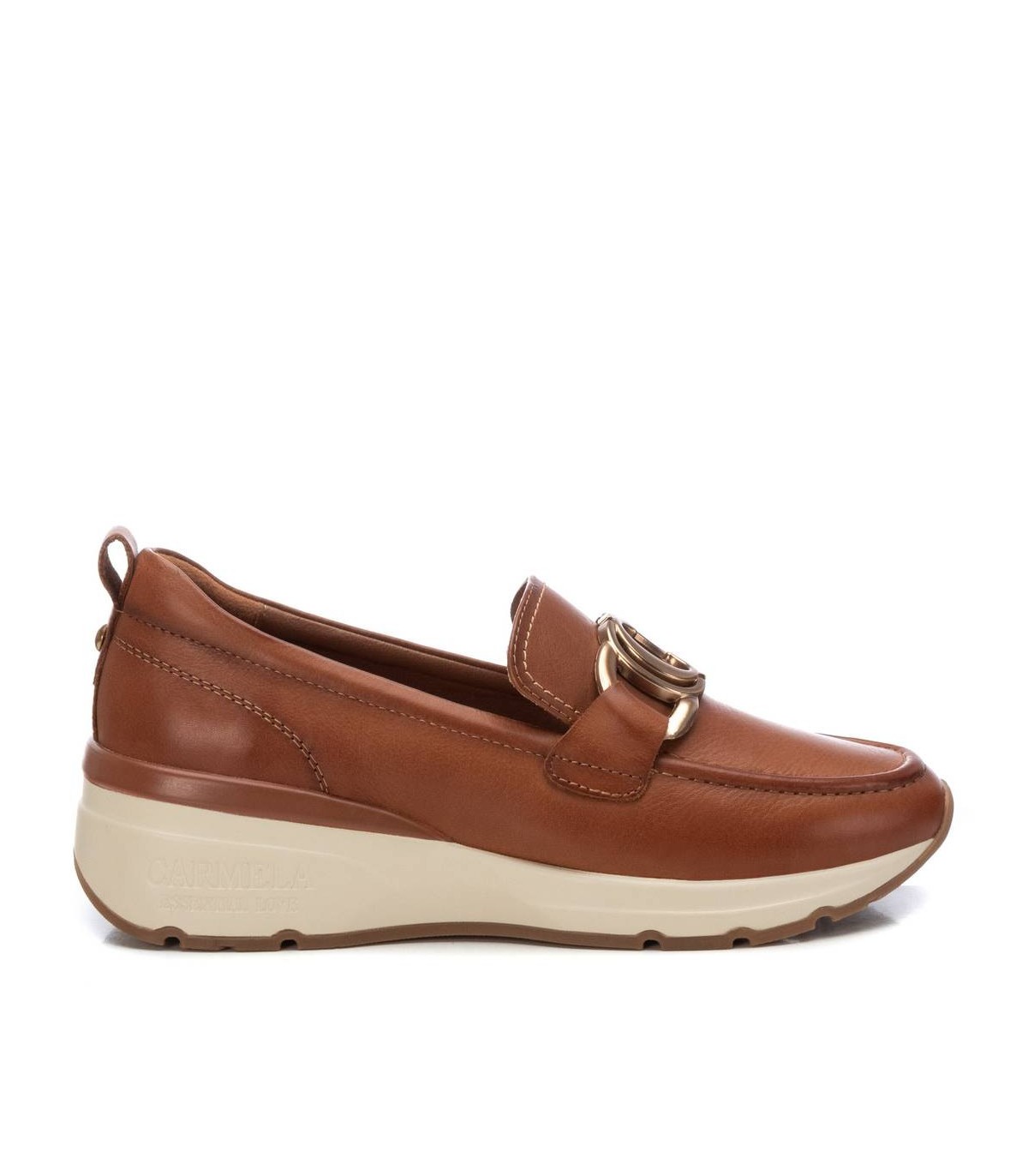 Mocasín de mujer, de la marca Carmela. Fabricada en piel de alta calidad. Antifaz decorativo con detalle metálico. Tirador trasero para facilitar la puesta. Piso deportivo con volumen y suelo de goma antideslizante. Con plantilla extraíble.