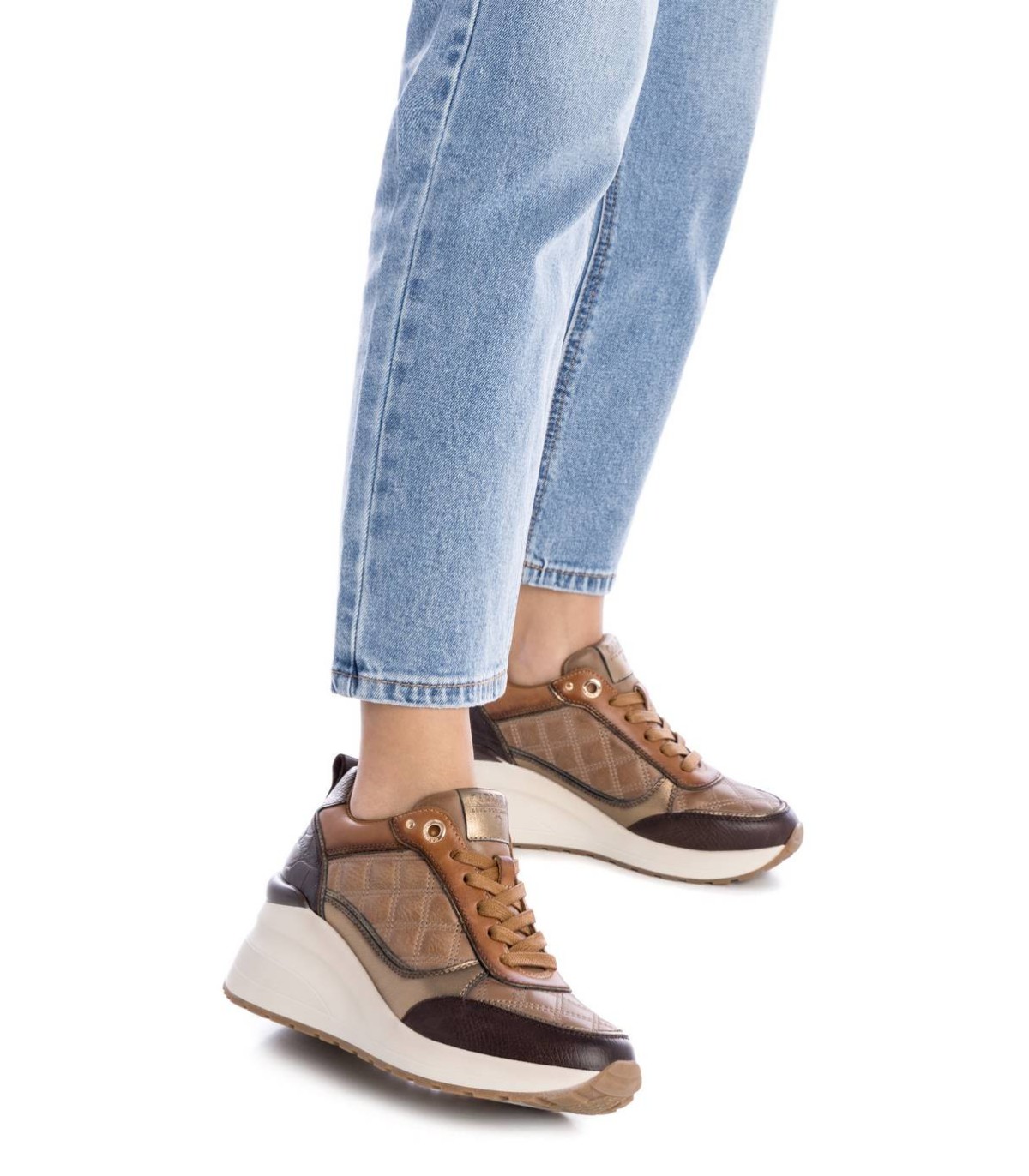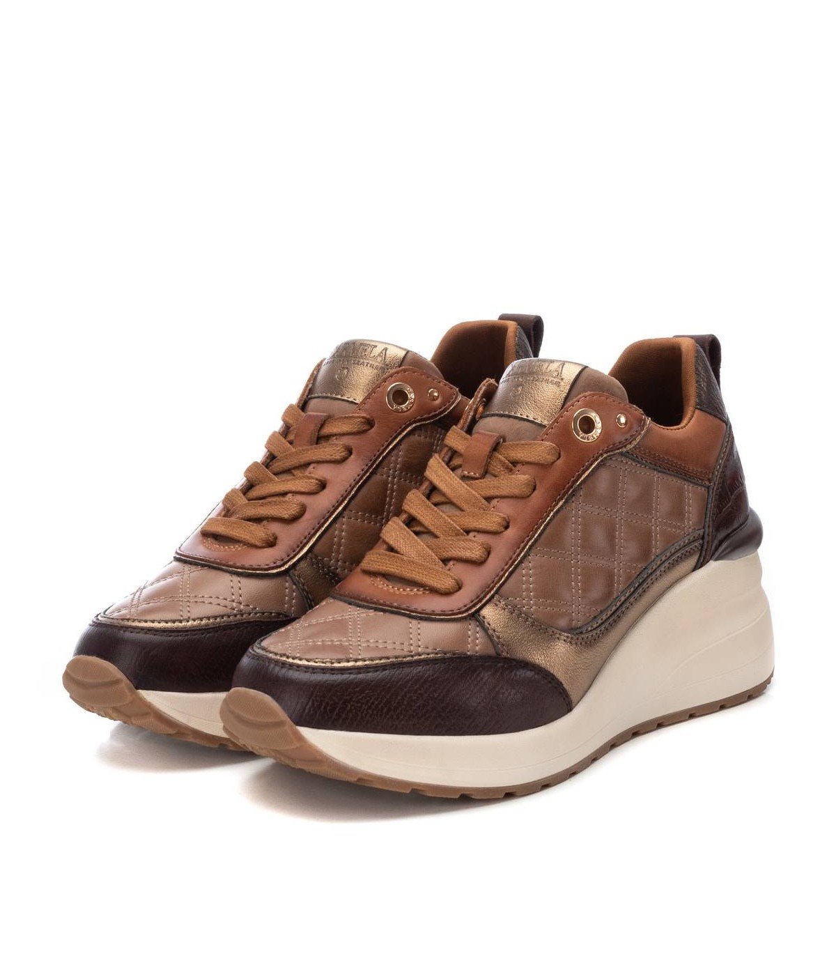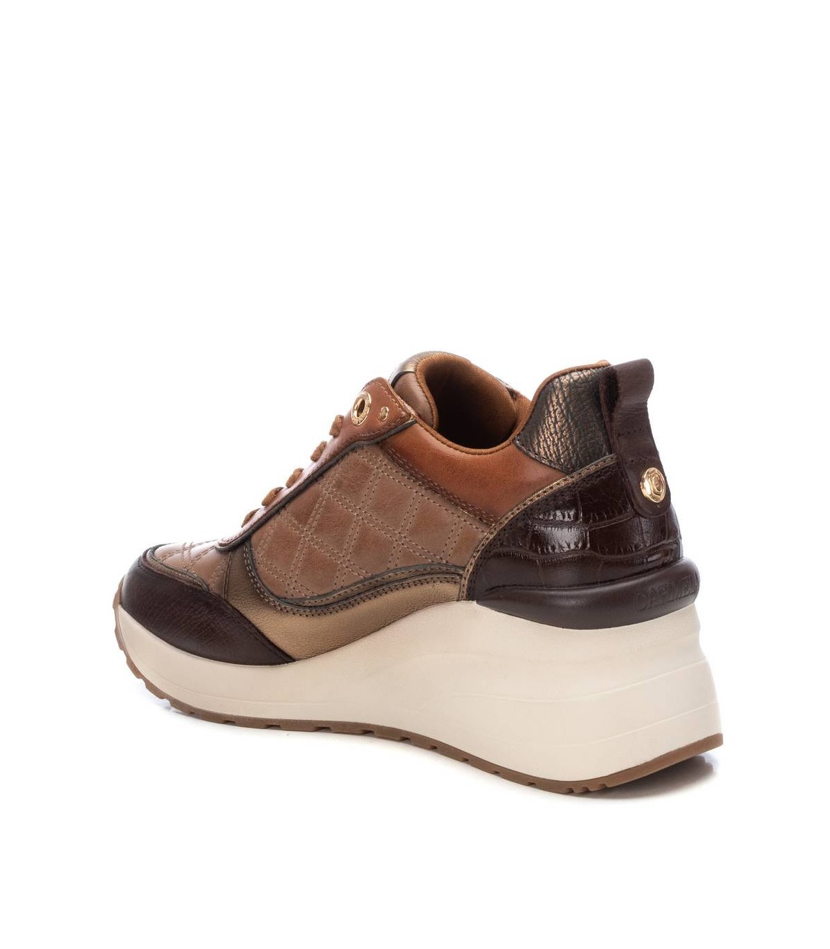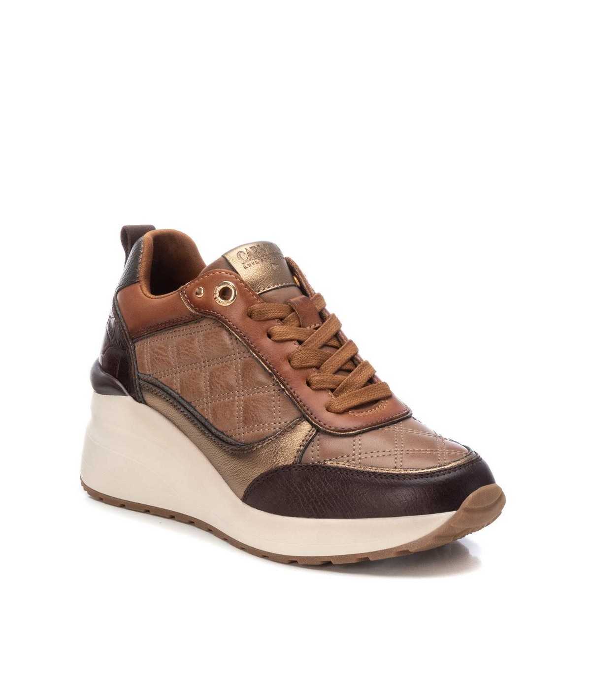 Zapatilla de mujer, de la marca de Carmela. Fabricado en piel de alta calidad. Cierre mediante cordones ajustables. Detalles metalizados. Cuña de 6 cm. Suela de goma antideslizante. Con plantilla extraíble.