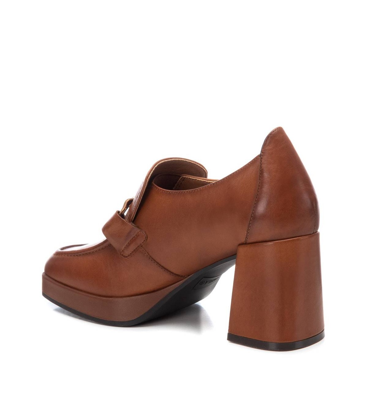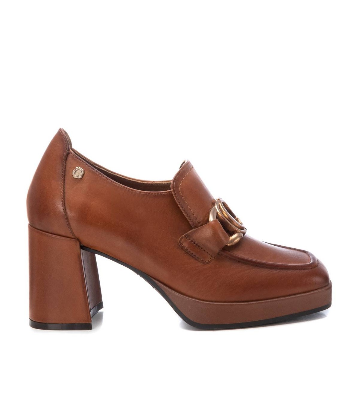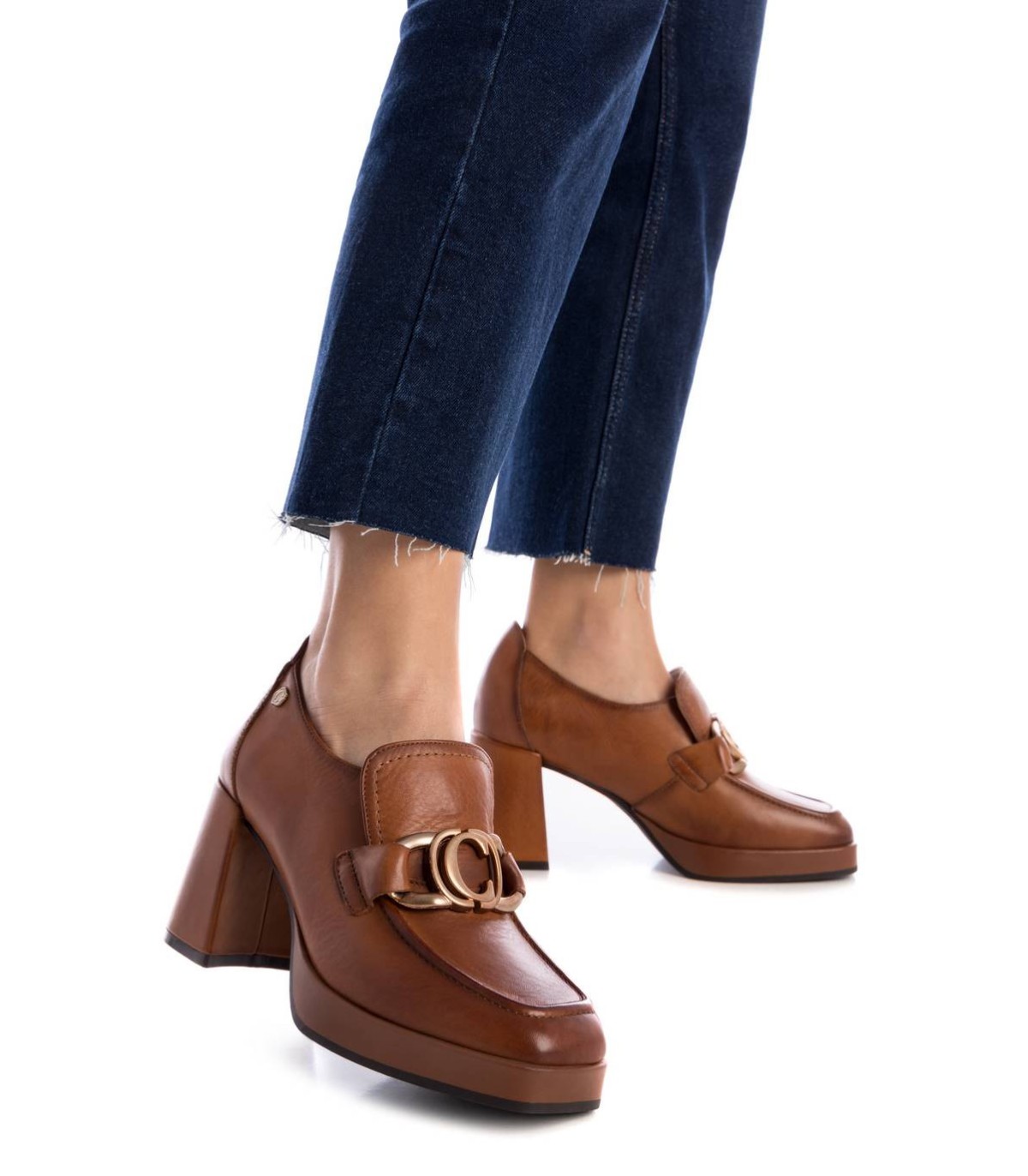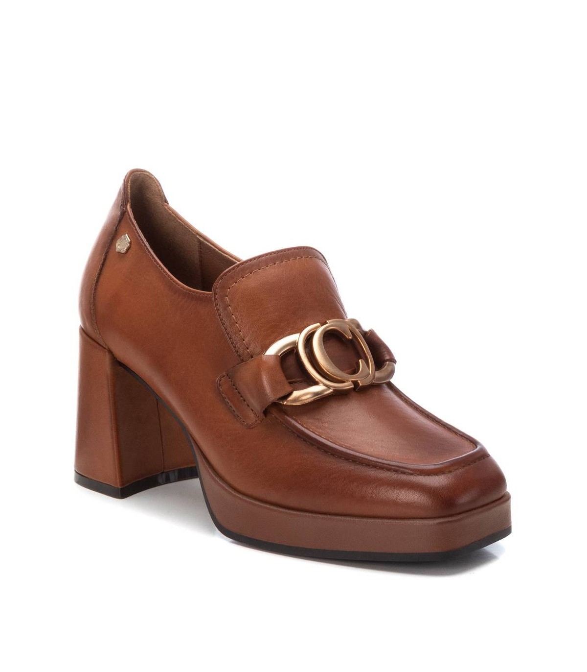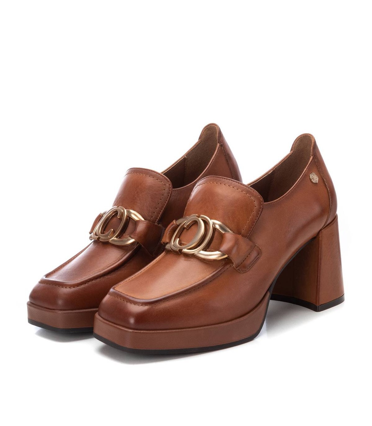 Mocasín de mujer, de la marca Carmela. Fabricado en piel de alta calidad. Con antifaz decorativo y detalle metálico decorativo. Estiloso. Tacón al tono, suela de goma antideslizante.
