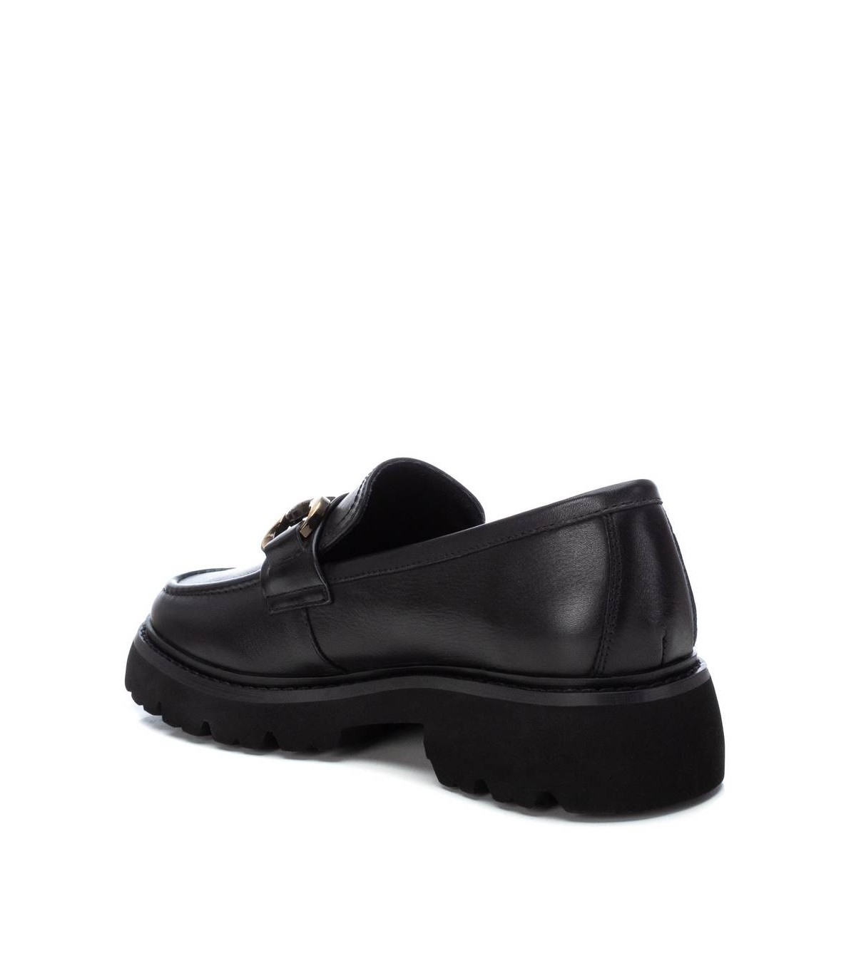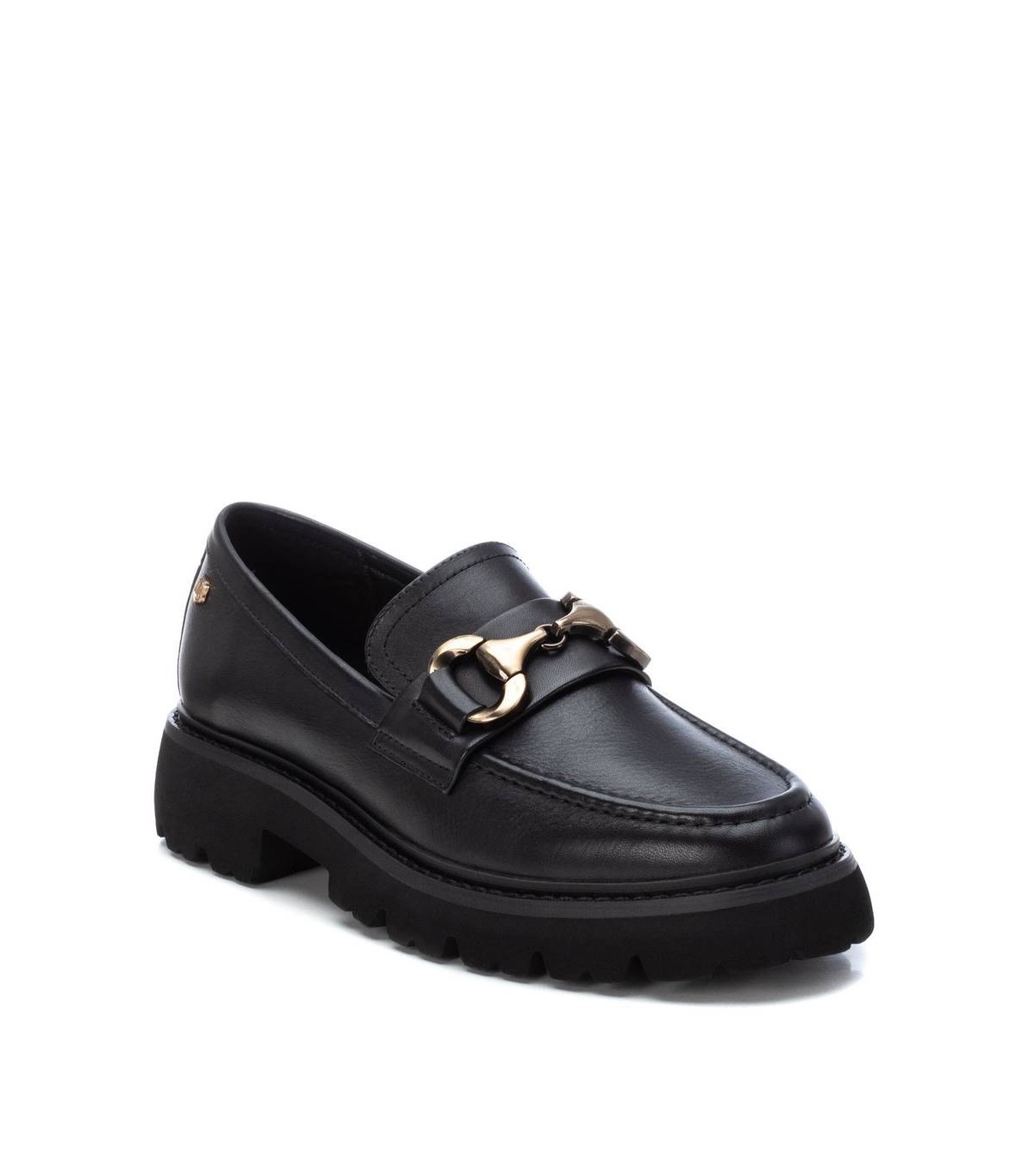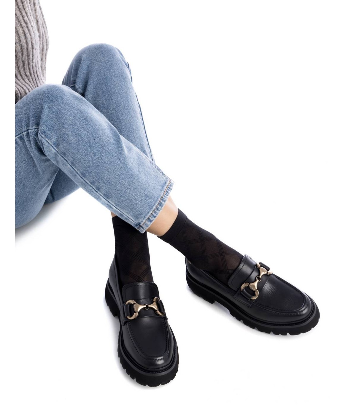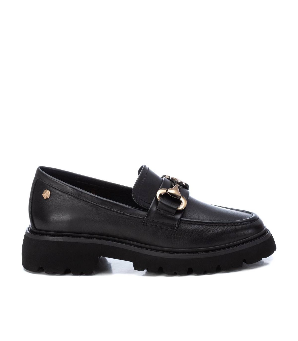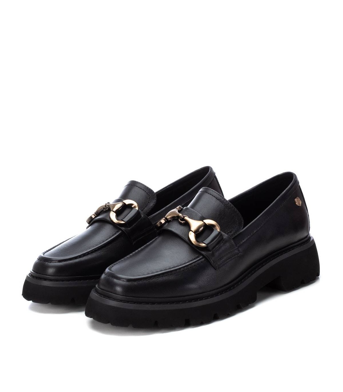 Mocasín de mujer, de la marca Carmela. Fabricado en piel de alta calidad. Detalle antifaz y cadena decorativa en el frente. Suela gruesa y antideslizante y cómoda planta.