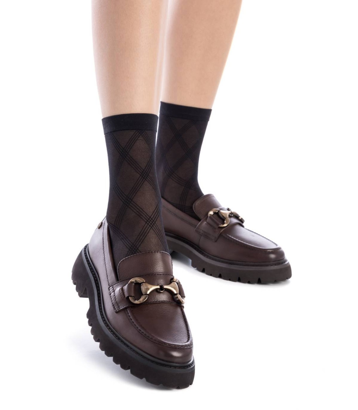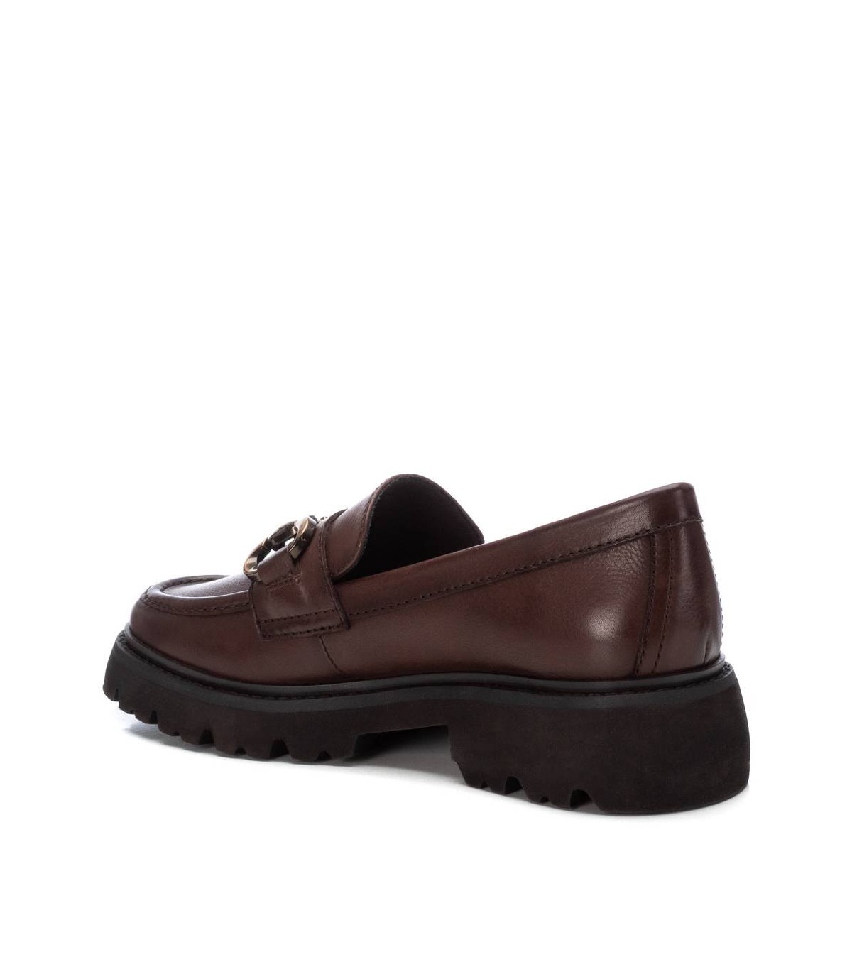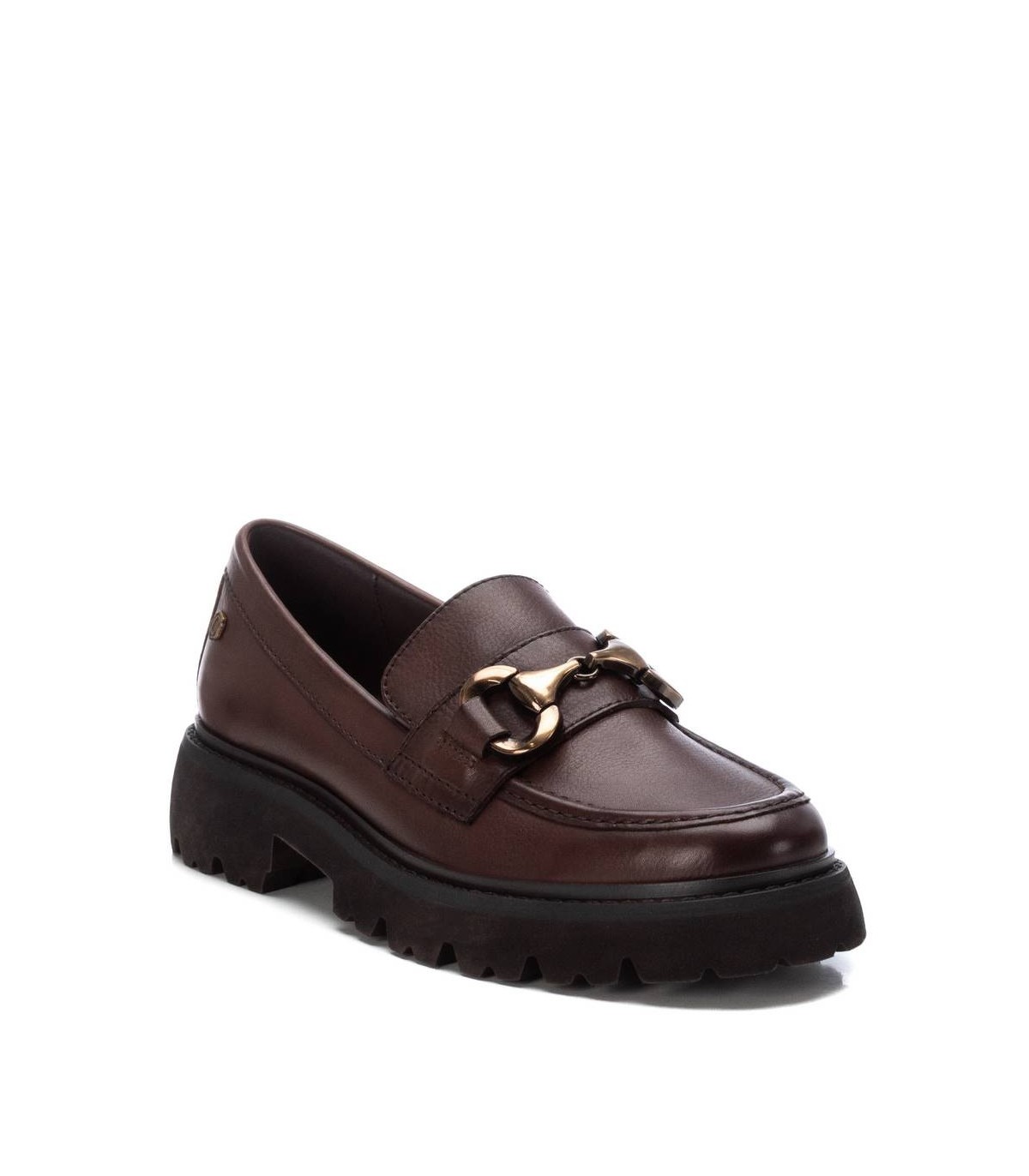 Mocasín de mujer, de la marca Carmela. Fabricado en piel de alta calidad. Detalle antifaz y cadena decorativa en el frente. Suela gruesa y antideslizante y cómoda planta.