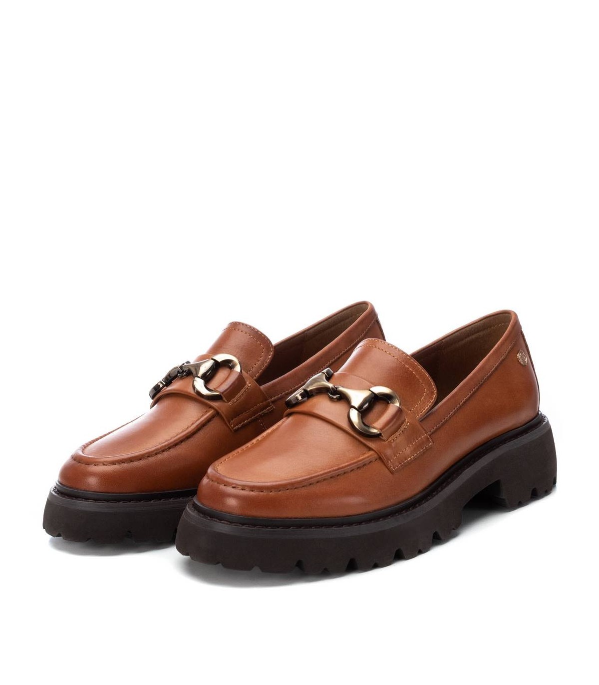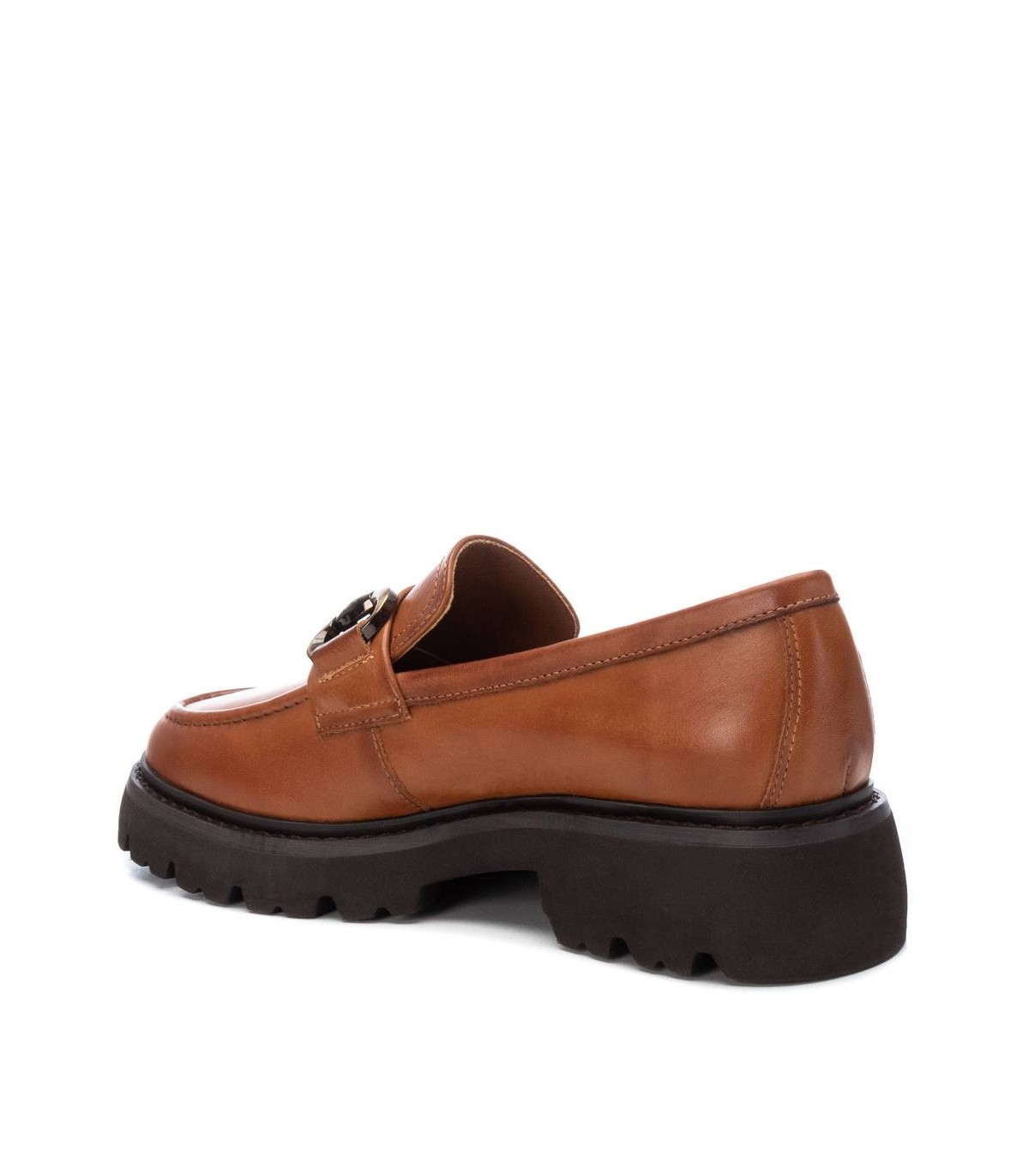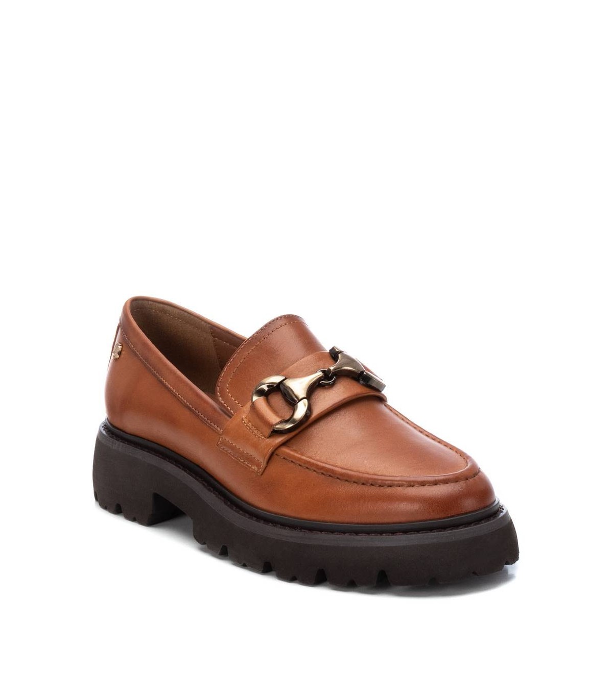 Mocasín de mujer, de la marca Carmela. Fabricado en piel de alta calidad. Detalle antifaz y cadena decorativa en el frente. Suela gruesa y antideslizante y cómoda planta.