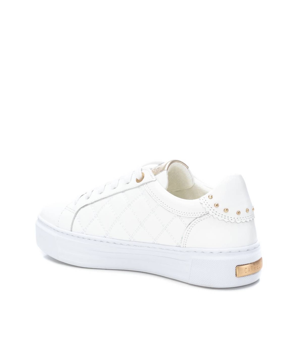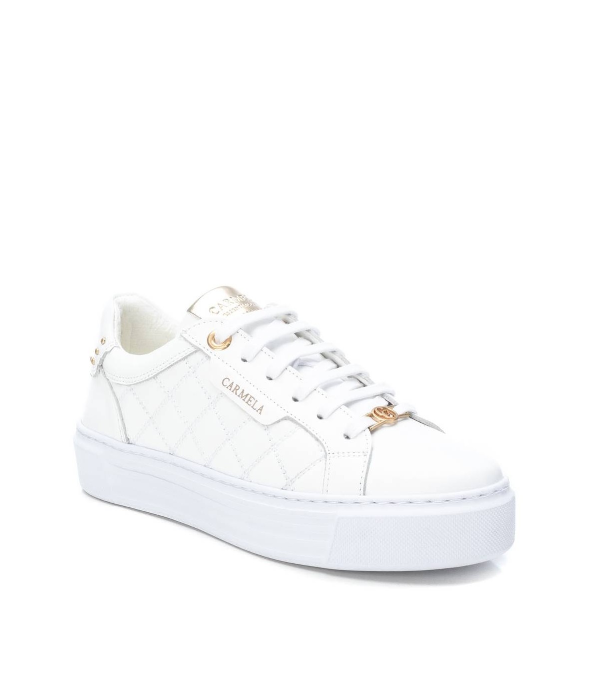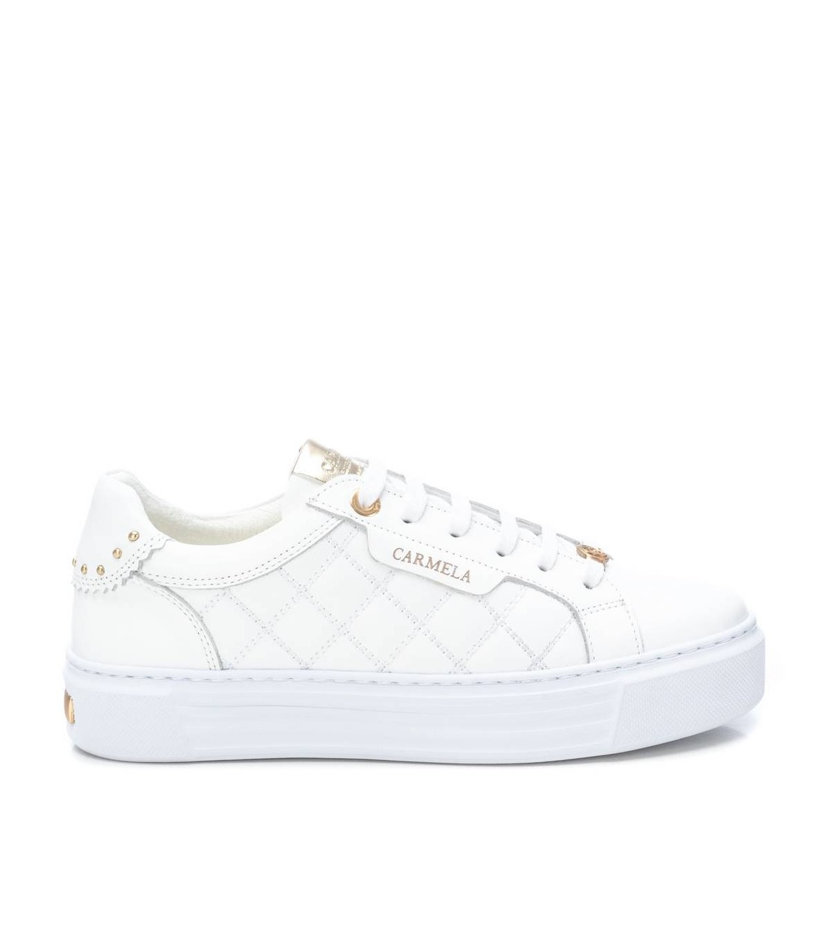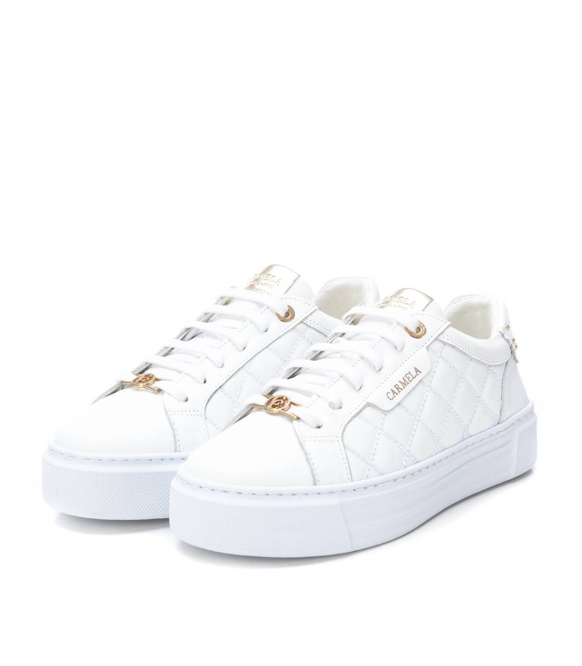 Zapatilla de mujer, de la marca Carmela. Fabricado en piel de alta calidad. Cordones ajustables. Efecto acolchado y detalles metalizados, hacen de este modelo un básico para tu armario. Suelo de cómoda goma antideslizante. Con plantilla extraíble.