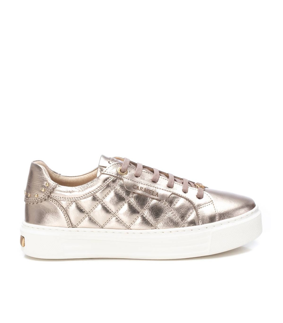 Zapatilla de mujer, de la marca Carmela. Fabricado en piel de alta calidad. Cordones ajustables. Efecto acolchado y detalles metalizados, hacen de este modelo un básico para tu armario. Suelo de cómoda goma antideslizante. Con plantilla extraíble.