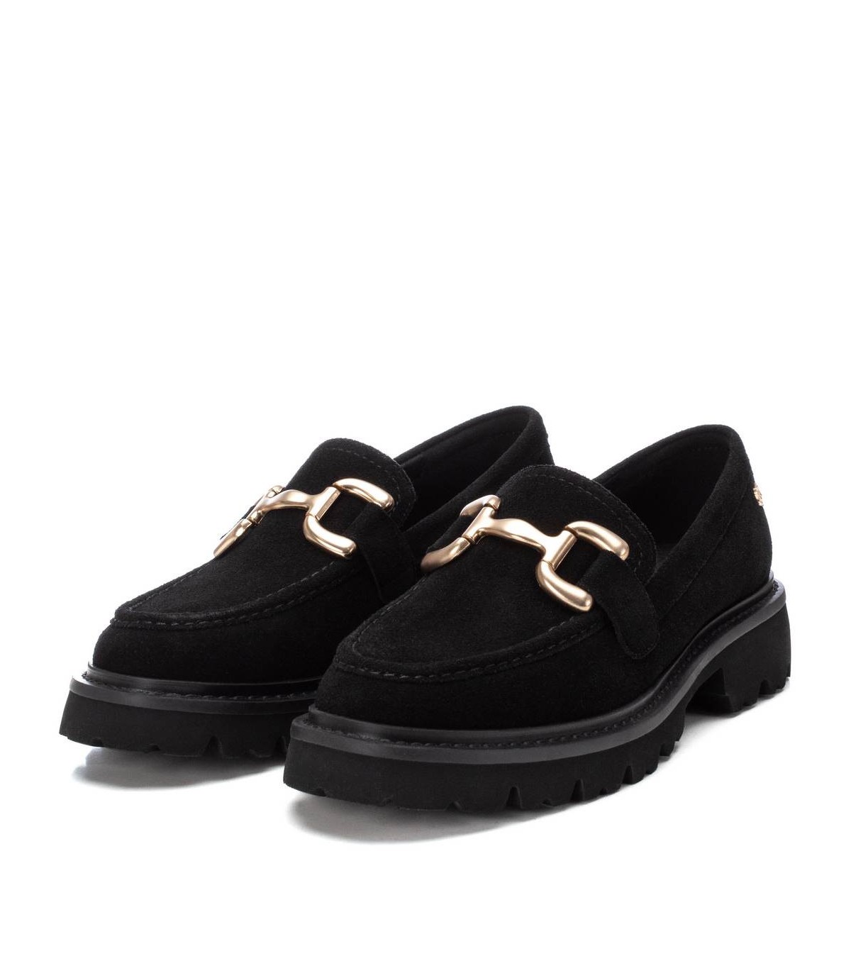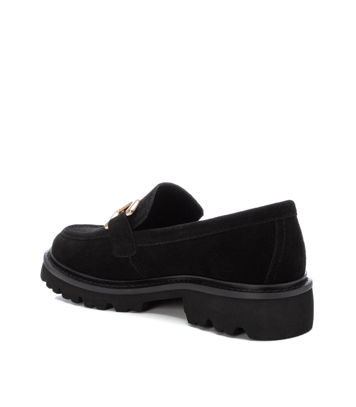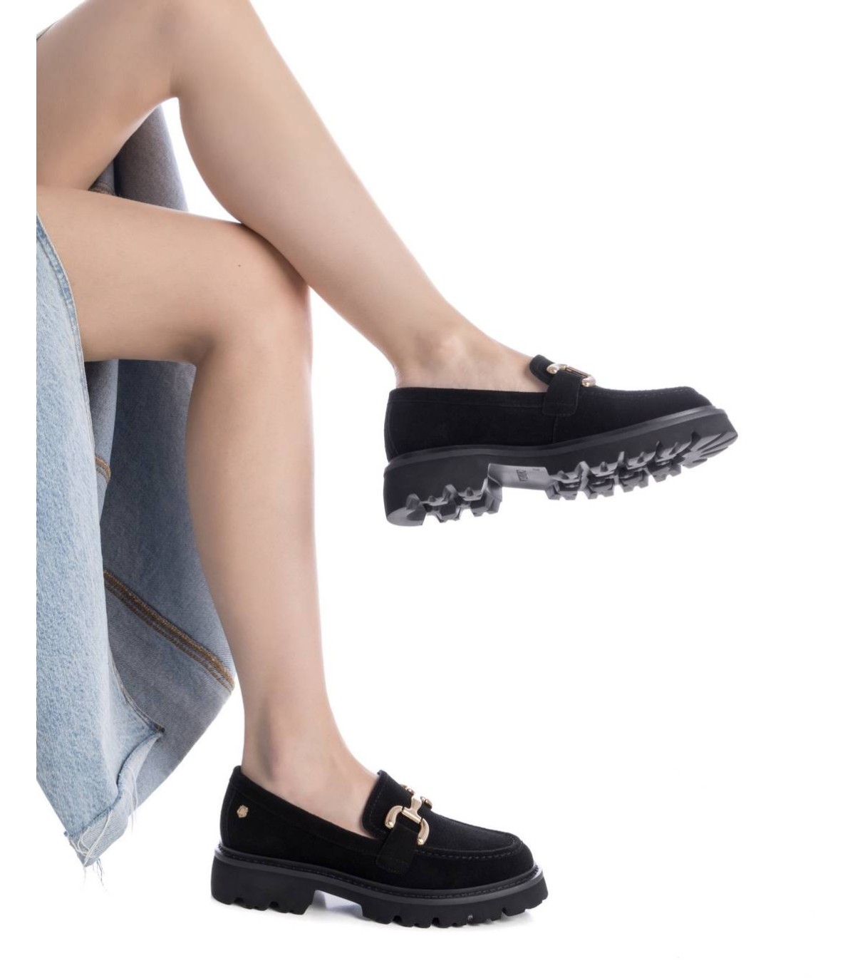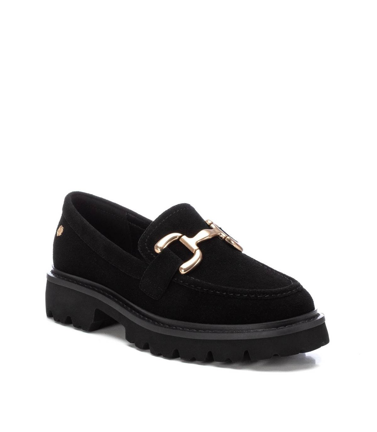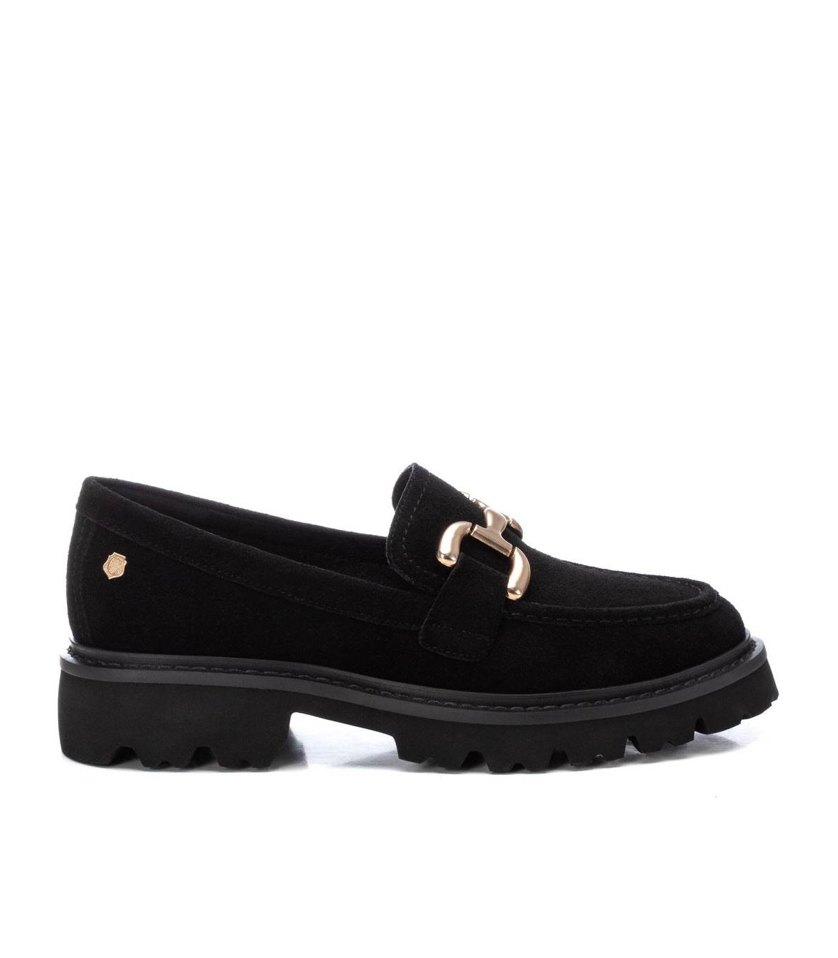 Mocasín de mujer, de la marca Carmela. Fabricado en serraje de alta calidad. Antifaz en el frente con cadena metálica. Suela gruesa y dentada antideslizante.