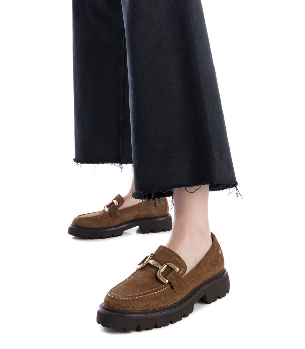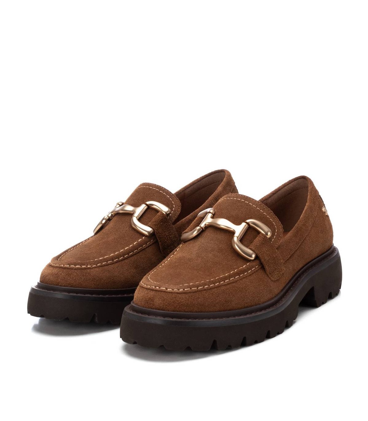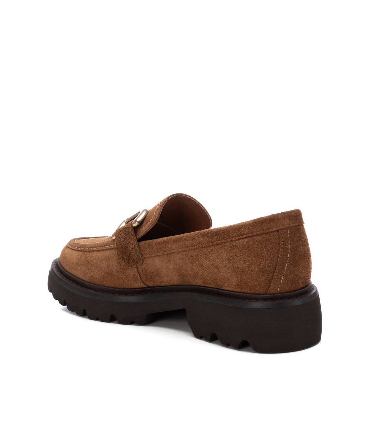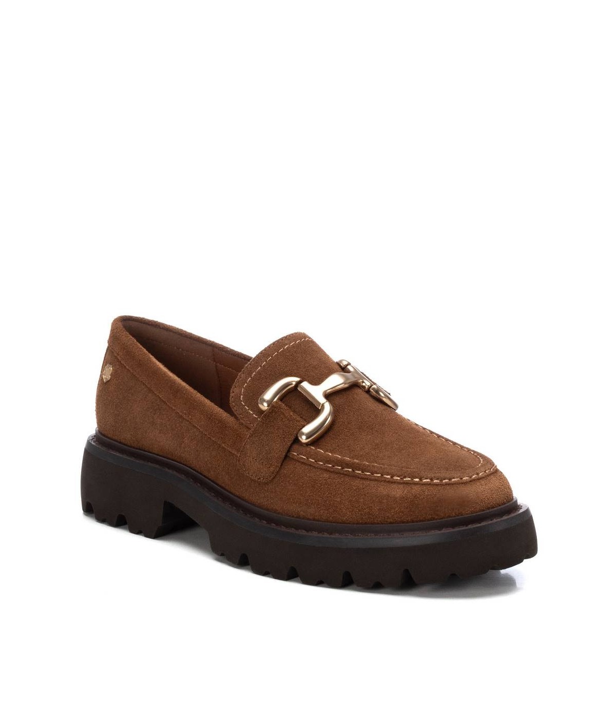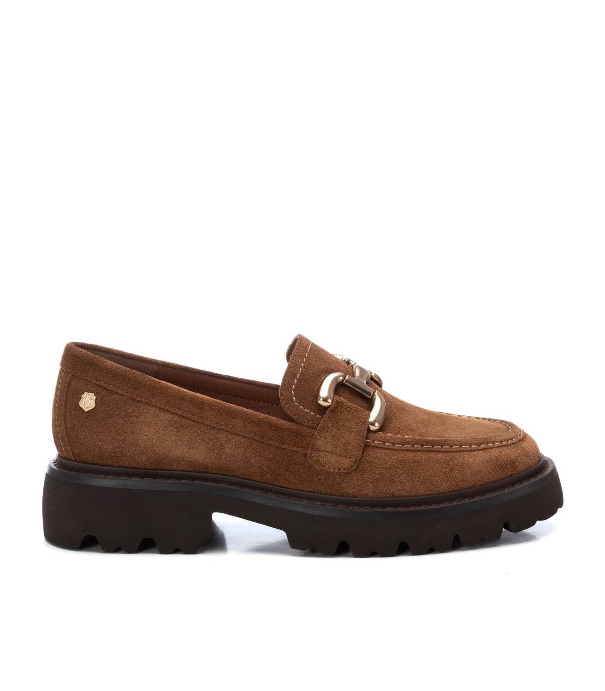 Mocasín de mujer, de la marca Carmela. Fabricado en serraje de alta calidad. Antifaz en el frente con cadena metálica. Suela gruesa y dentada antideslizante.