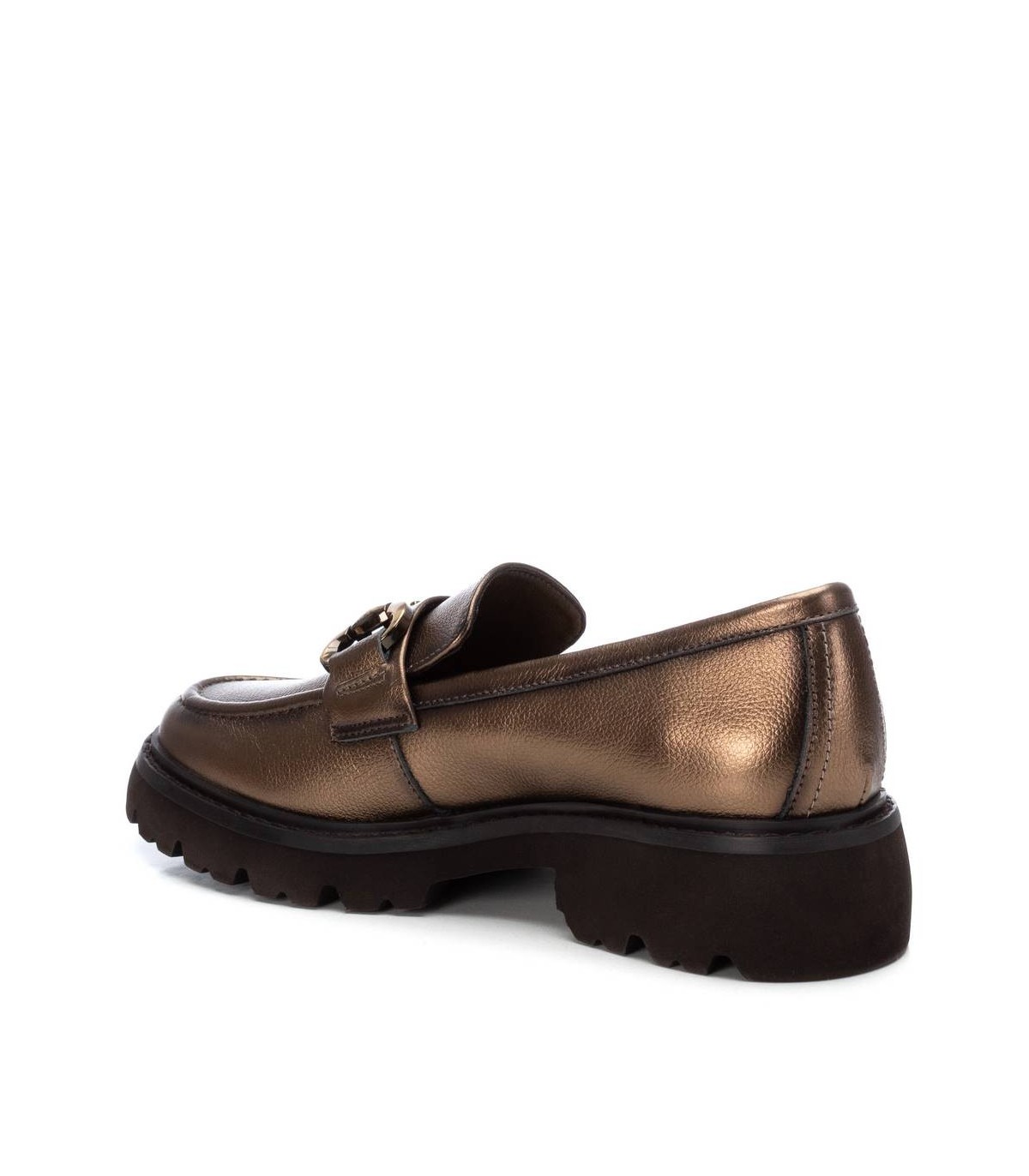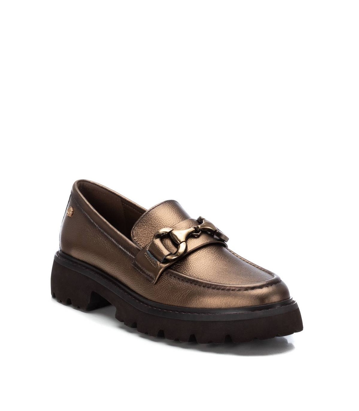 Mocasín de mujer, de la marca Carmela. Fabricado en piel de alta calidad. Antifaz en el frente con cadena decorativa. Suela volumen de goma antideslizante.
