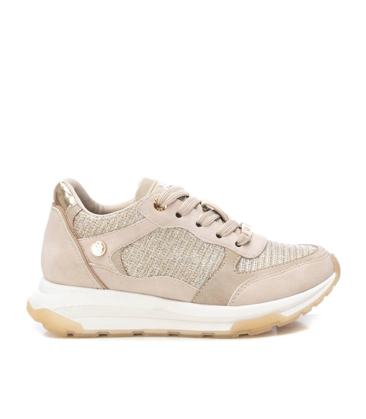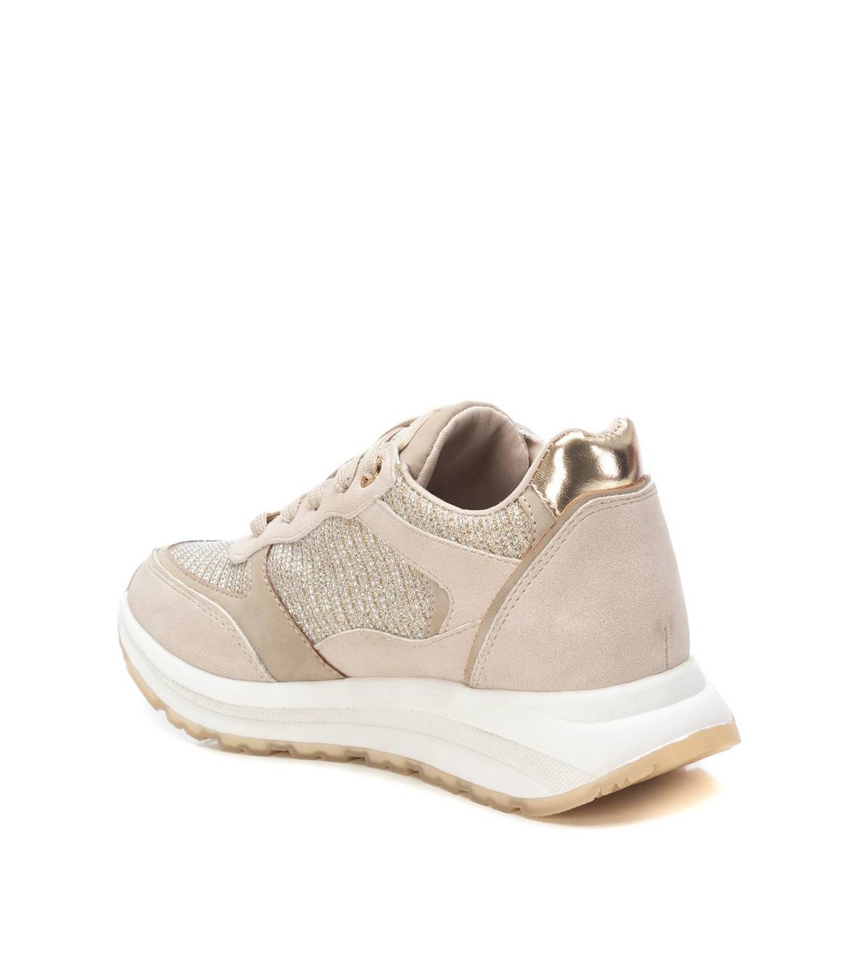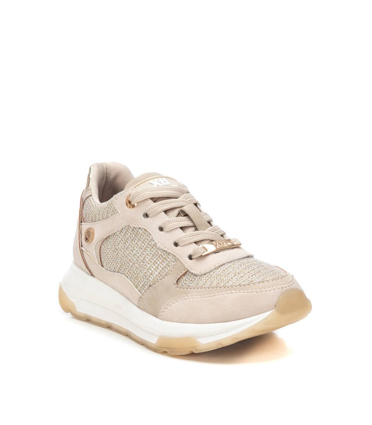 Zapatilla de niña, de la marca Xti Kids. Fabricada en material que imita a la piel combinada con tejido metalizado. Cierre mediante cordones regulables al tono. Gruesa suela de goma combinada antideslizante. Con plantilla extraíble. Este modelo ha obtenido el certificado vegano por la organización mundial PETA (Organización de los derechos de los animales).