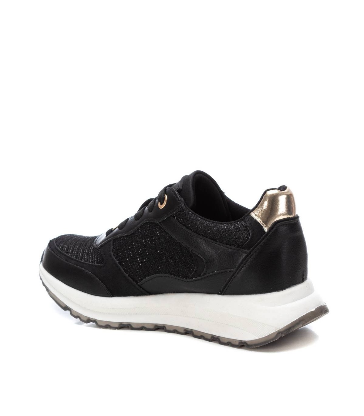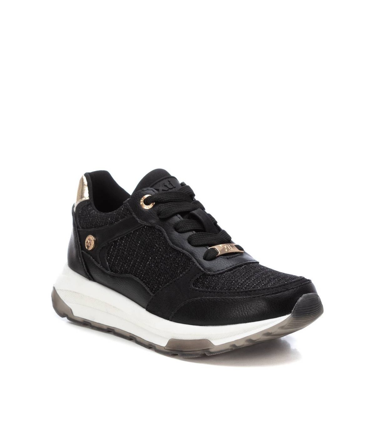 Zapatilla de niña, de la marca Xti Kids. Fabricada en material que imita a la piel combinada con tejido metalizado. Cierre mediante cordones regulables al tono. Gruesa suela de goma combinada antideslizante. Con plantilla extraíble. Este modelo ha obtenido el certificado vegano por la organización mundial PETA (Organización de los derechos de los animales).
