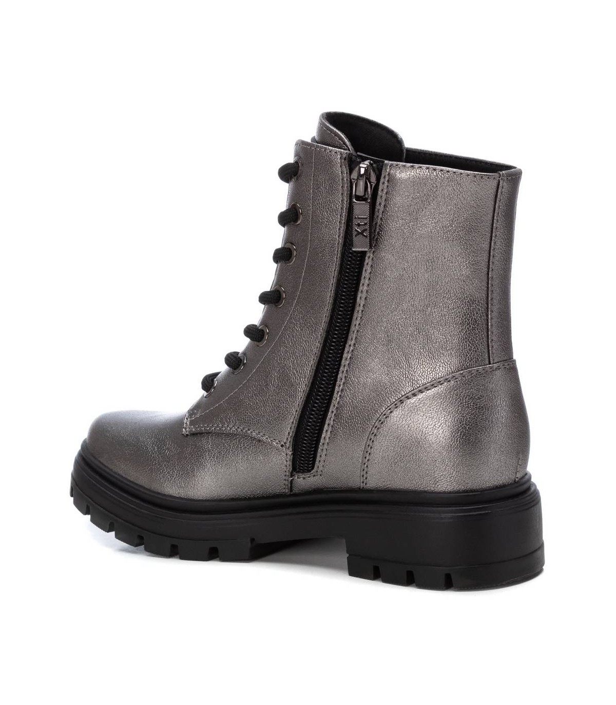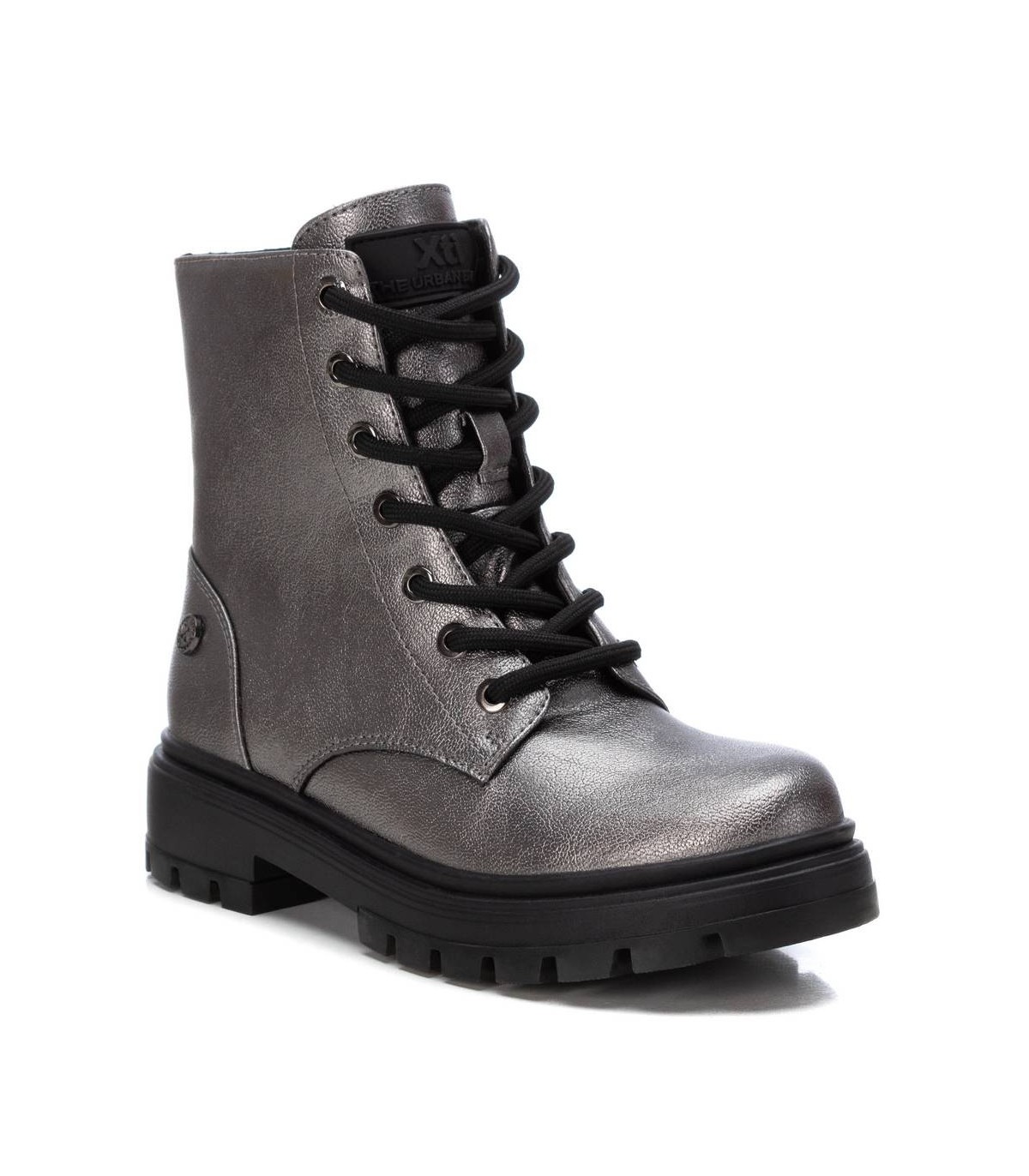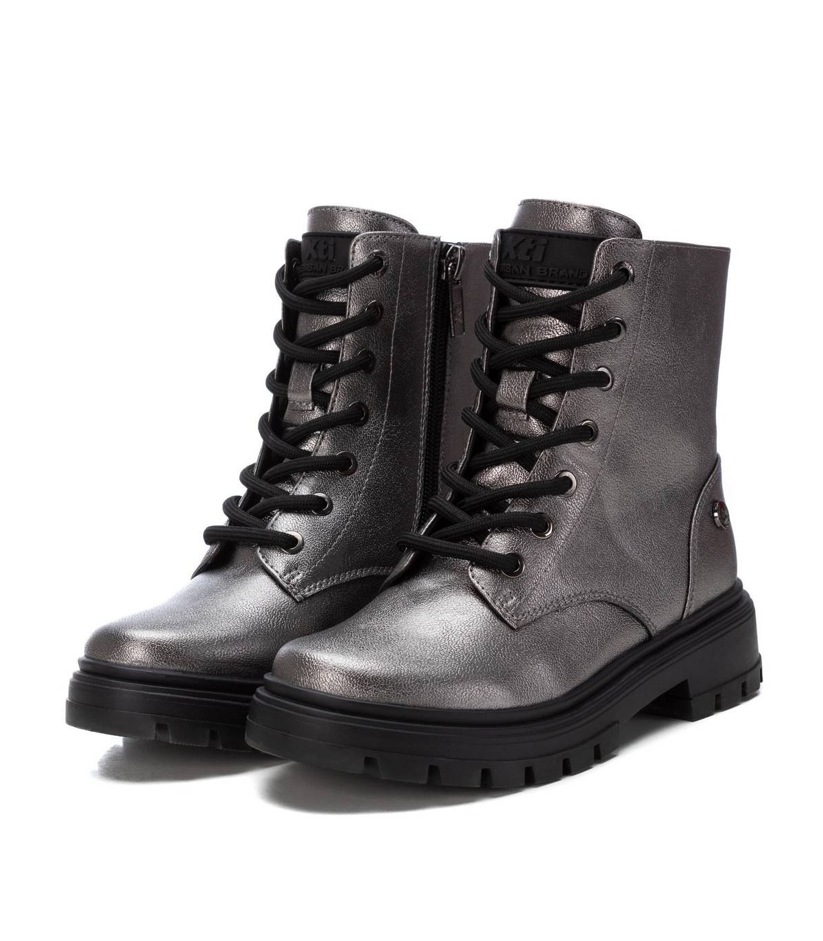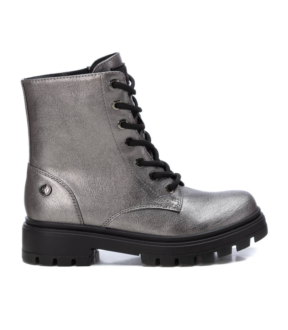 Botín de niña, de la marca Xti Kids. Fabricado en material metalizado que imita a la piel. Cordones negros regulables para un mejor ajuste. Cierre mediante cremallera interior. Gruesa suela de goma antideslizante. Este modelo ha obtenido el certificado vegano por la organización mundial PETA (Organización de los derechos de los animales).