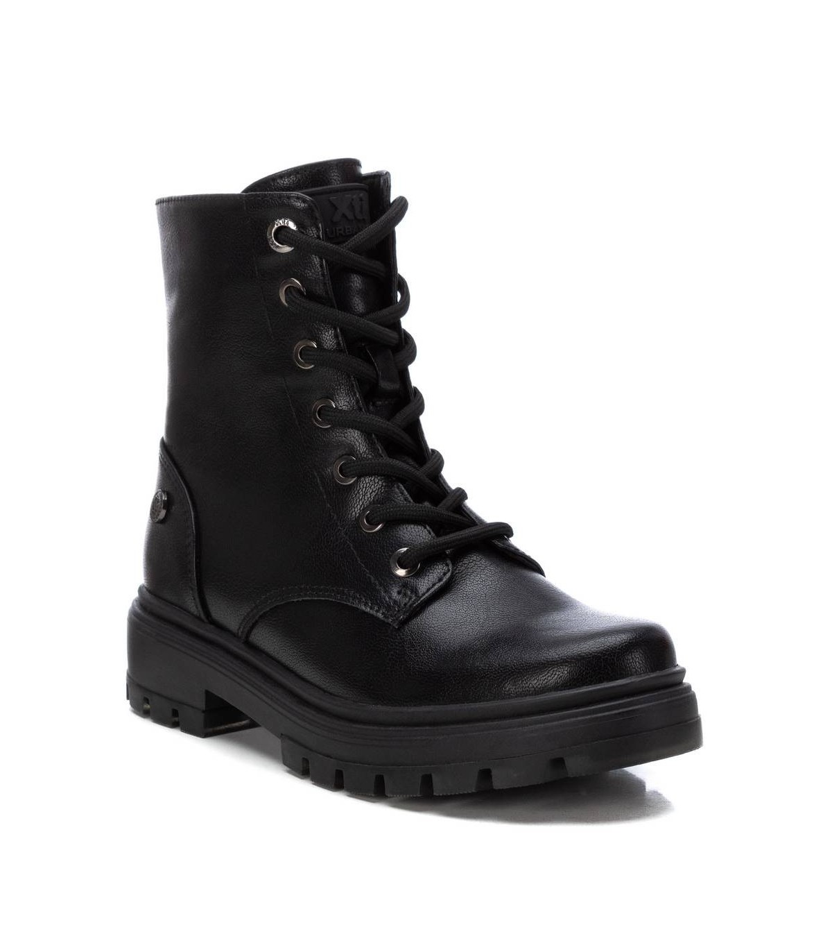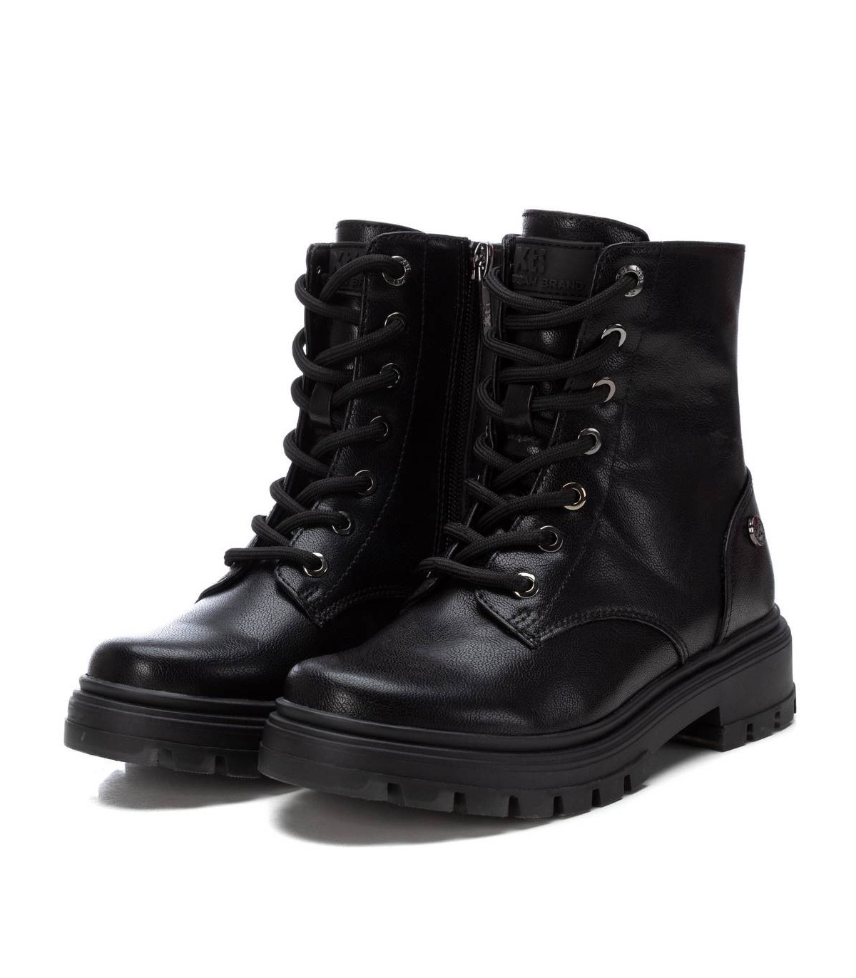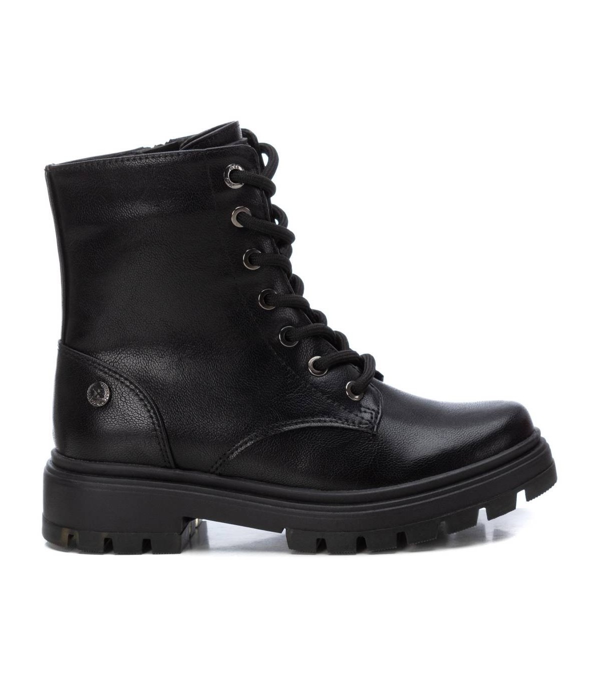 Botín de niña, de la marca Xti Kids. Fabricado en material metalizado que imita a la piel. Cordones negros regulables para un mejor ajuste. Cierre mediante cremallera interior. Gruesa suela de goma antideslizante. Este modelo ha obtenido el certificado vegano por la organización mundial PETA (Organización de los derechos de los animales).