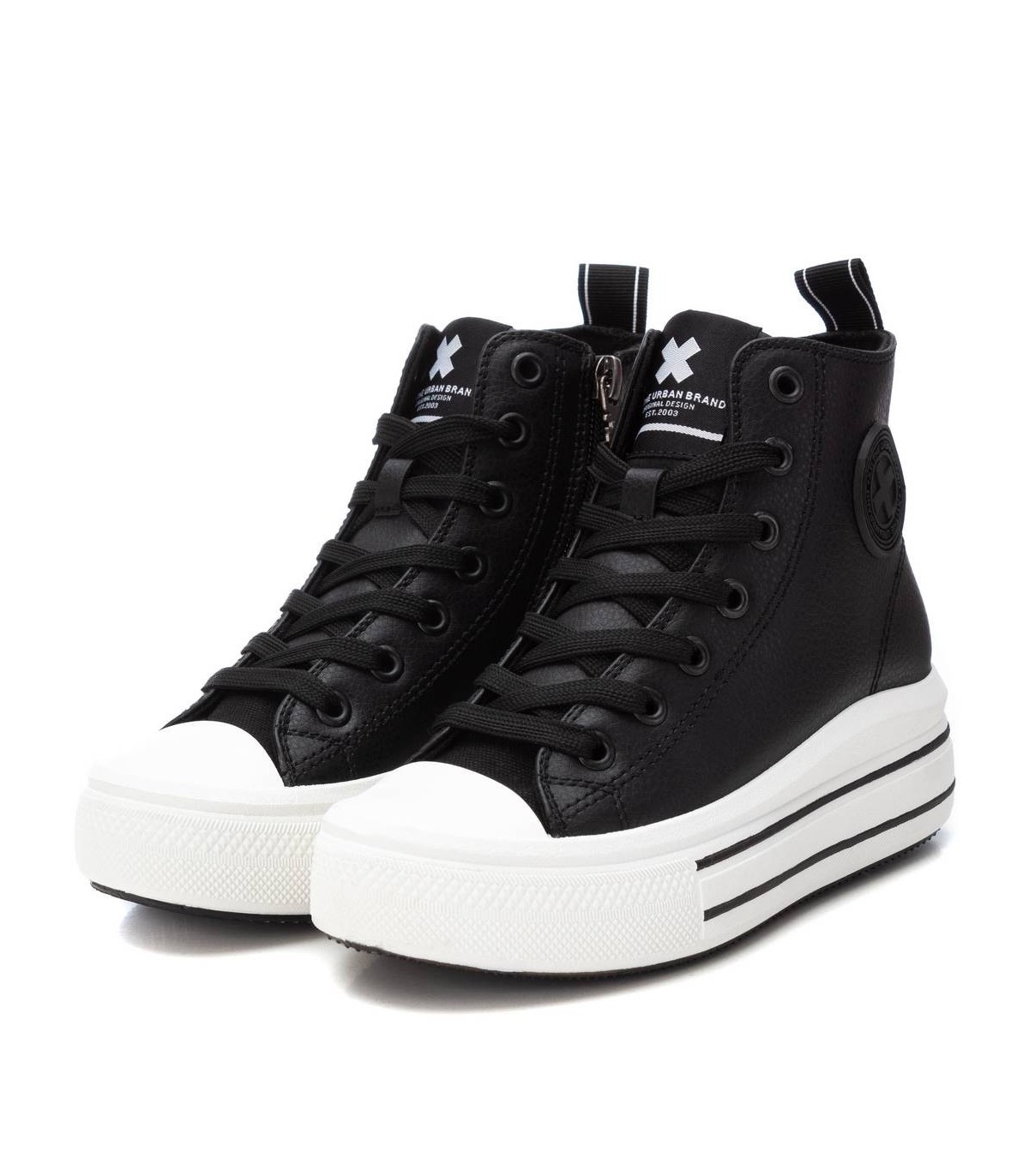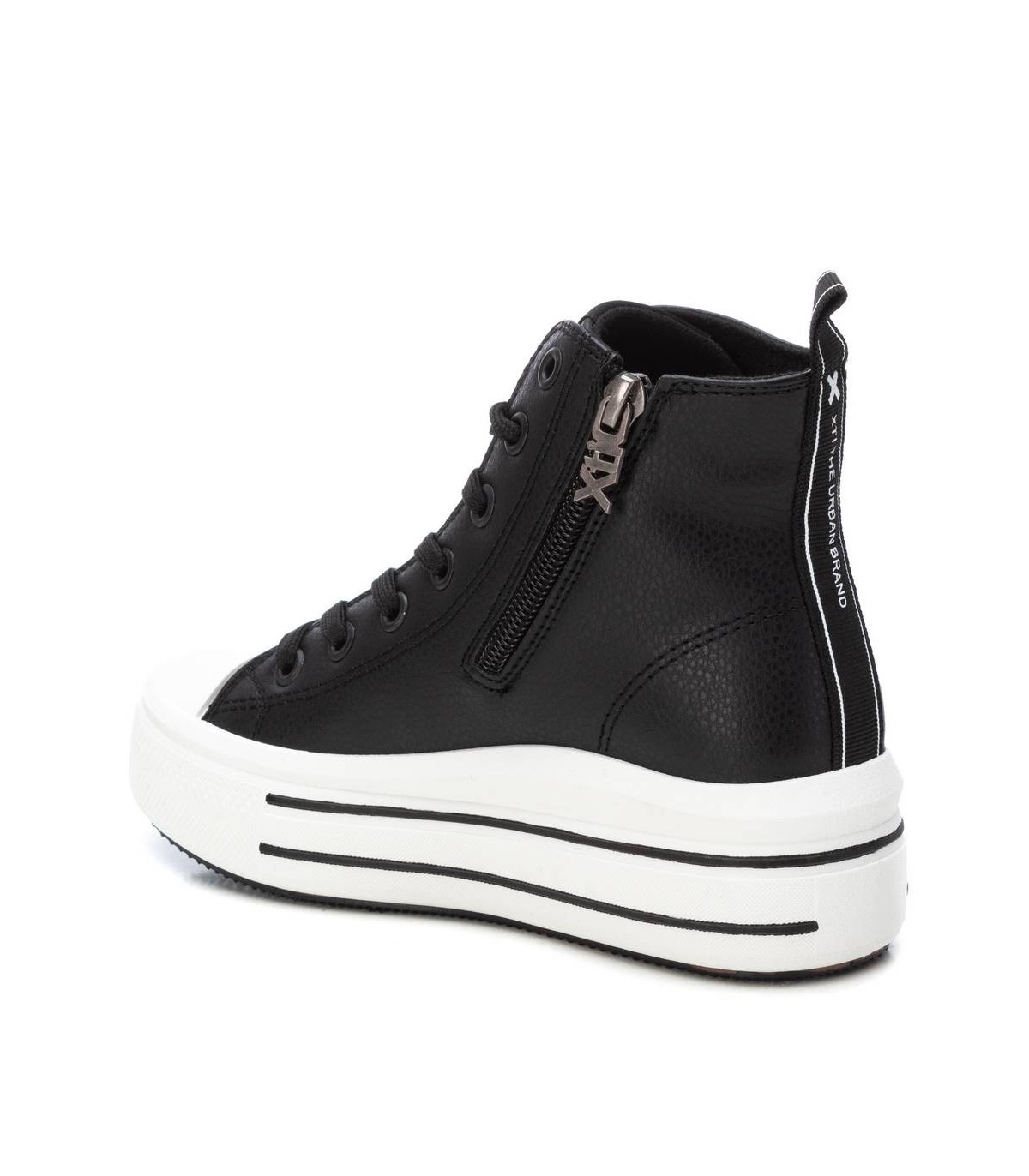 Botín de niña, de la marca Xti Kids. Fabricado en material que imita a la piel. Cierre mediante cremallera con cordones regulables. Botín de plataforma con suela de goma antideslizante. Este modelo ha obtenido el certificado vegano por la organización mundial PETA (Organización de los derechos de los animales).