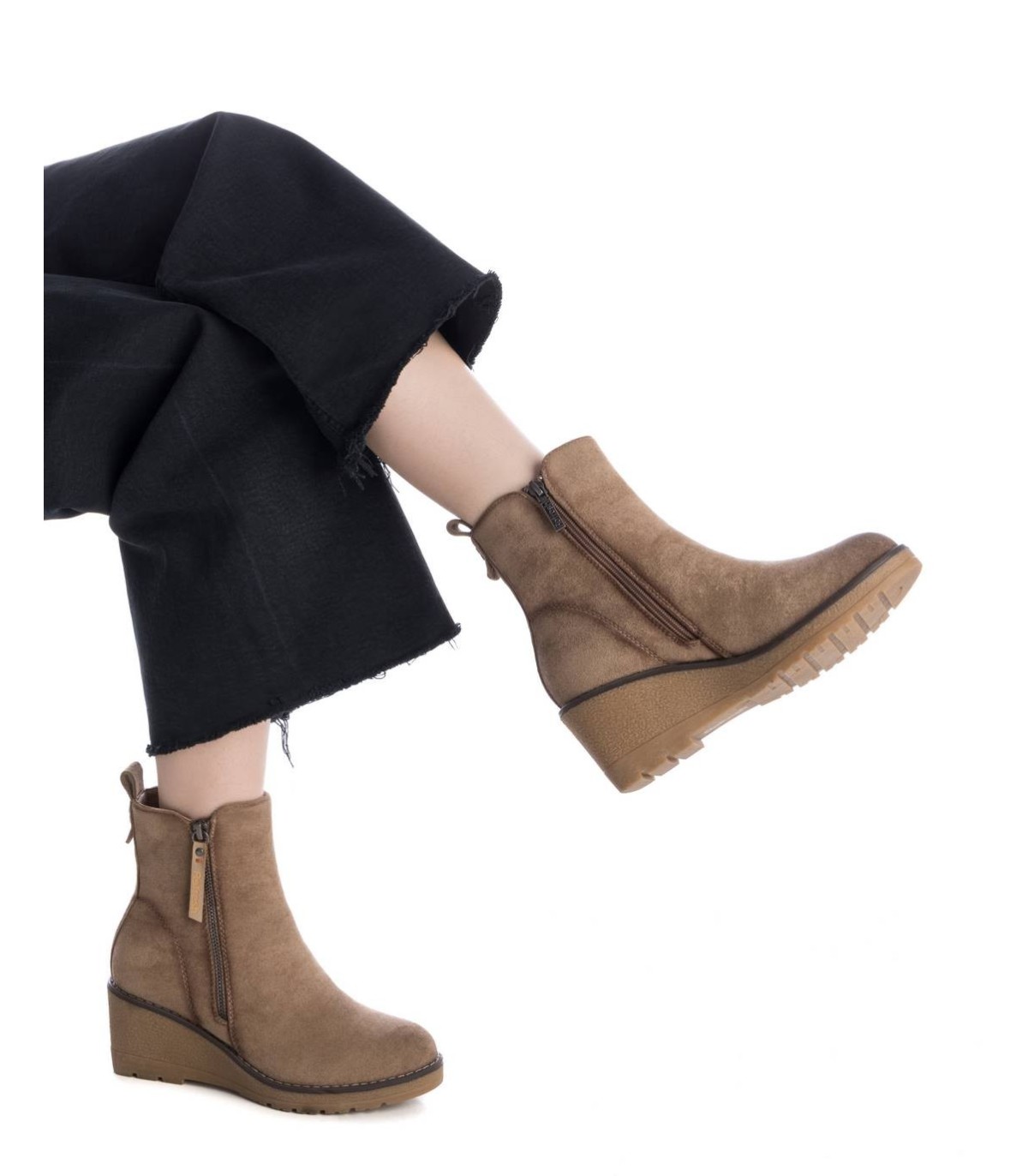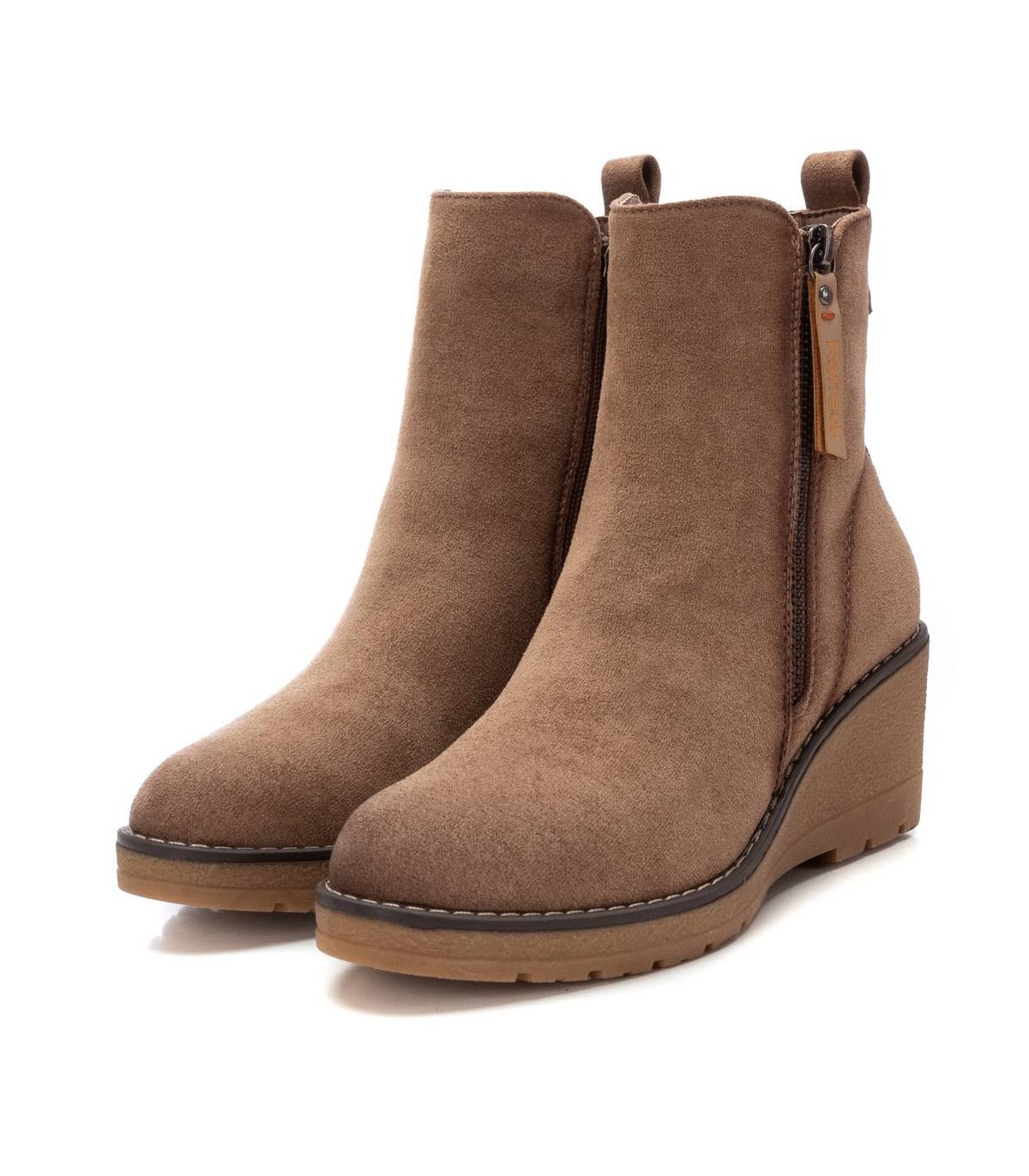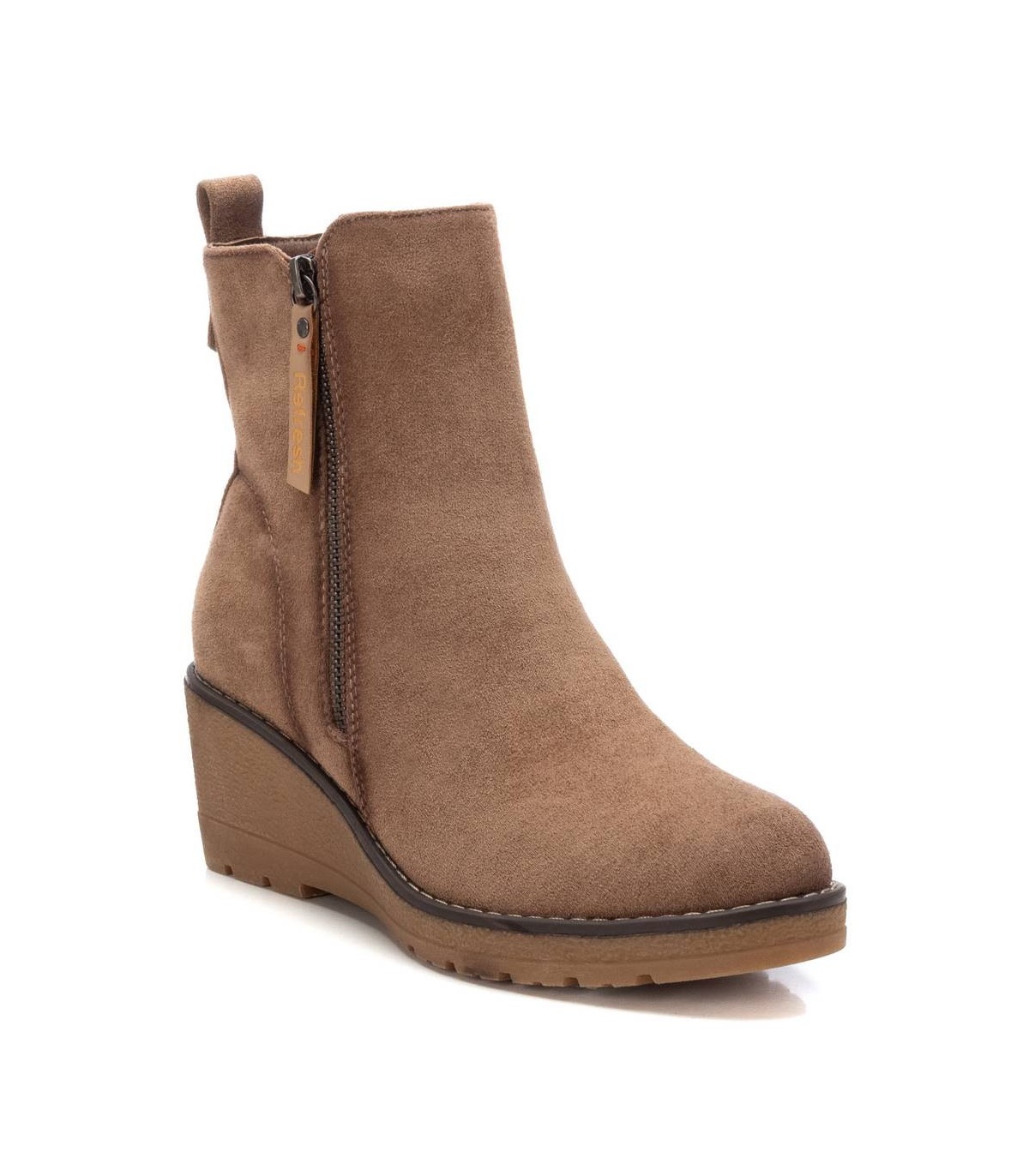 Botín de mujer, de la marca Refresh. Fabricado en antelina. Cierre mediante cremallera lateral. Tirador trasero para facilitar la puesta. Cremallera lateral decorativa. Cómoda cuña de 6 cm con suela de goma antideslizante. Este modelo ha obtenido el certificado vegano por la organización mundial PETA (Organización de los derechos de los animales).