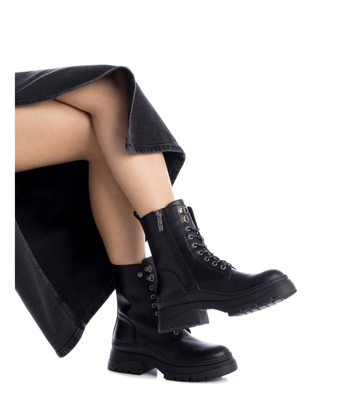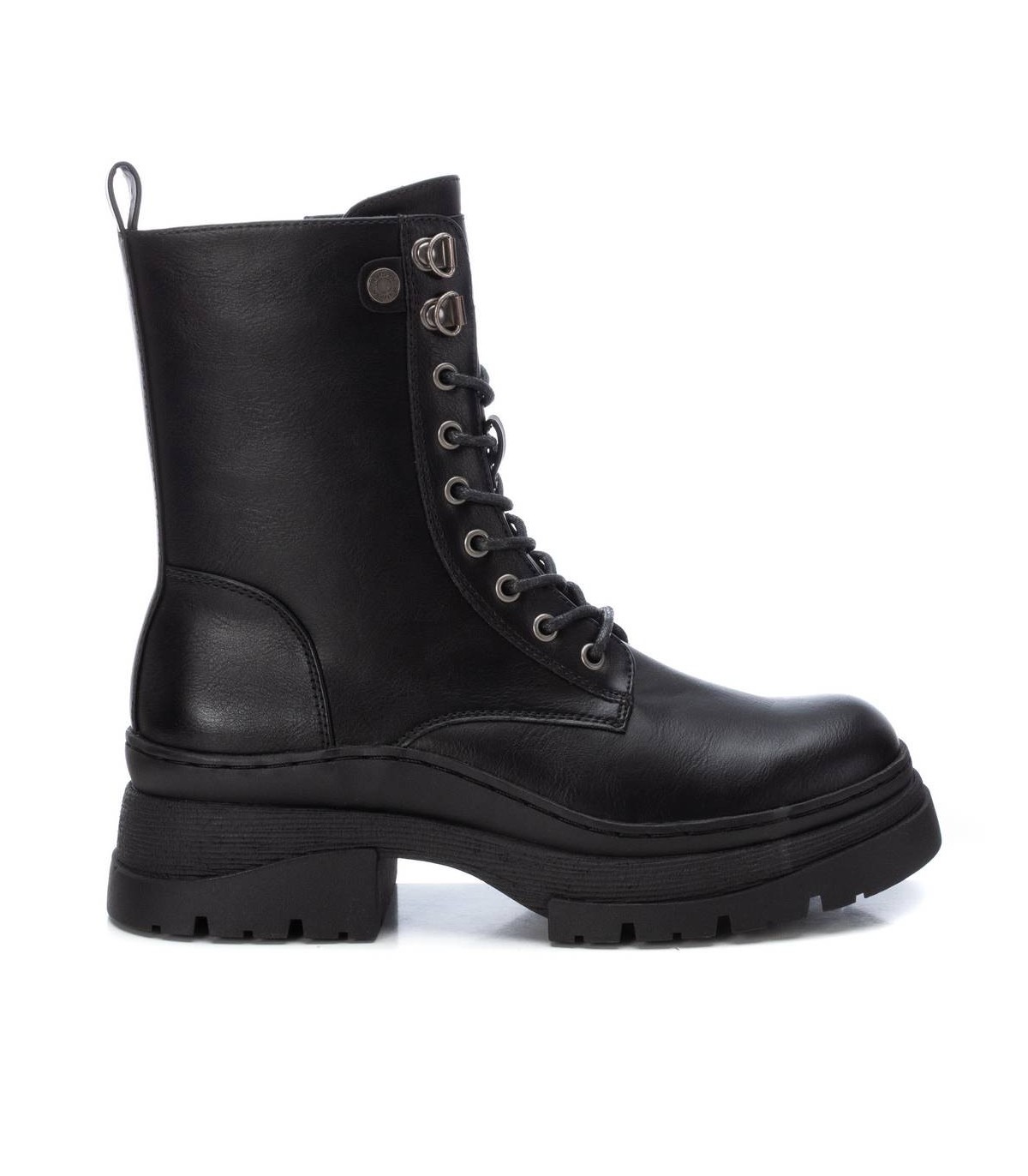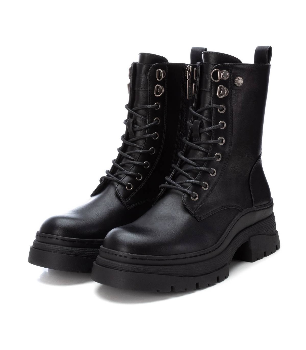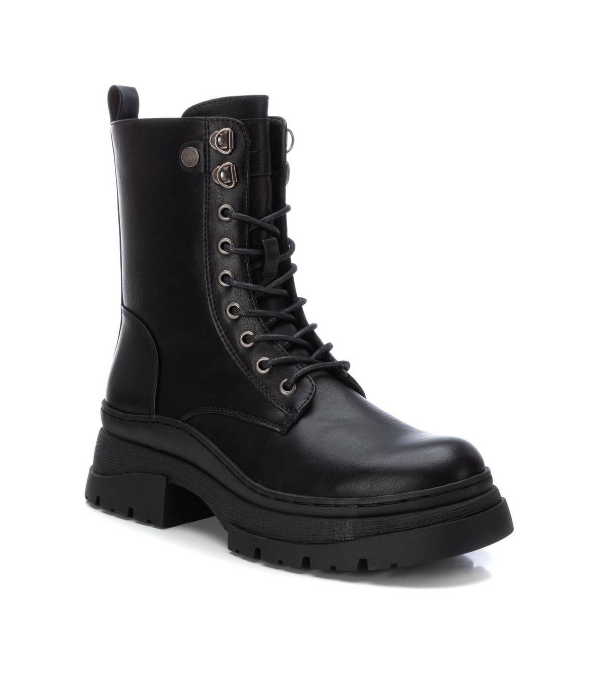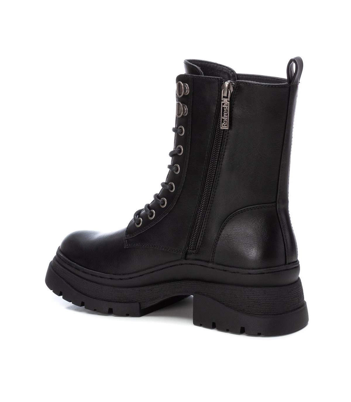 Botín de mujer, de la marca Refresh. Fabricado en un material que imita la piel. Cierre cremallera lateral y cordones ajustables. Tirador trasero para facilitar su puesta. Suela volumen antideslizante. Este modelo ha obtenido el certificado vegano por la organización mundial PETA (Organización de los derechos de los animales).